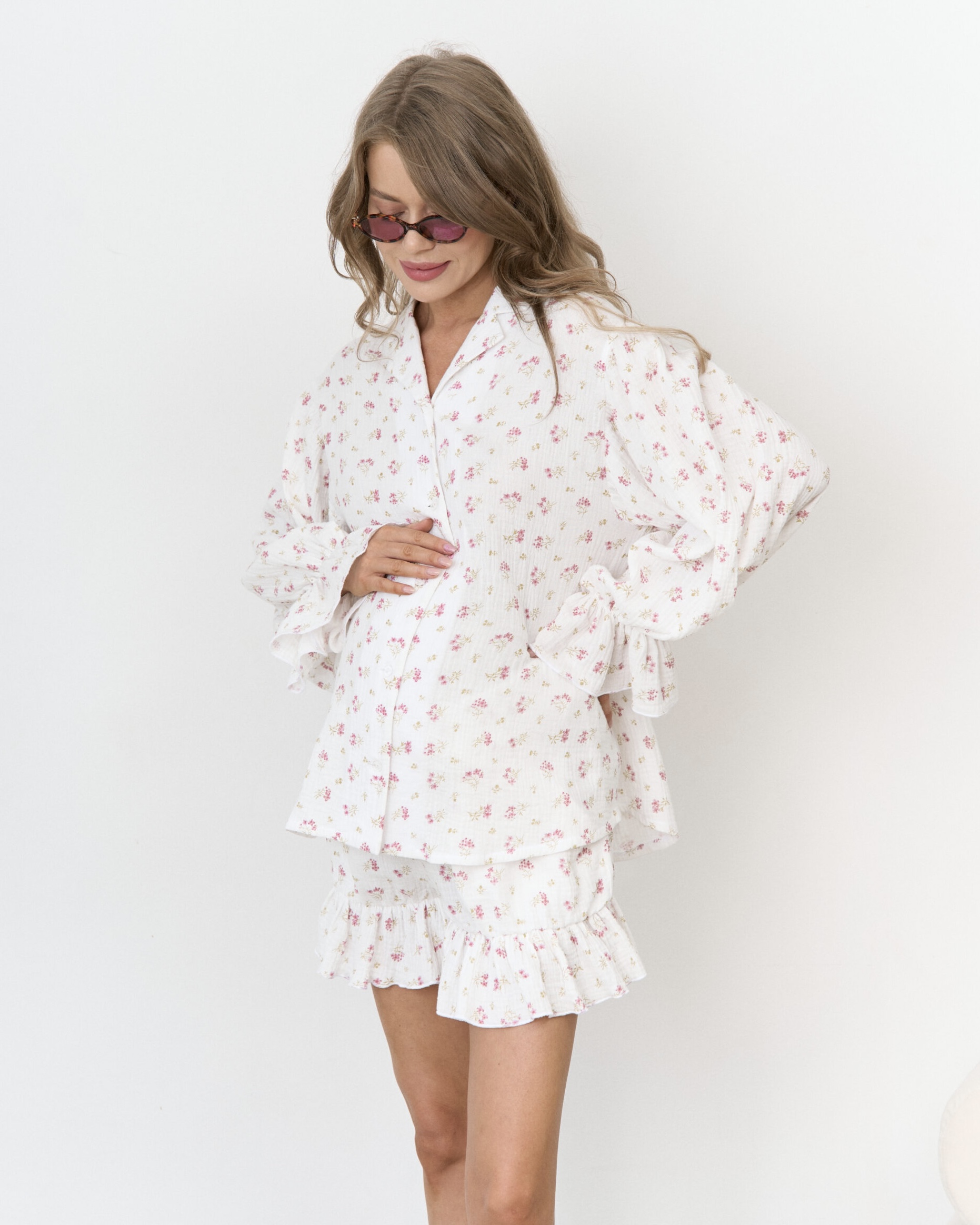 Стильный костюм с шортами в длине мини и свободной рубашкой, выполненный в романтичном стиле. Идеально для жаркого лета и отпуска. Подойдет на весь период беременности и после.