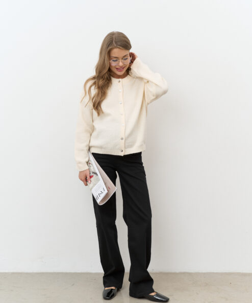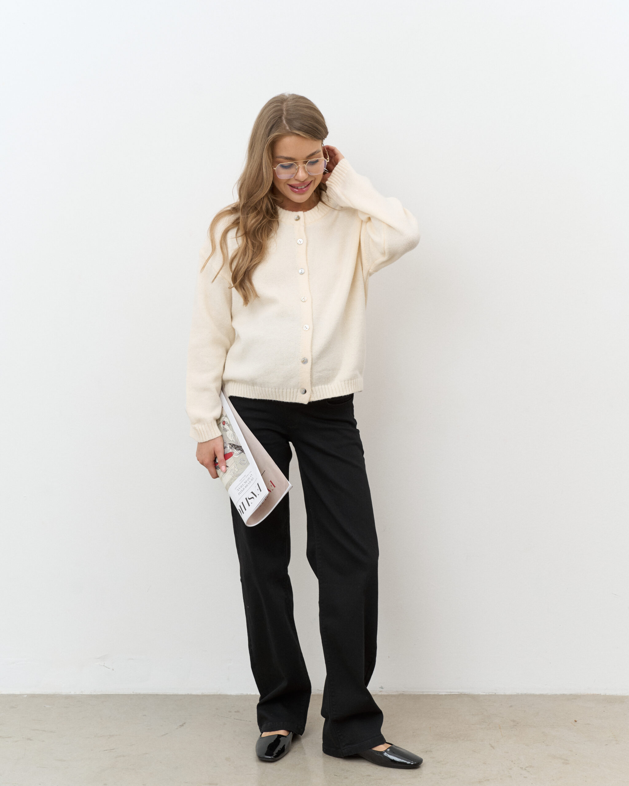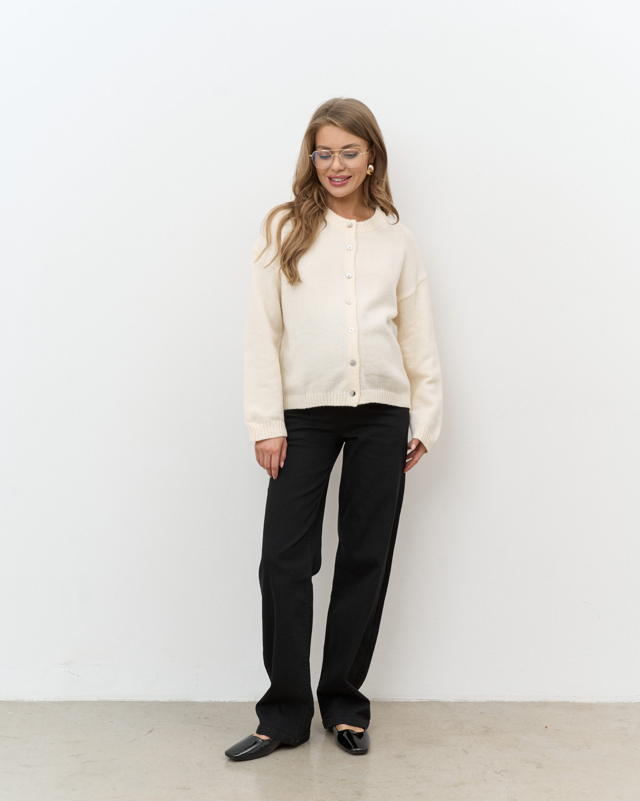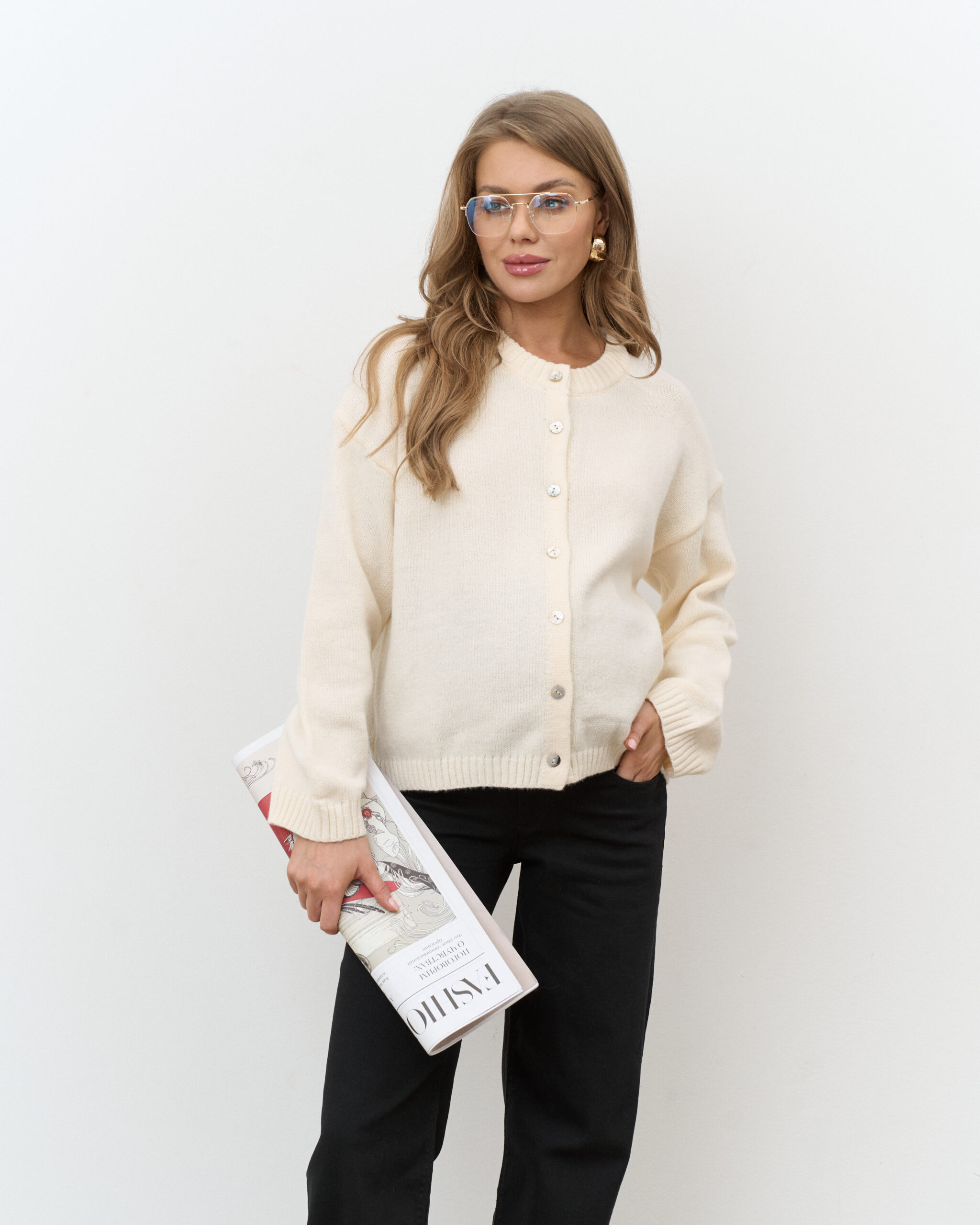 Базовый кардиган свободного кроя на пуговицах. Прекрасно подойдет в качестве второго слоя или как отдельный элемент одежды.