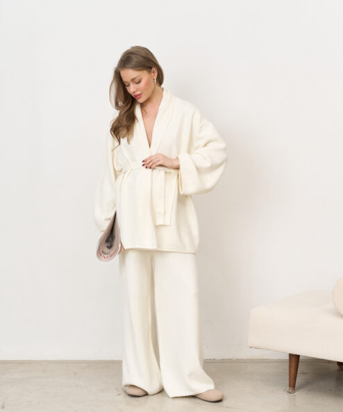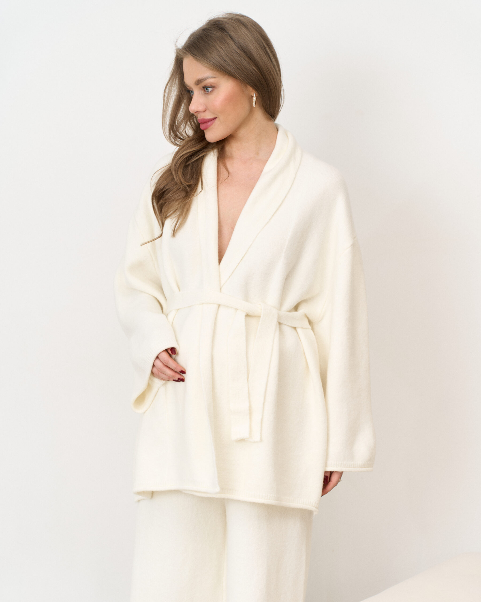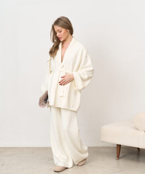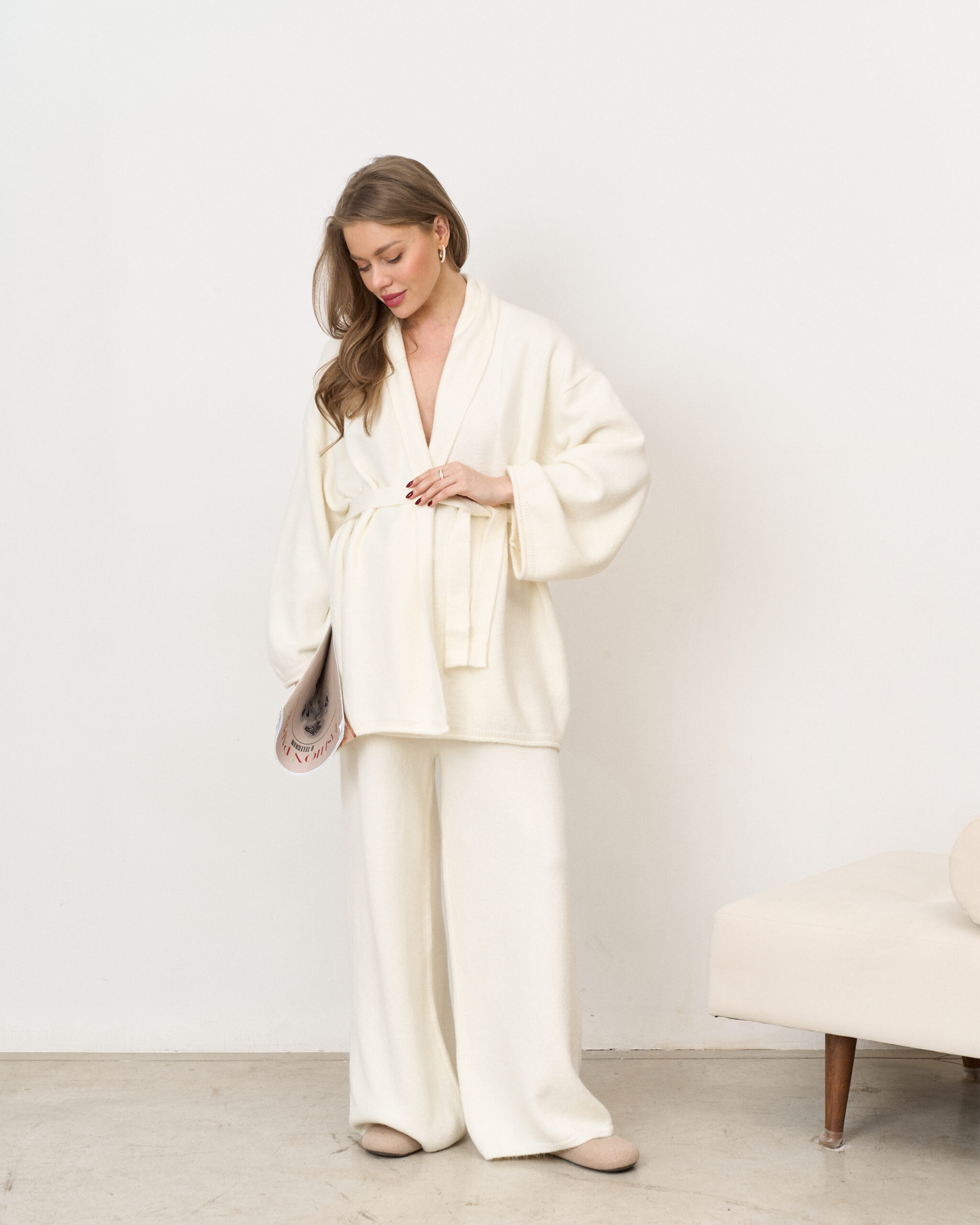 Стильный трикотажный костюм, состоящий из брюк свободного кроя и кардигана-кимоно. Модный фасон стройнит и визуально вытягивает фигуру. Подойдет на весь период беременности и после.