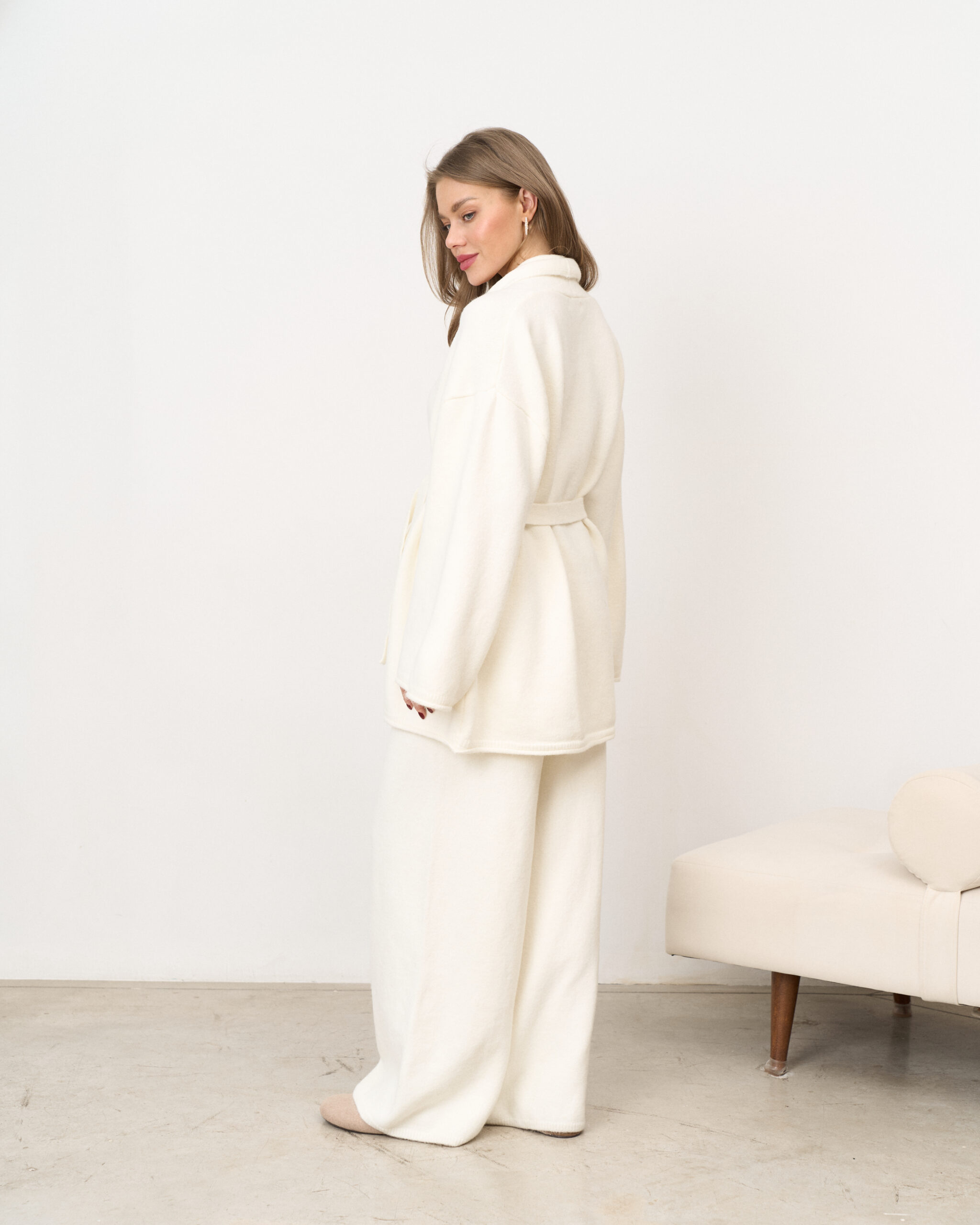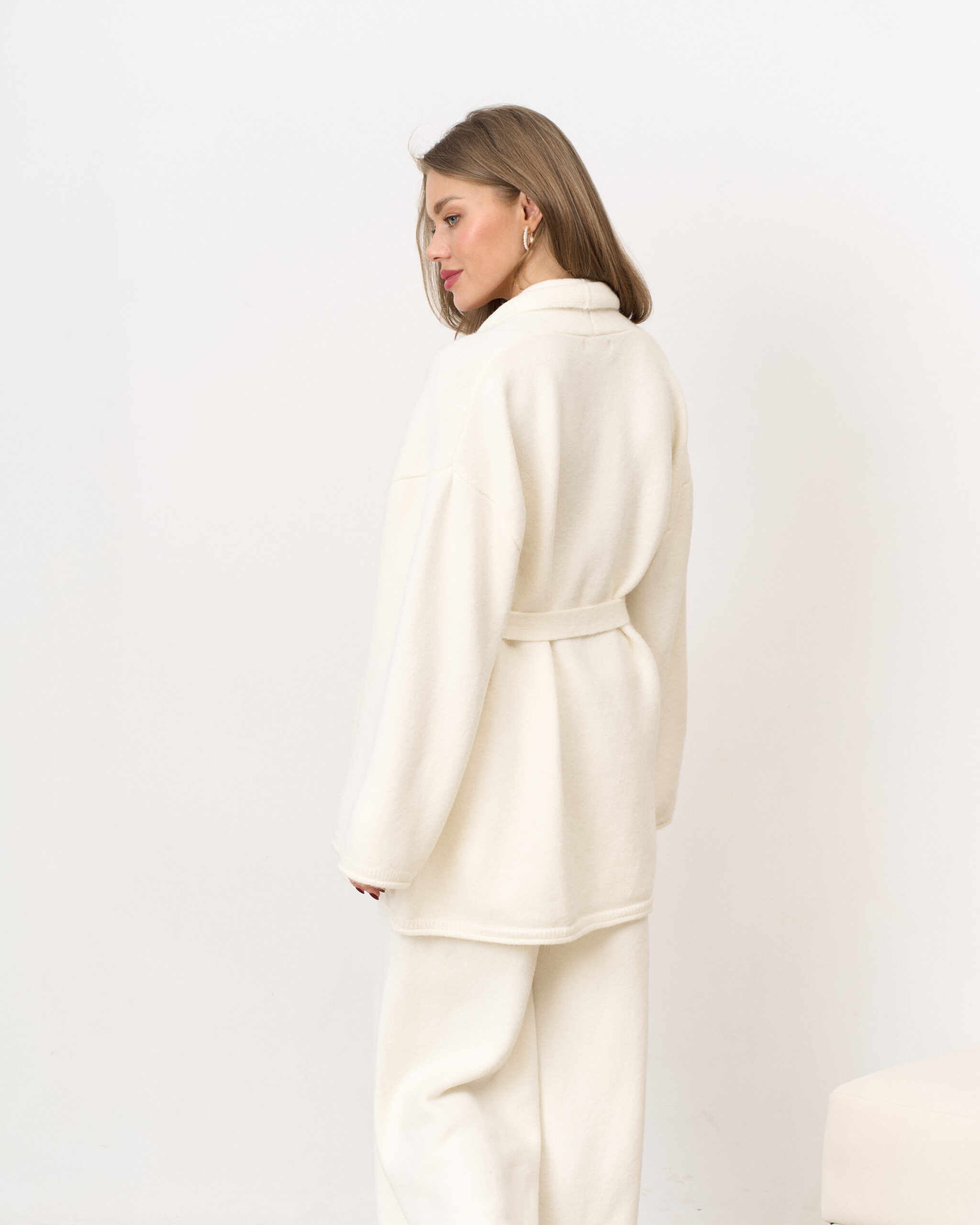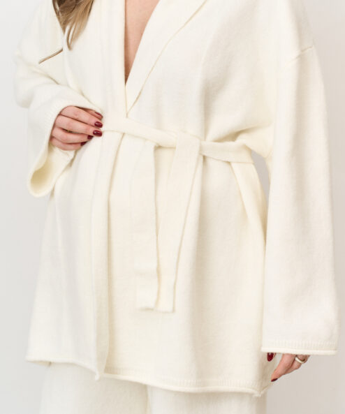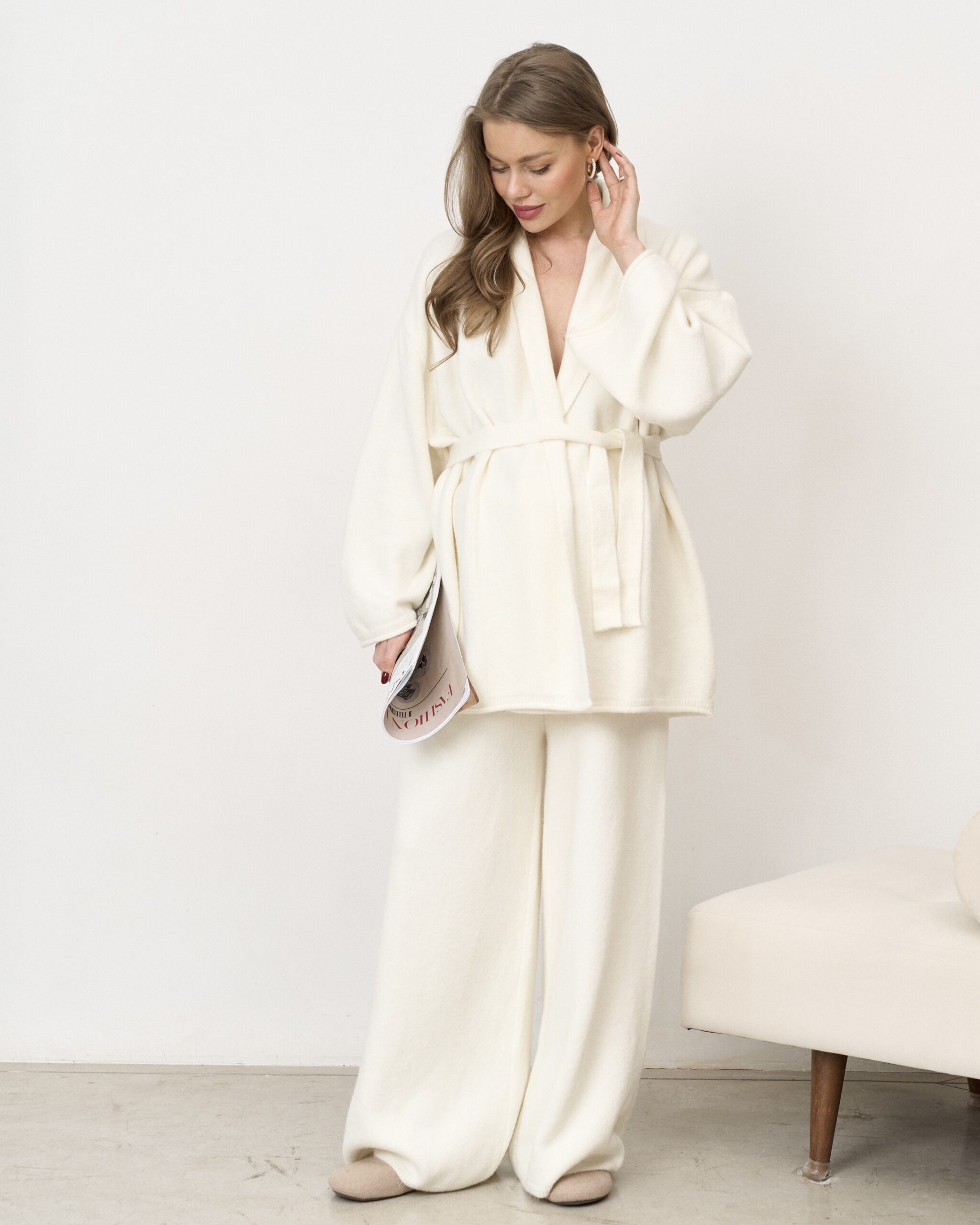 Стильный трикотажный костюм, состоящий из брюк свободного кроя и кардигана-кимоно. Модный фасон стройнит и визуально вытягивает фигуру. Подойдет на весь период беременности и после.