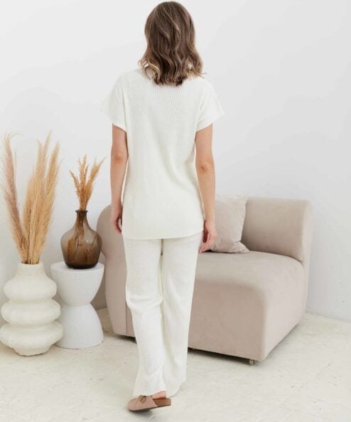 Стильный трикотажный костюм с брюками прямого кроя и топа. Модный фасон стройнит и визуально вытягивает фигуру.