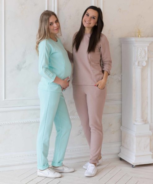 Оригинальный и невероятно стильный костюм для беременных и кормящих в стиле «повседневный шик». Пояс брюк — эластичный, спереди занижен, можно носить на любом сроке беременности и после. В потайных молниях свитшота в нагрудных рельефах спрятан секрет для кормления.