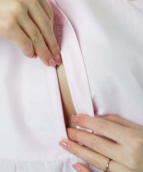Супертрендовая блузка для кормления из хлопка в розовом цвете. Модный свободный фасон не будет стягивать растущий животик. А  незаметные потайные молнии в рельефах на груди позволят вам носить ее и в период ГВ.