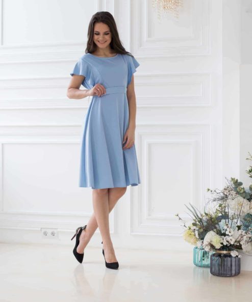 Нарядное платье из трикотажа джерси с рукавами-крылышками. Завышенная талия и юбка-полусолнце скроют ваш животик во время беременности, а после рождения малыша весьма кстати окажется секрет для кормления — потайные молнии в рельефах. Элегантный силуэт, V-образный вырез на спинке и пояс-кушак создают утонченный, классический образ. Прекрасно подойдет для торжеств или для росписи.