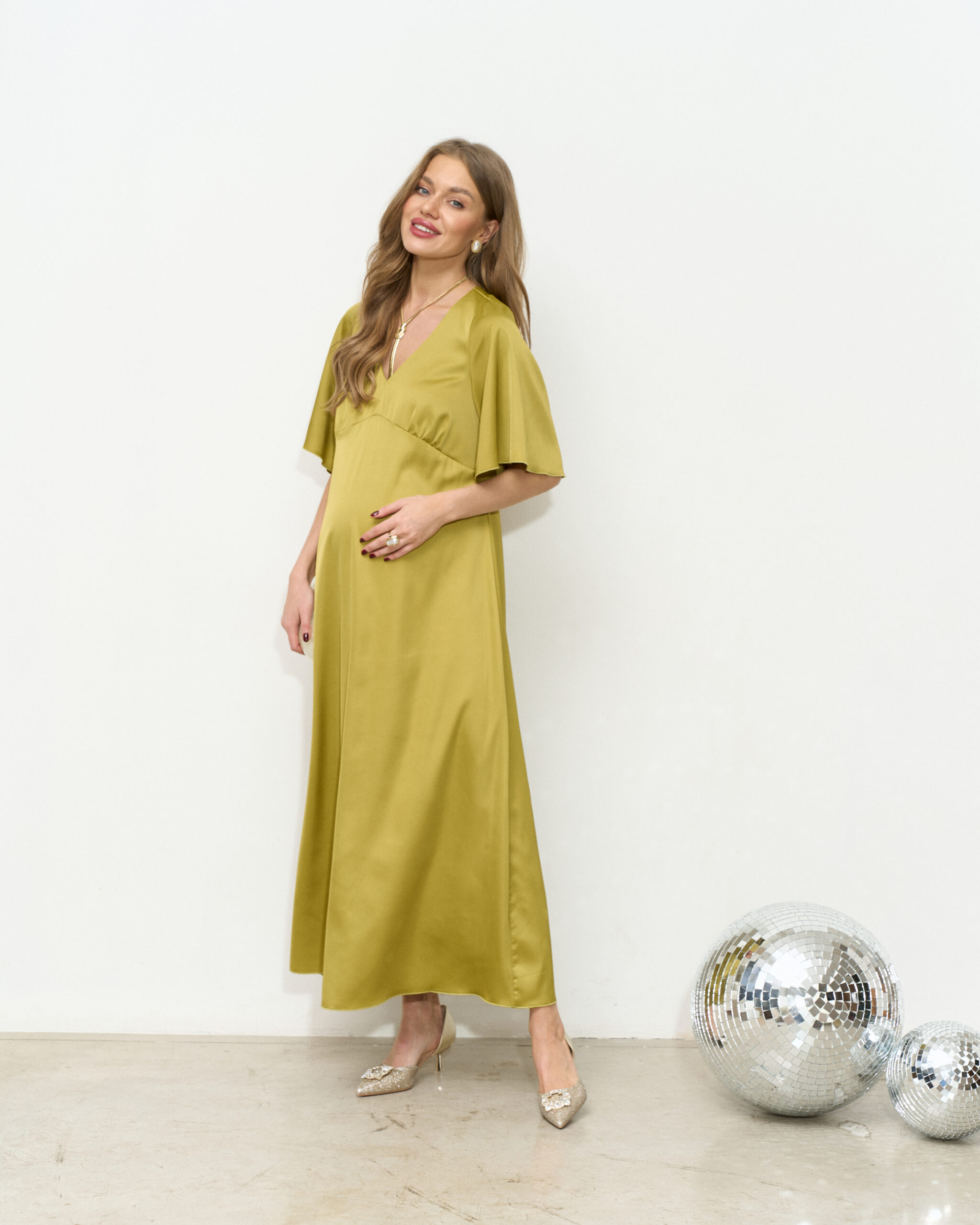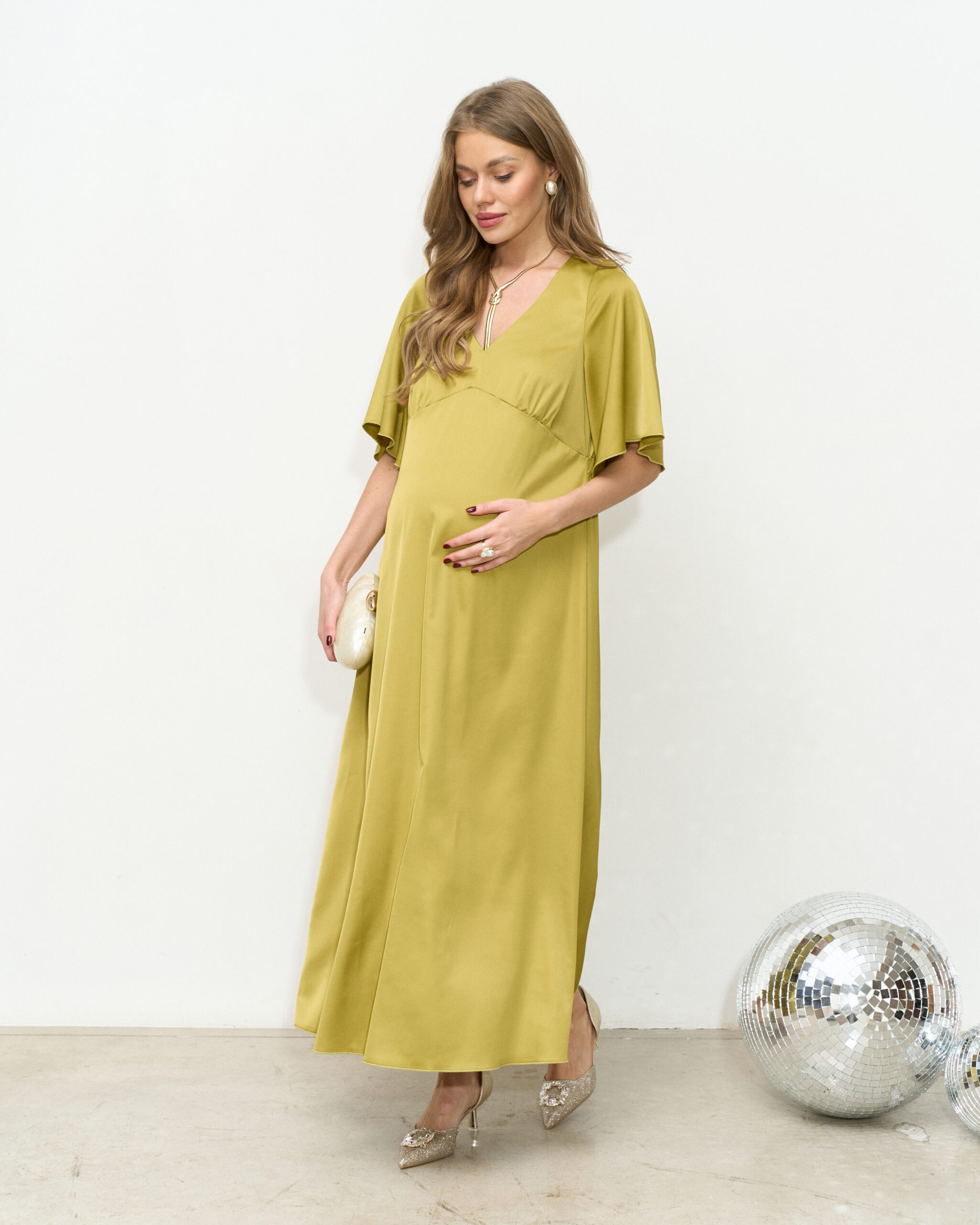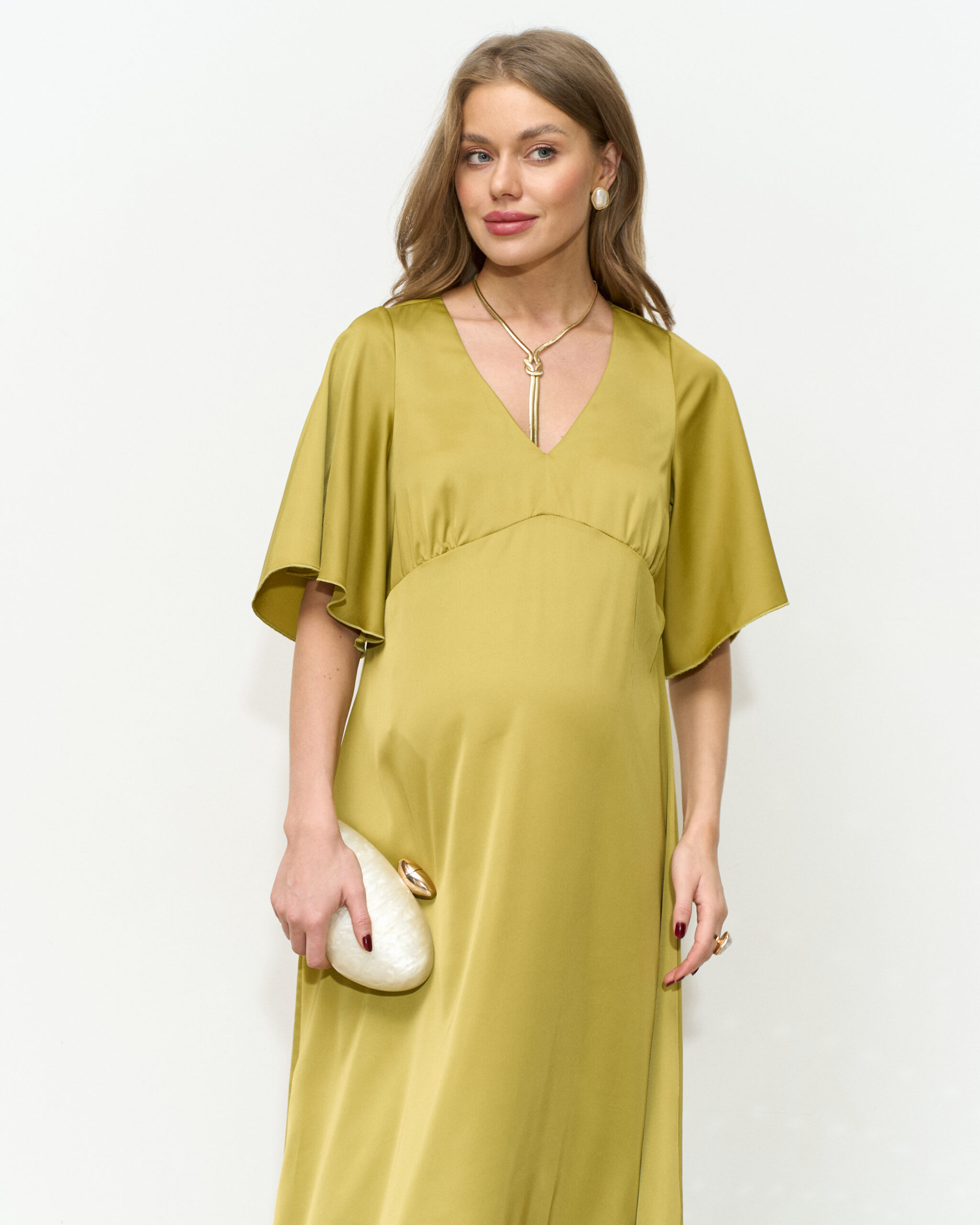 Нежное платье для будущих мам из тонкого вискозного атласа. Женственная длина макси, V-вырез и струящиеся рукава создают элегантный и неповторимый образ. Платье отлично подойдет для торжественных мероприятий и фотосессий. В таком платье вы будете чувствовать себя утонченно и изысканно на любом сроке беременности и после.