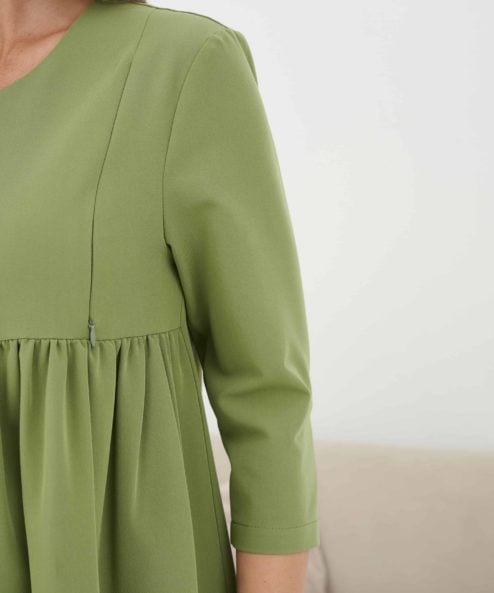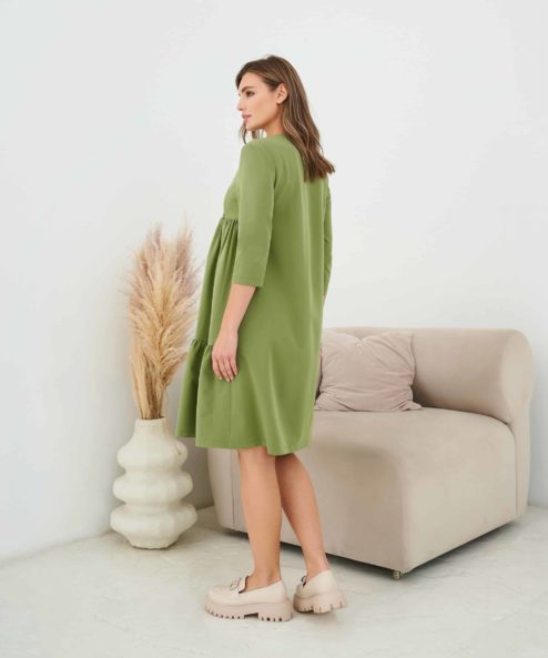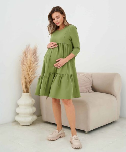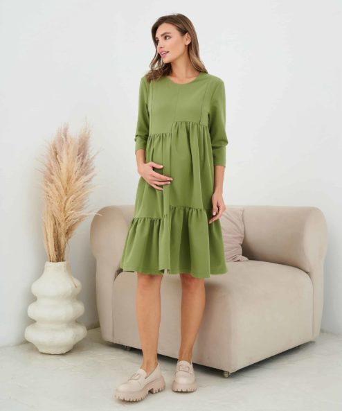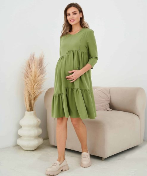 Стильное и необычное ярусное платье из костюмной ткани. Подходит на любой срок беременности и после. Секрет для кормления — незаметные молнии.