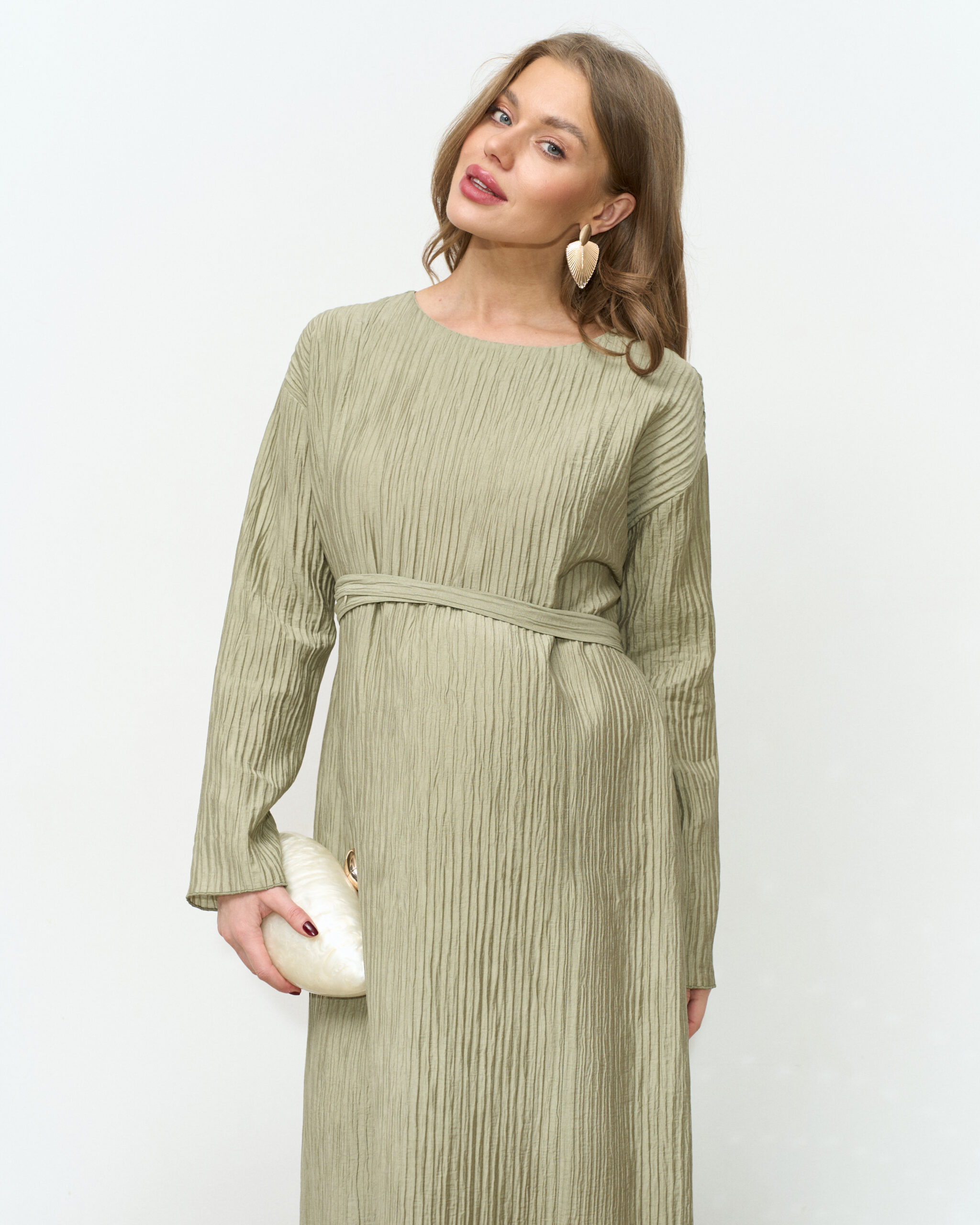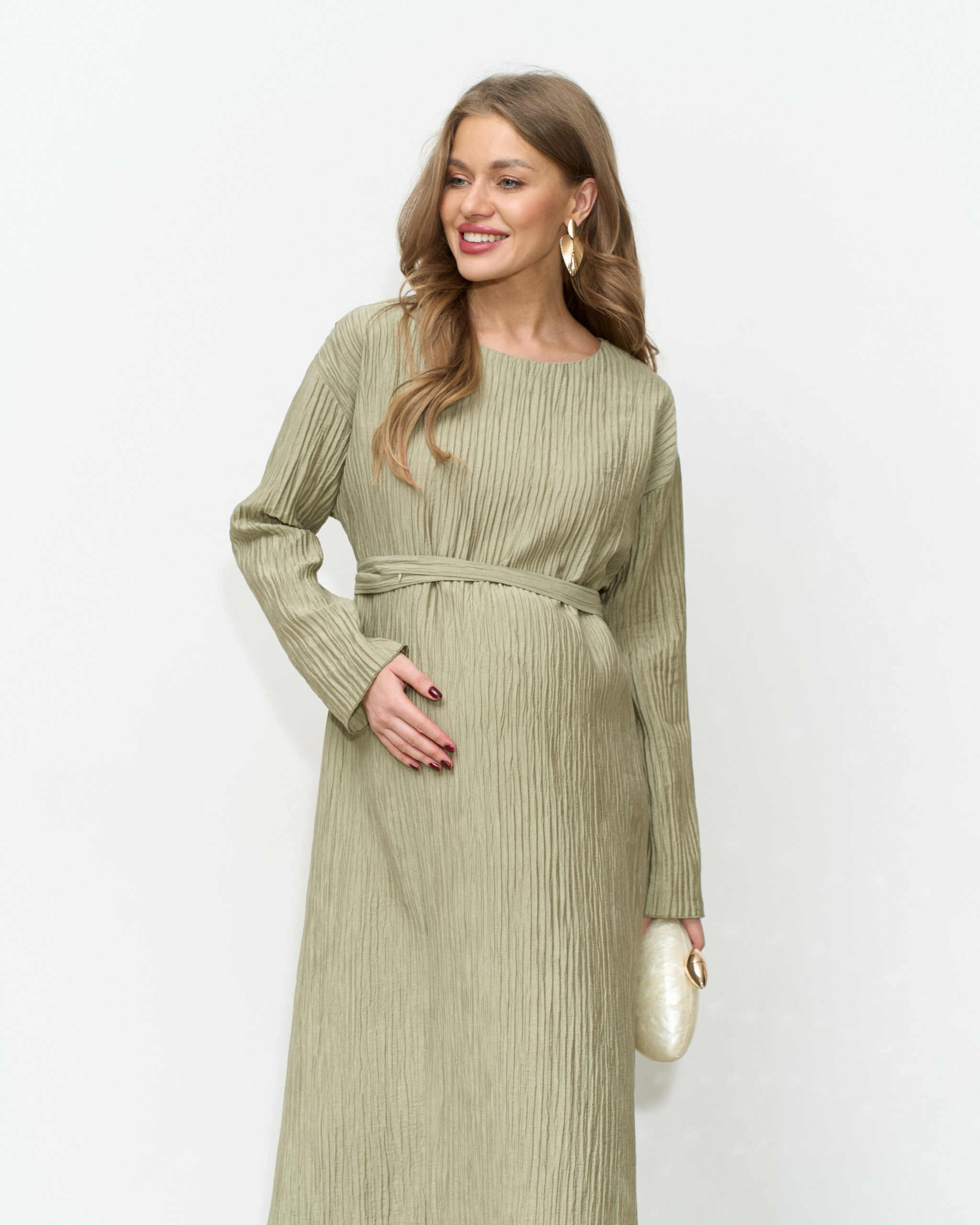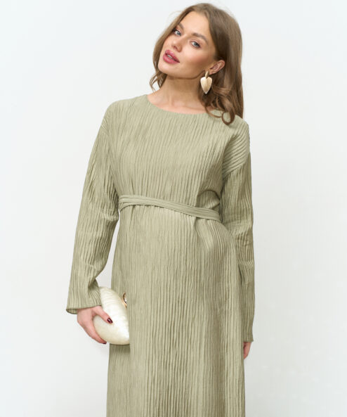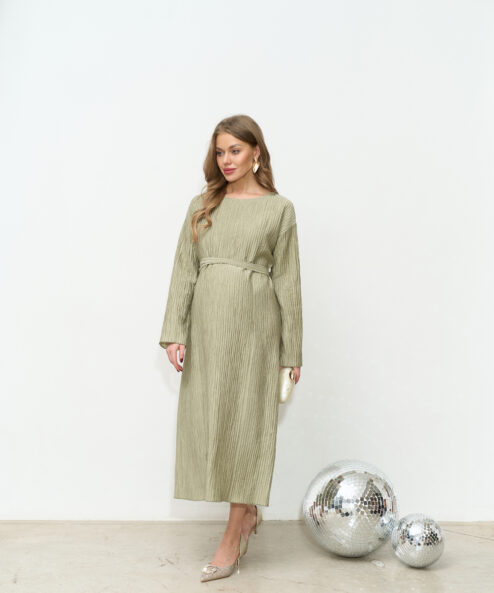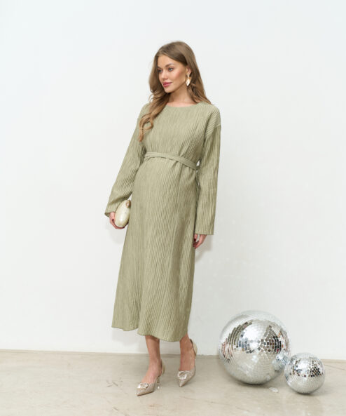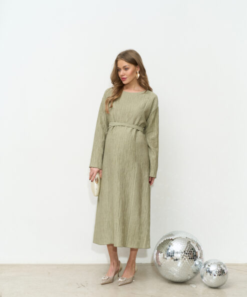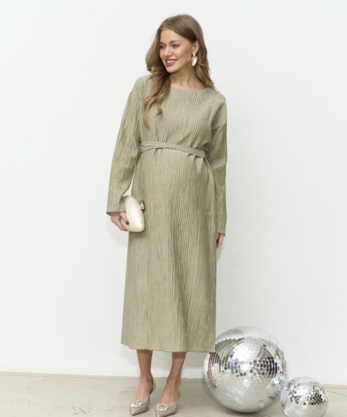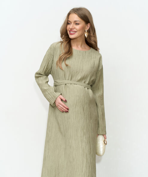 Праздничное платье в длине миди из трендовой ткани-гофре. Специальный крой и молнии для кормления позволят носить его всю беременность и после. Пояс в комплекте.