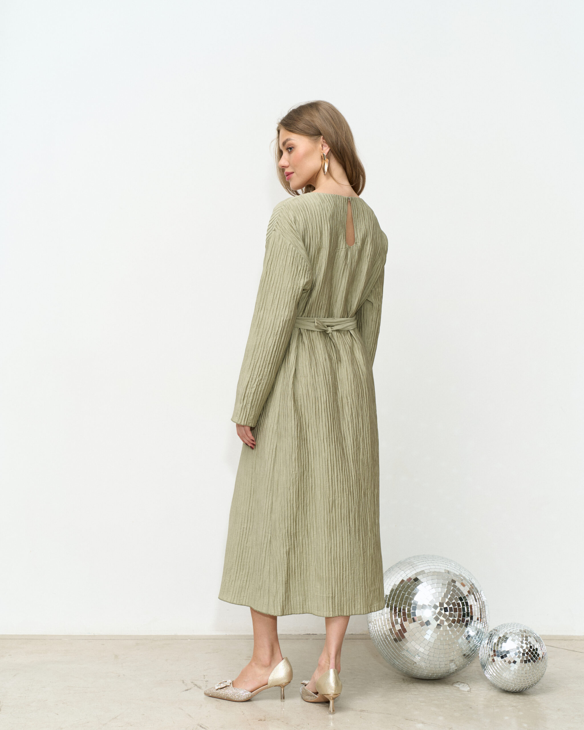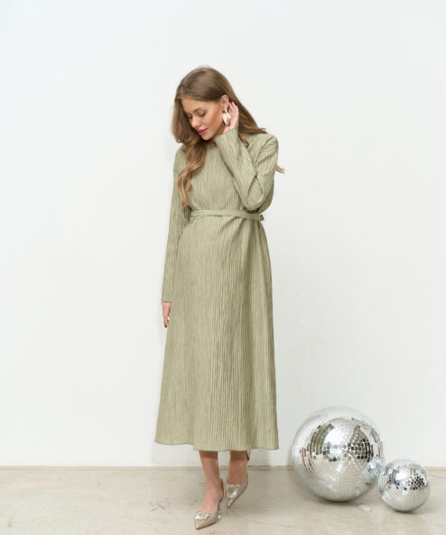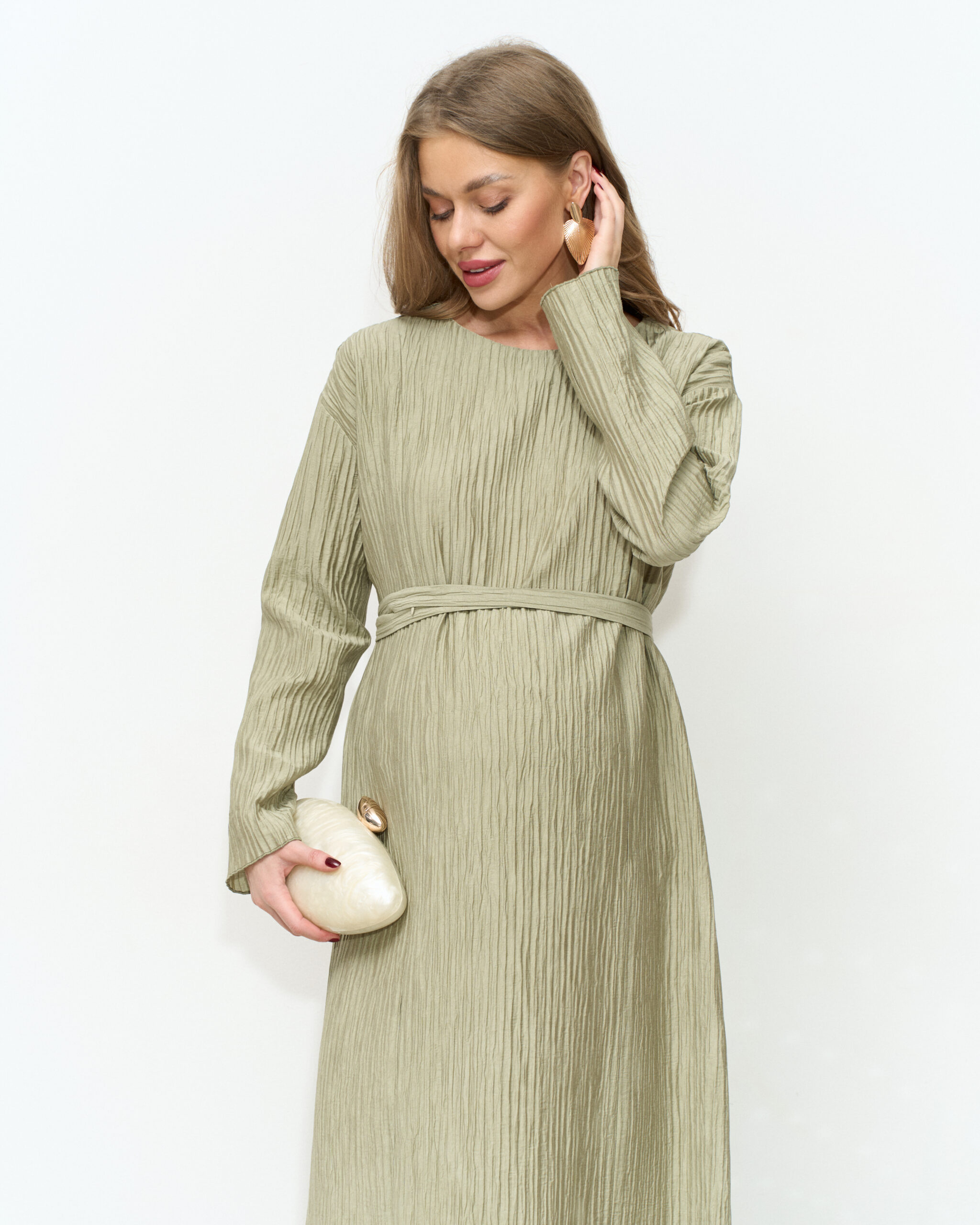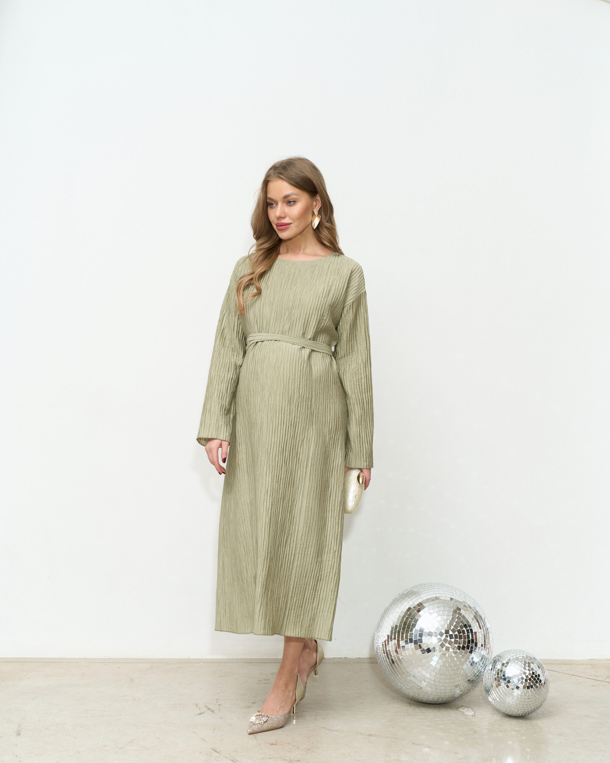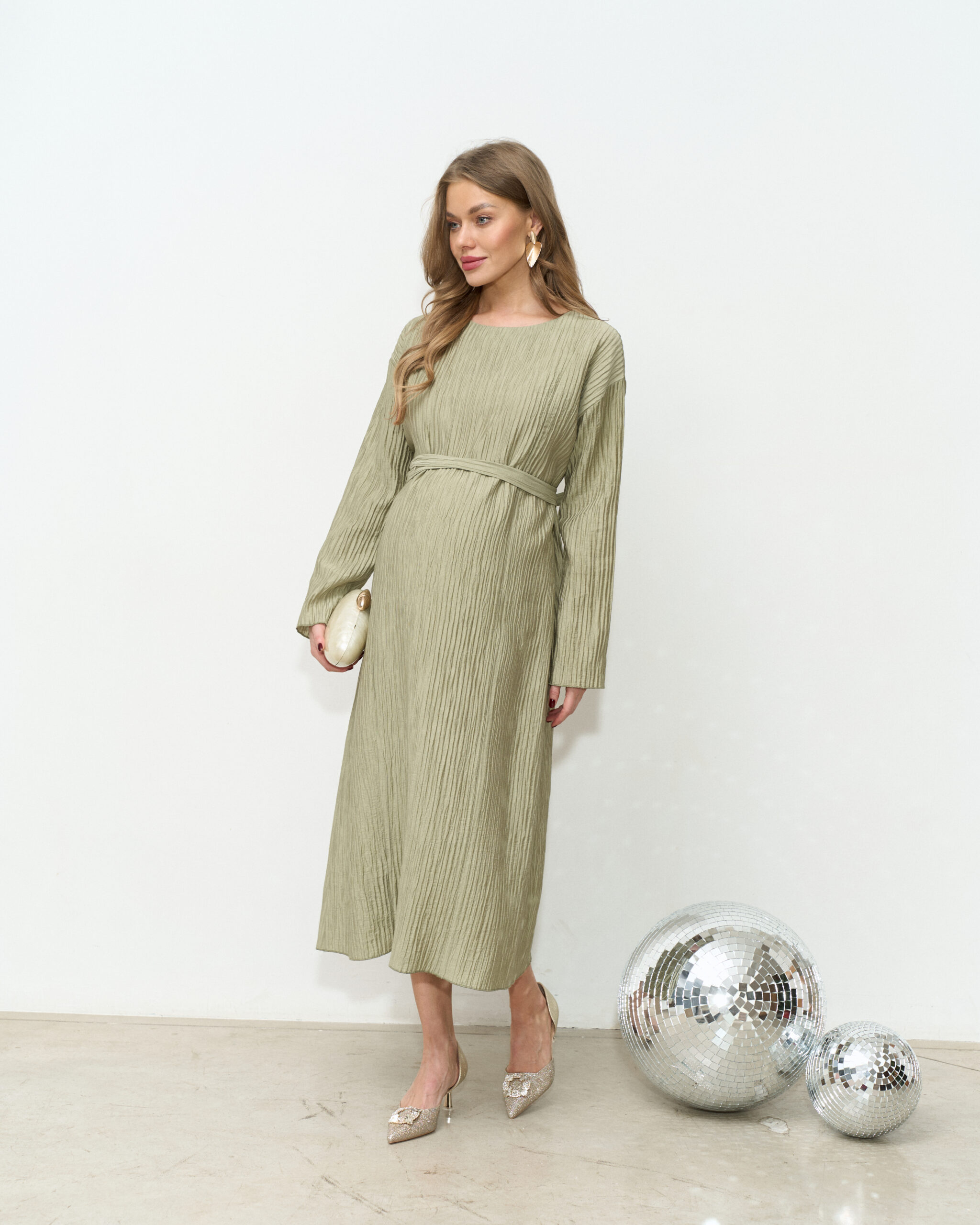 Праздничное платье в длине миди из трендовой ткани-гофре. Специальный крой и молнии для кормления позволят носить его всю беременность и после. Пояс в комплекте.