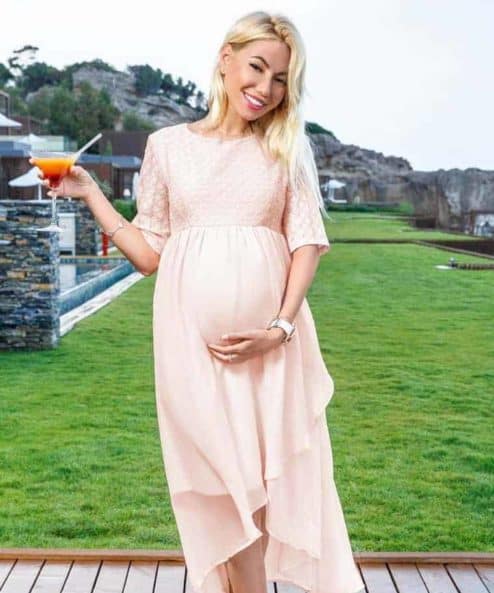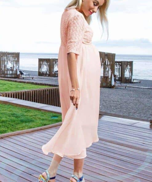 Летнее платье для беременных, из воздушного шифона на трикотажном подкладе, со вставками на кокетке и коротким рукавом.