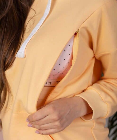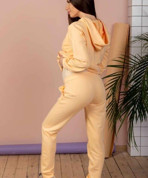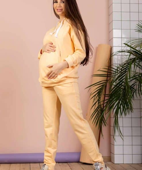 Этот современный костюм из плотного хлопкового трикотажа подойдет на весь период беременности и после. На брюках — высокий пояс, чтобы утеплить растущий животик будущей мамы, и шнурок для регулировки объема. На худи — незаметные молнии для кормления малыша и шнурки для регулировки объема.