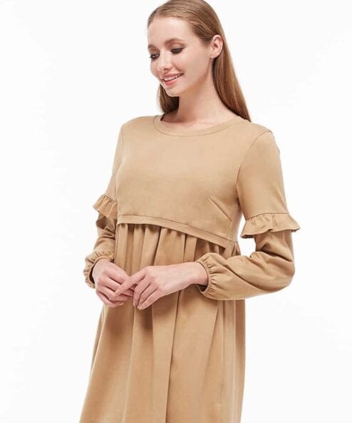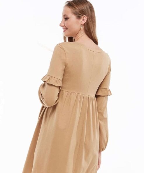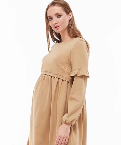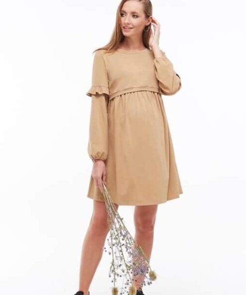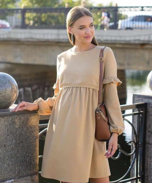 Оригинальное платье с оборками для беременных и кормящих из хлопкового трикотажа. Оборки на рукавах создают интересный и необычный образ. Секрет кормления: верхняя деталь полочки заходит на нижнюю деталь.