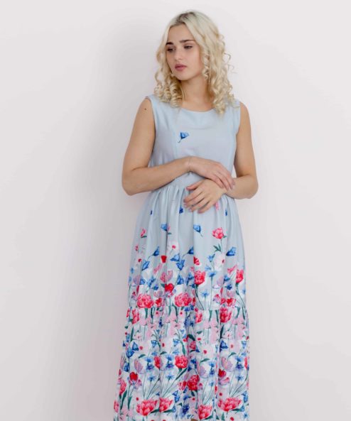 Современное платье длины миди с актуальным цветочным принтом. В таком платье вы точно будете самой модной мамой. Идеально для лета, в нем вам не будет жарко. Платье скроено специально для растущего животика и выполнено из натуральной, дышащей ткани. Можно носить и после беременности. Для кормления — молнии в рельефах. Пояс-завязки позволяет носить платье приталенным либо более свободно.