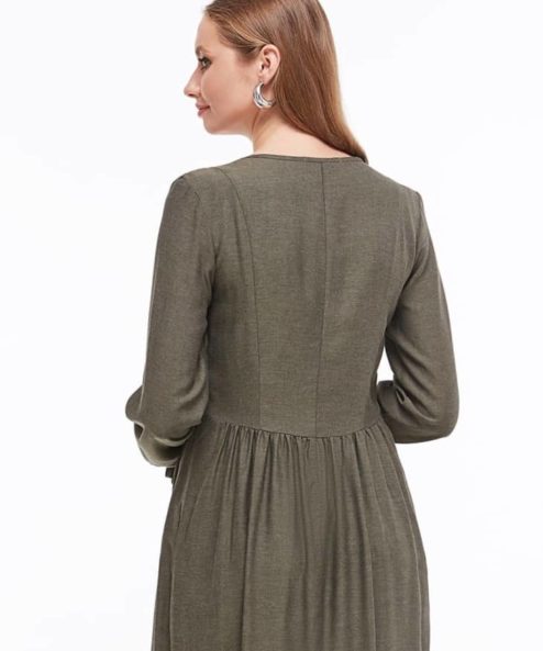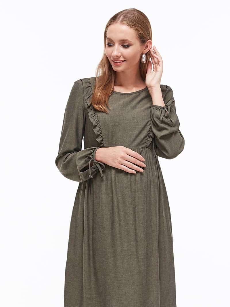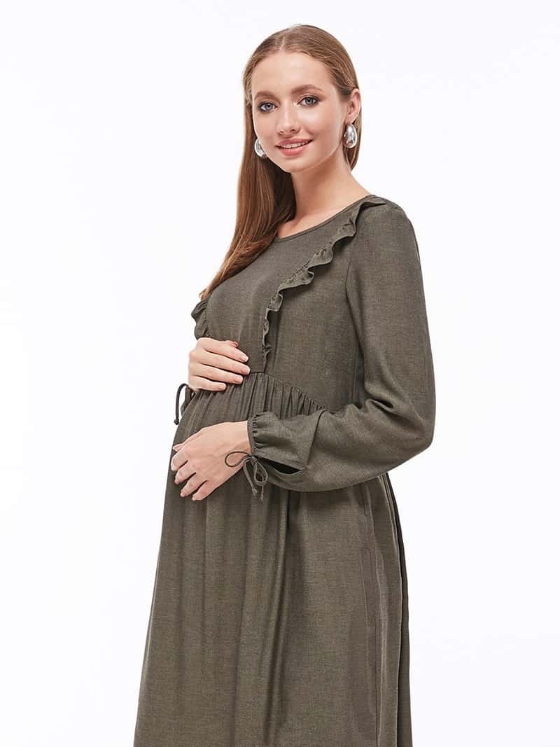 Приятное к телу платье с оборками по нагрудным рельефам для беременных и кормящих девушек. Секрет кормления: потайные молнии в нагрудных рельефах.