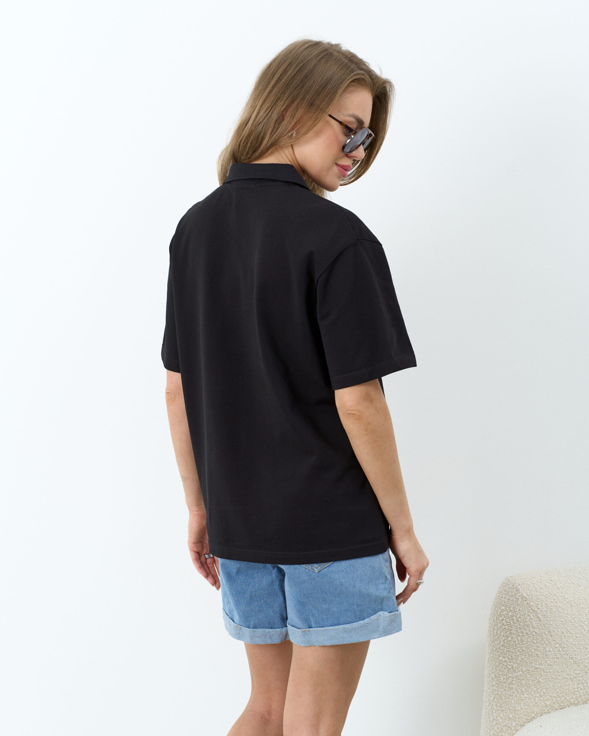Футболка-поло актуального кроя оверсайз из хлопкового трикотажа. Подойдет для любого срока беременности и после. Для кормления малыша выполнены удобные вертикальные молнии.