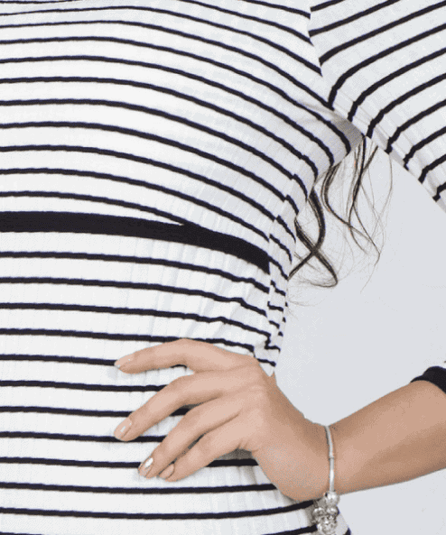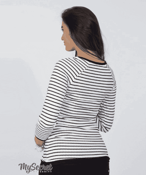 Облегающий лонгслив для беременных и кормящих мам из фактурного трикотажа в полоску (секрет кормления — верхняя деталь полочки заходит на нижнюю деталь).  Рукав 3/4, круглая горловина, контрастные полоски по низу рукава, горловине и верхней детали полочки. Лаконичный и очень стильный он прекрасно подойдет для любого случая, а эластичная ткань позволит изделию сохранить свою форму, чтобы вы могли наслаждаться любимым лонгсливом и после рождения малыша.