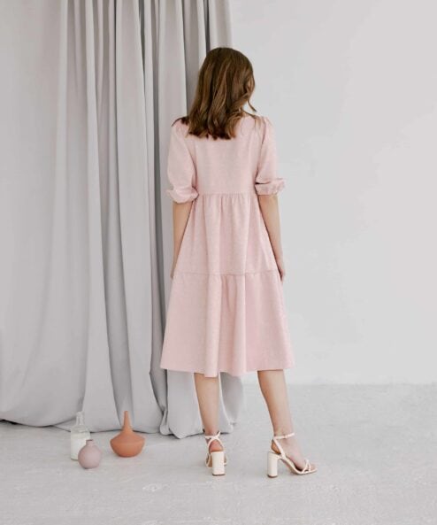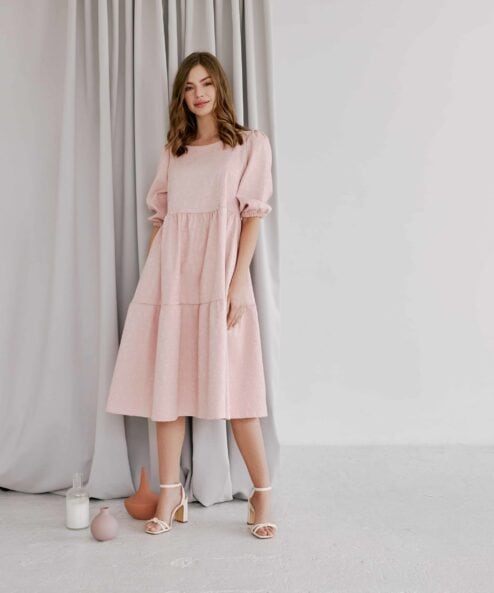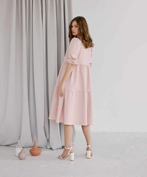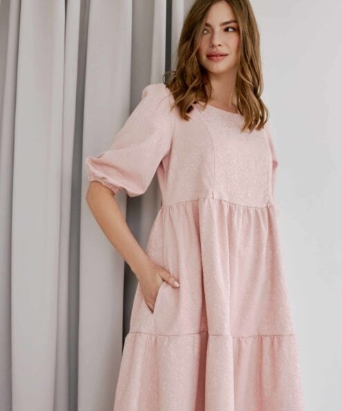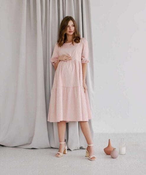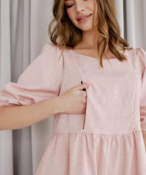 Актуальное платье-баллон для будущих и кормящих мам. Объемный крой на контрасте подчеркнет изящные щиколотки и кисти рук. А жаккардовая фактура ткани добавит еще больше романтики образу. Для кормления малыша вшиты потайные молнии.