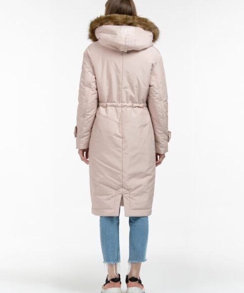 Парка 2в1 для будущих мам длиной ниже колена. Детали: втачной рукав, опущенное плечо, кулиска, воротник стойка, несъемный капюшон, мех искусственного енота съемный.  Застежка на молнию закрыта планкой с потайными кнопками. Объем на живот дает дополнительная съемная вставка.