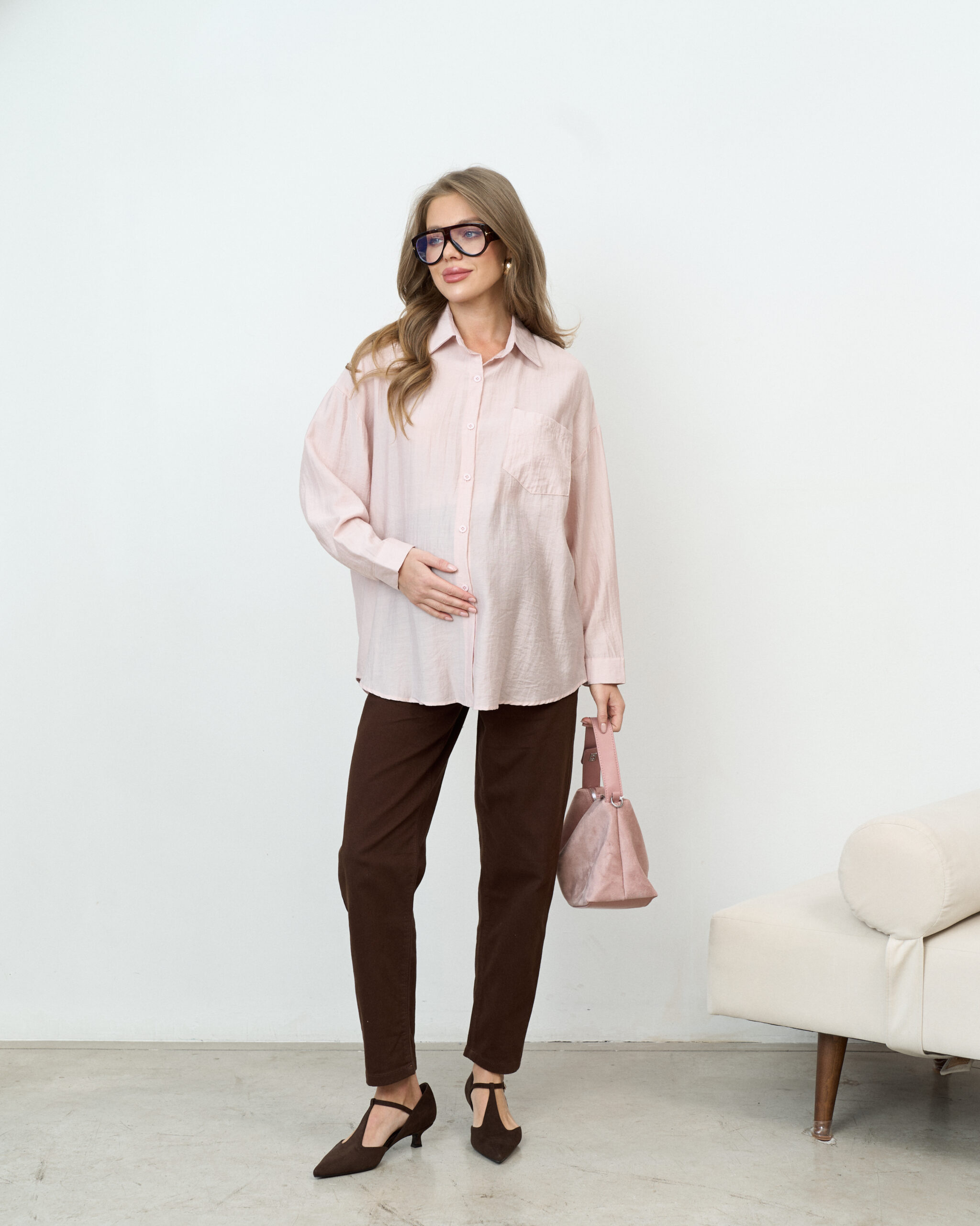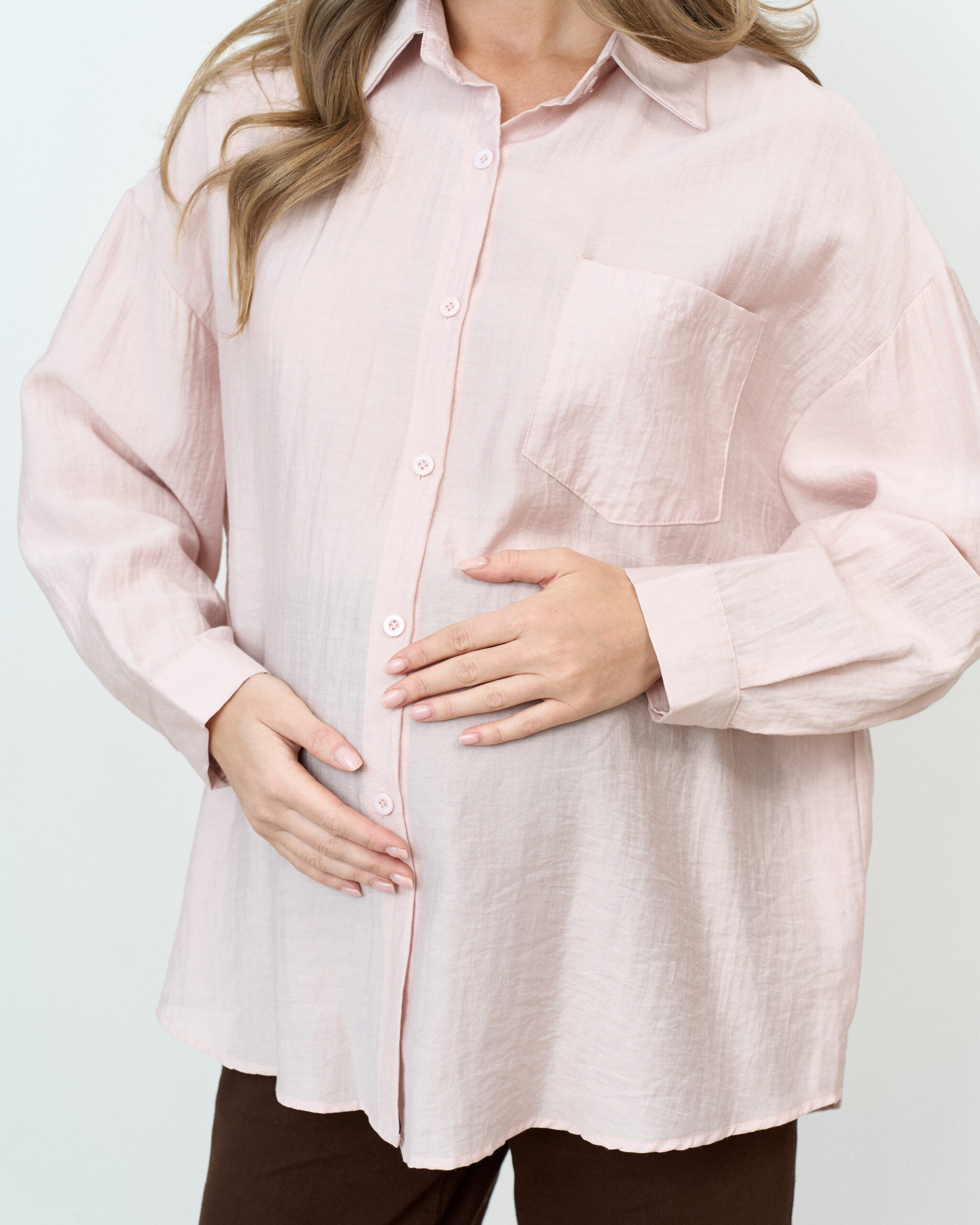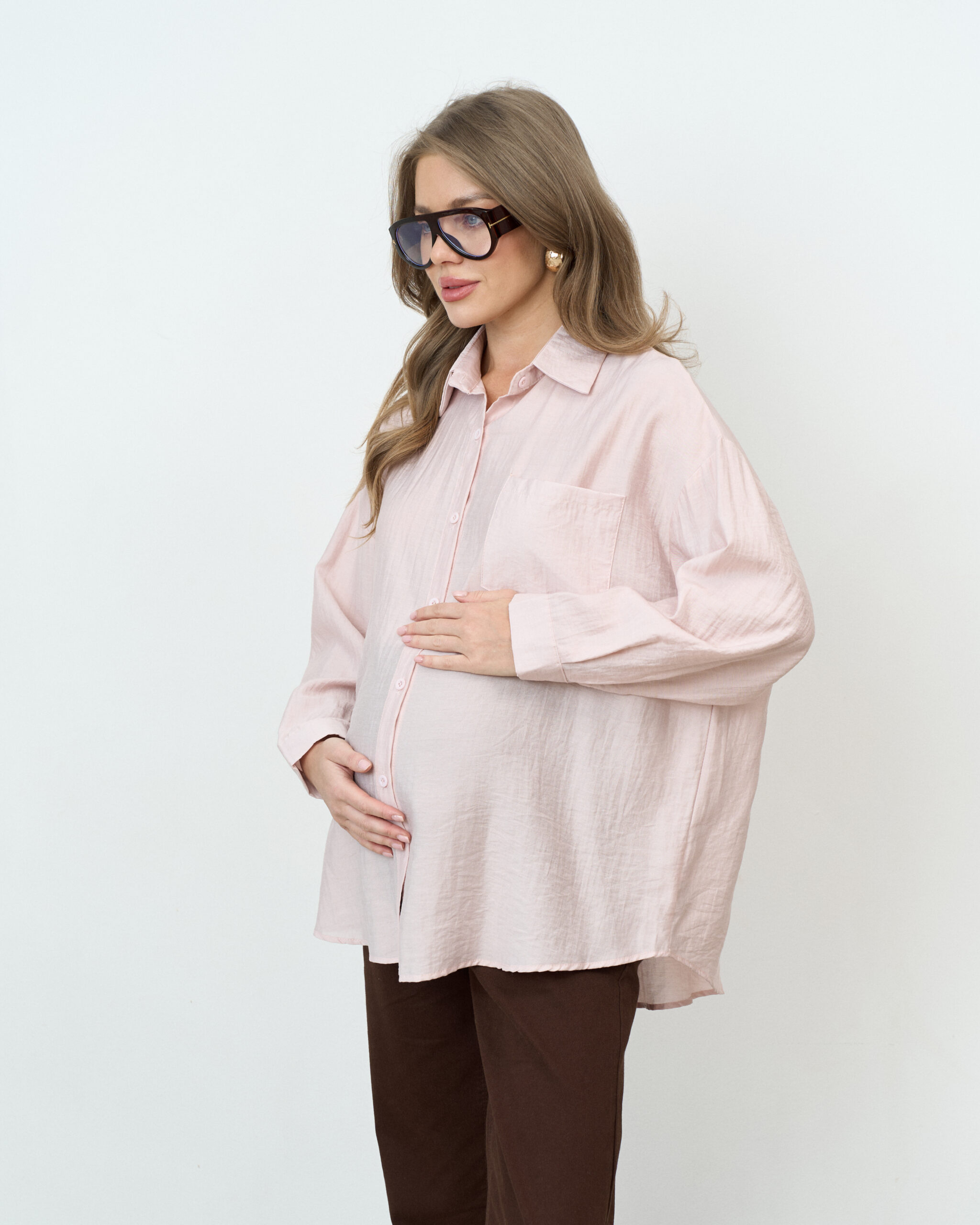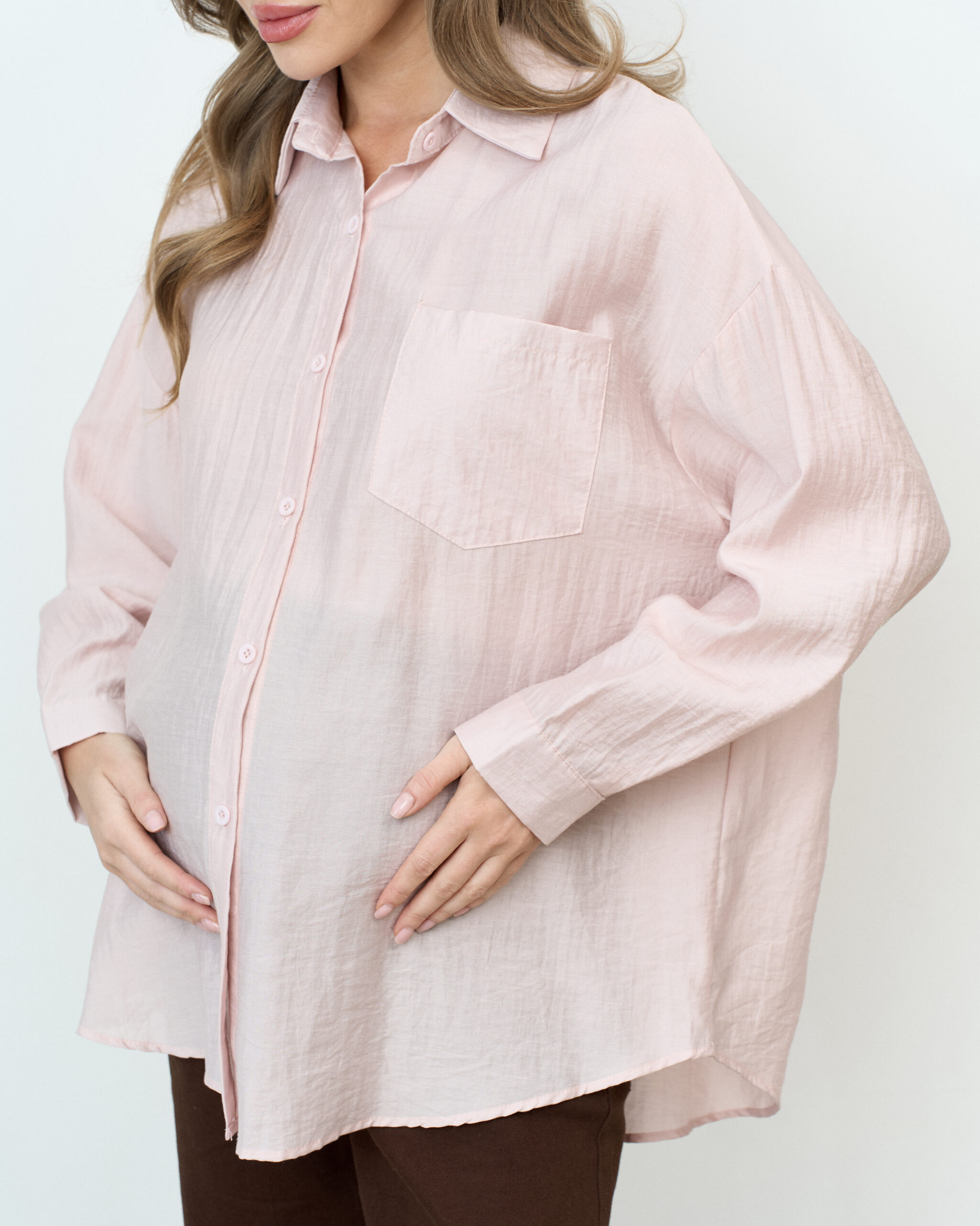 Стильная удлиненная рубашка оверсайз для беременных и кормящих мам. Для кормления пуговицы расстегиваются.