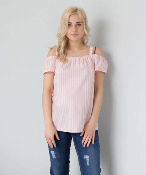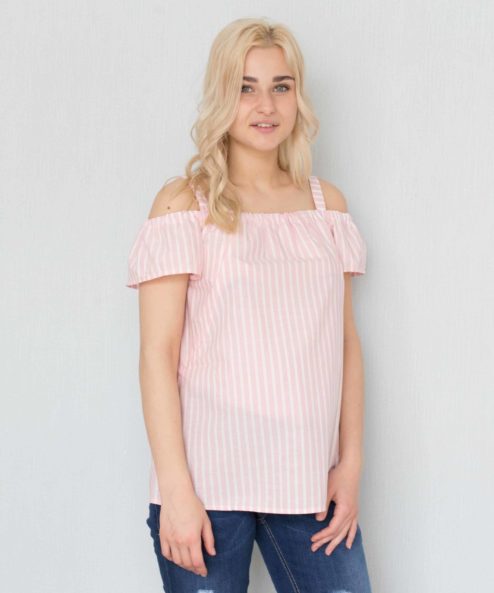Супертрендовая блузка для кормления из батиста в полоску. Модный фасон с открытыми плечами и незаметные потайные молнии в рельефах на груди делают эту модель соблазнительной для любительниц ярких и практичных вещей.