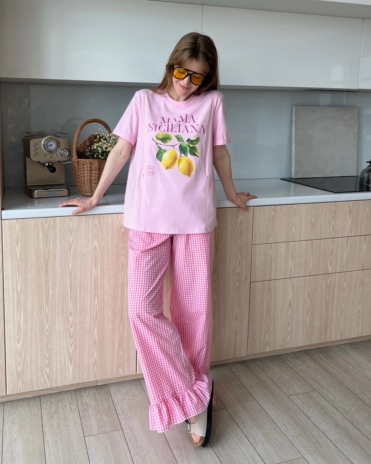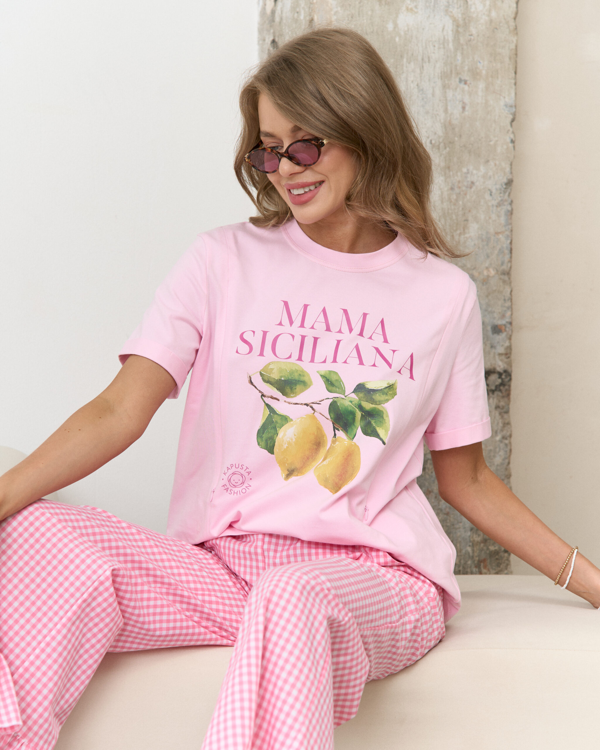 Футболка актуального кроя оверсайз из хлопкового трикотажа. Подойдет для любого срока беременности и после. Для кормления малыша выполнены удобные вертикальные молнии. Особенность модели — яркий принт с лимонами и надписью MAMA SICILIANA.