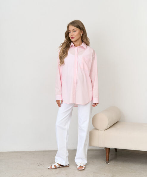 Стильная удлиненная рубашка оверсайз для беременных и кормящих мам. Легкая полупрозрачная ткань и модный фасон идеальны для летних образов. Для кормления пуговицы расстегиваются.