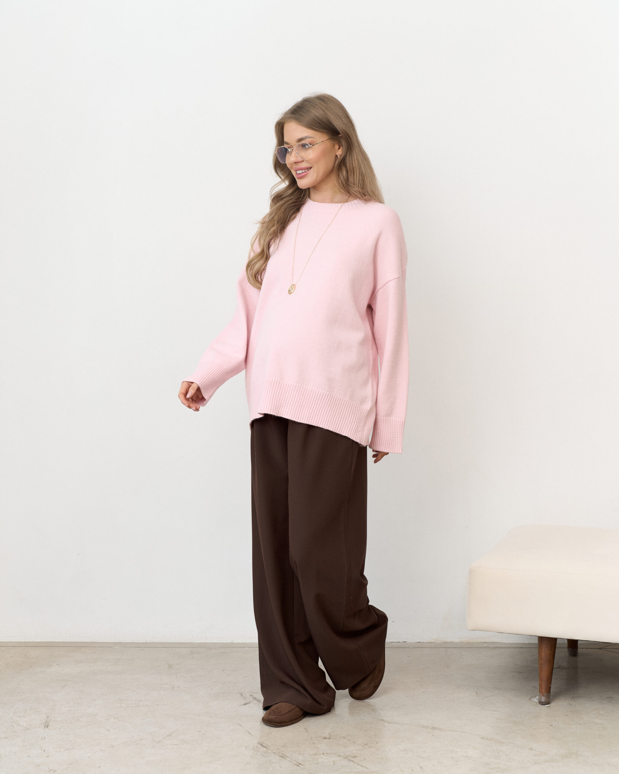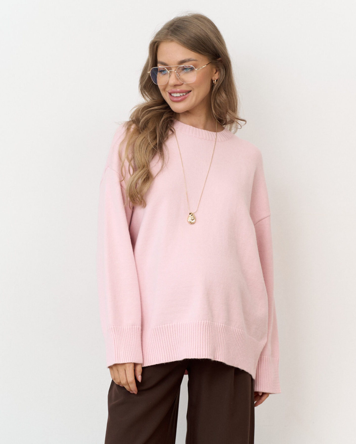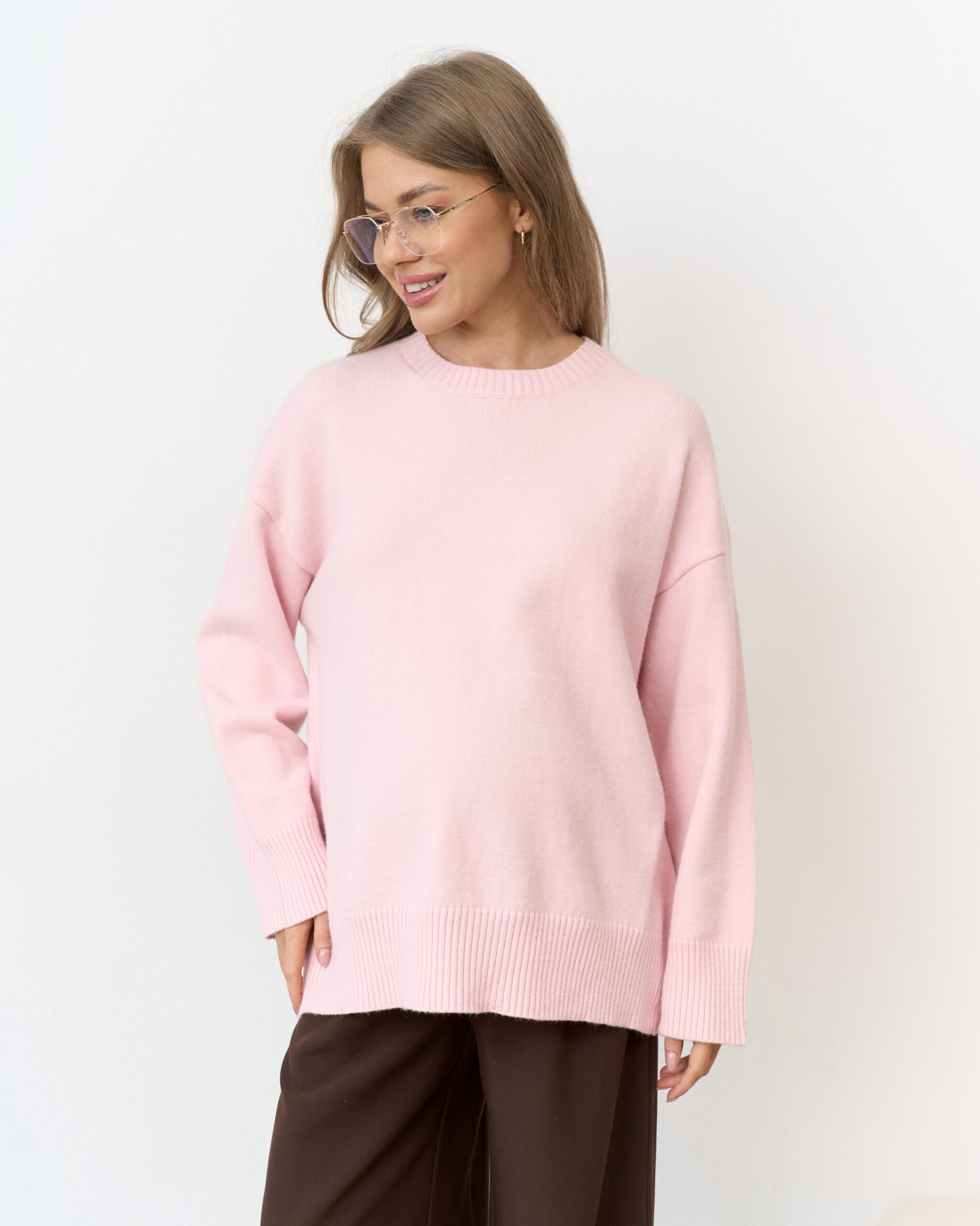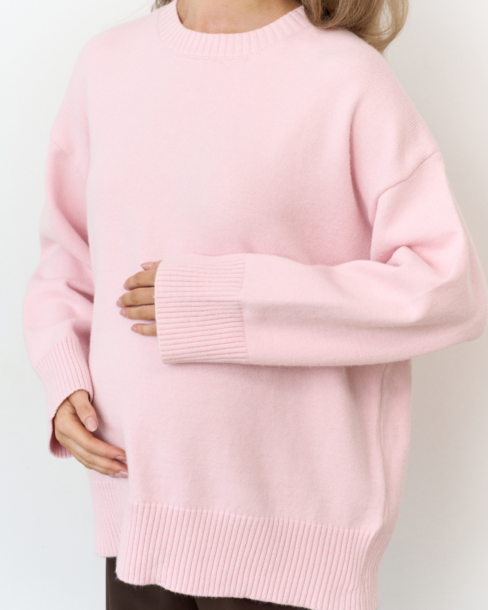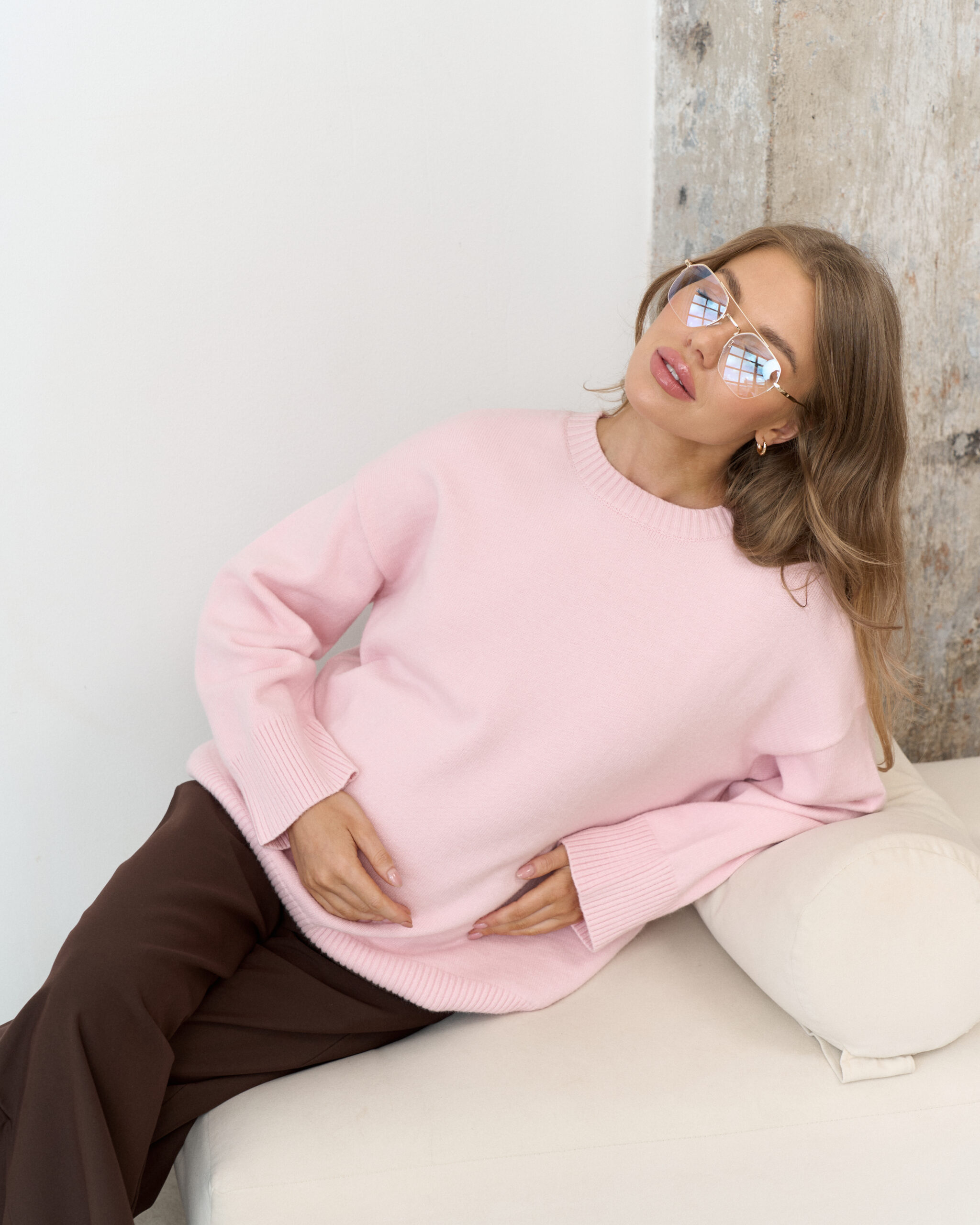 Удлиненный джемпер с круглой горловиной и спущенной линией плеч подойдет на любой срок беременности и после. Мягкая эластичная вязка и натуральный состав пряжи подарят комфорт в любое время года.