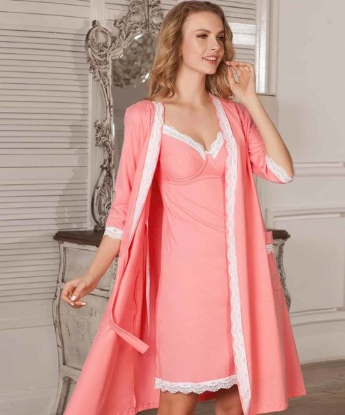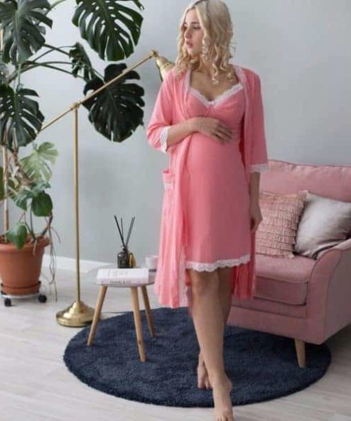 Халат для беременных и кормящих в трендовом цвете с кружевными оборками. Лаконичный фасон и удобный запах делают эту модель многофункциональной — в ней будет комфортно и дома, и ее можно взять с собой в роддом.