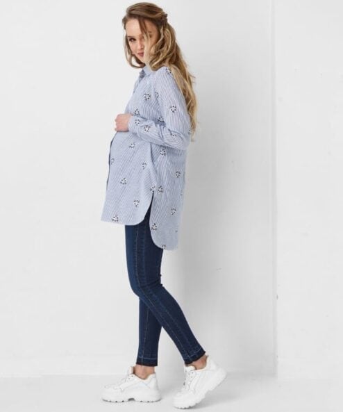 Хлопковая рубашка свободного кроя для беременных и кормящих мам с необычной цветочной вышивкой. Такую рубашку можно носить как с классическими брюками, так и с джинсами в стиле casual. Для кормления — незаметные молнии в рельефах.