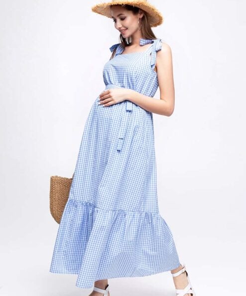 Длинный сарафан для беременных и кормящих с завязывающимися бретелями.