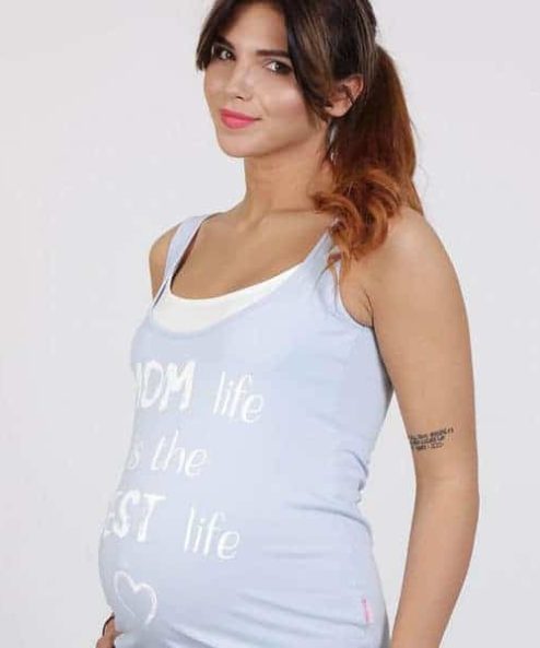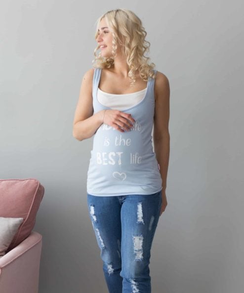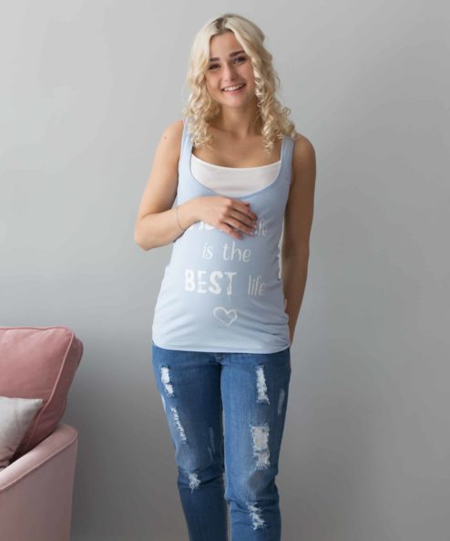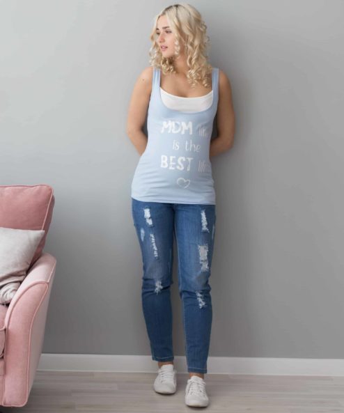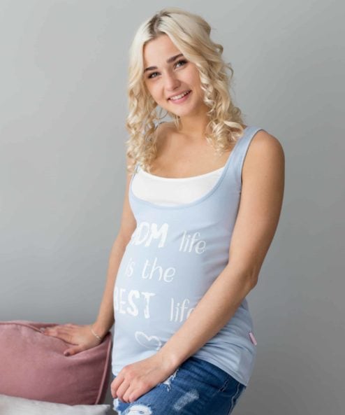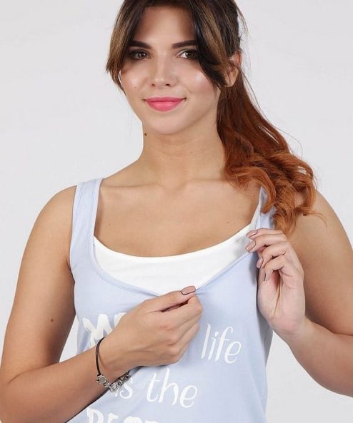 Облегающая майка для беременных и кормящих из стрейчевого хлопкового трикотажа. Удобный секрет для кормления (глубокий вырез горловины продублирован внутренним коротким топиком), стильная расцветка и яркий принт на полочке «Moms life» сделают эту модель вашей верной спутницей на все теплое время года.