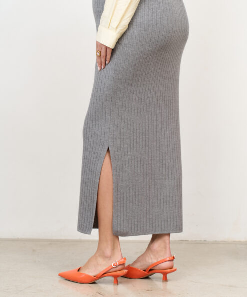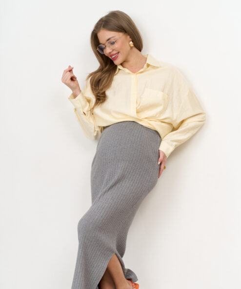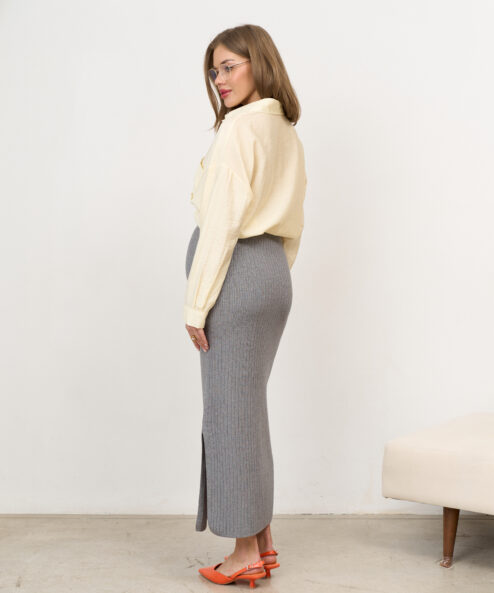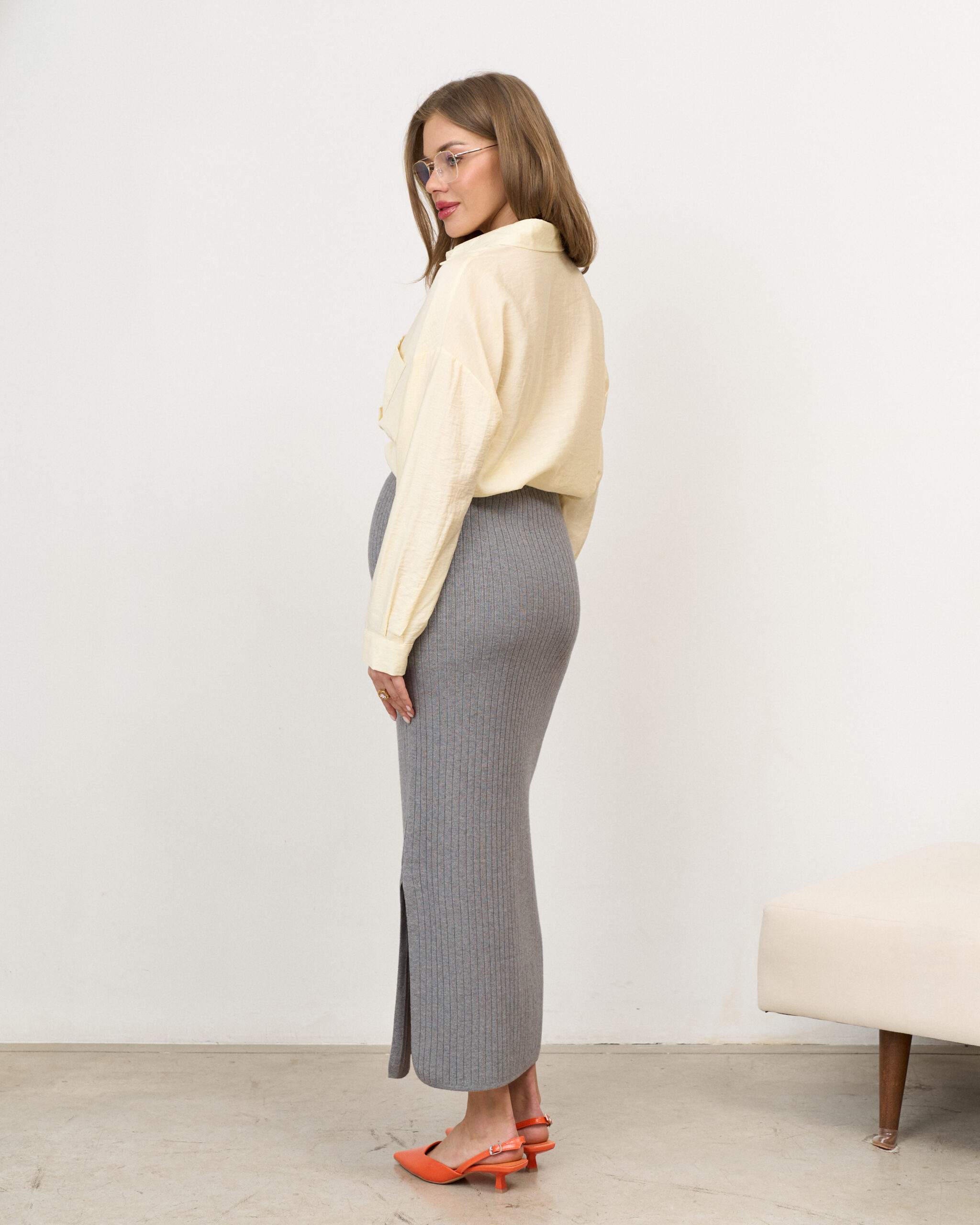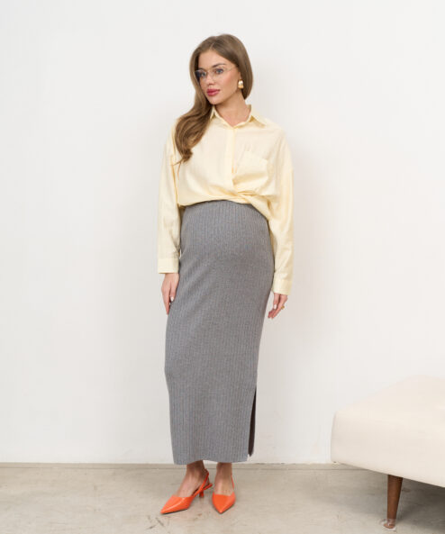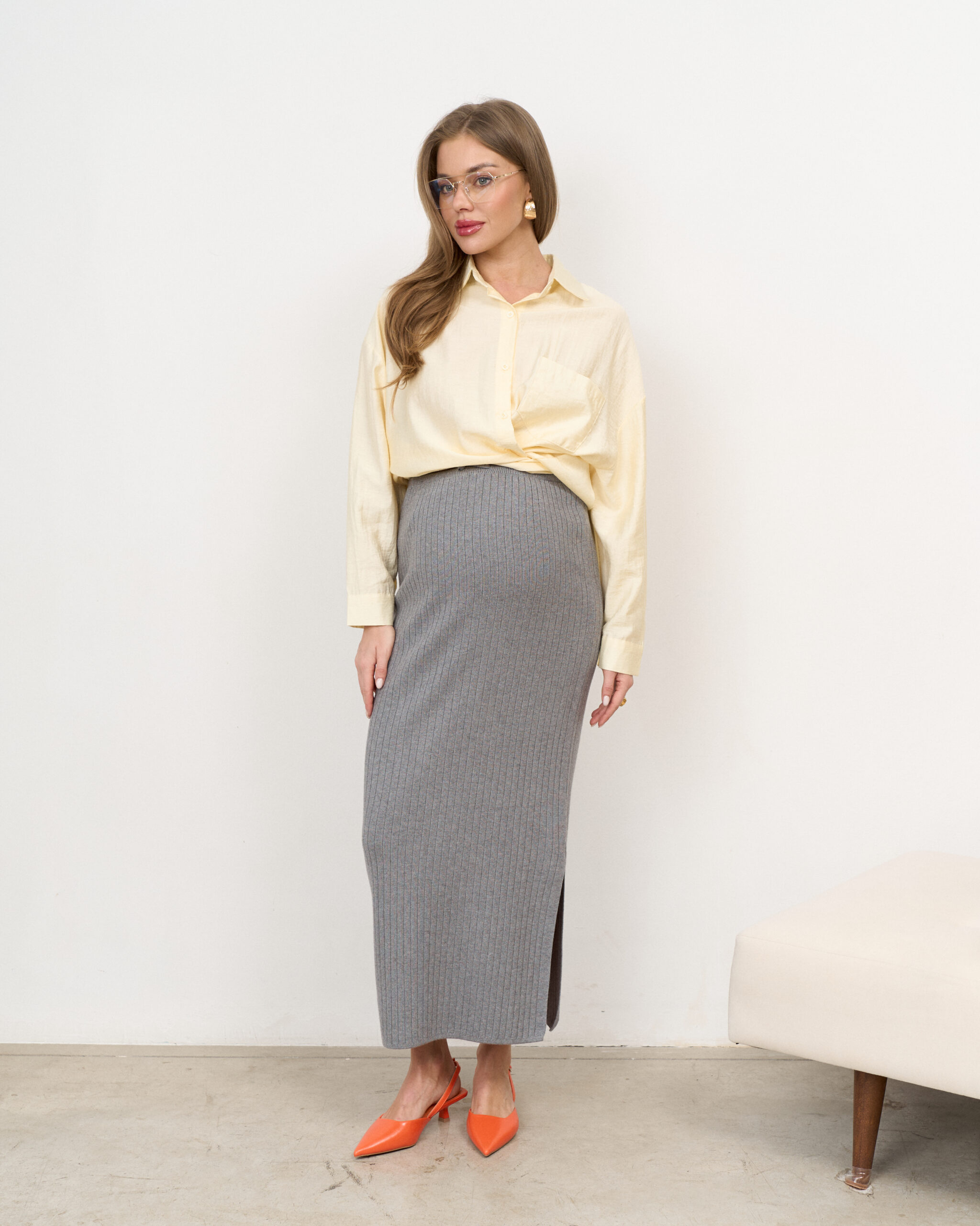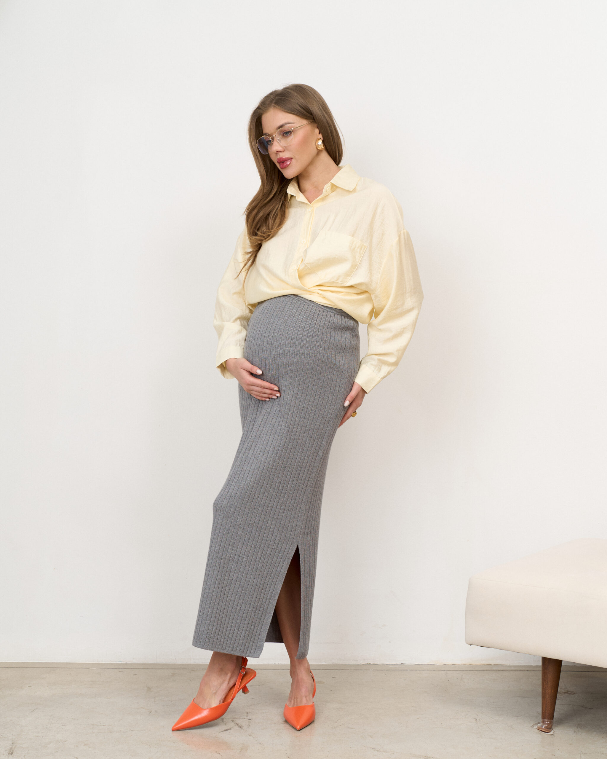 Стильная юбка в длине миди из трикотажной ткани с разрезом. Мягкий эластичный пояс позволит носить юбку на любом сроке беременности и после.