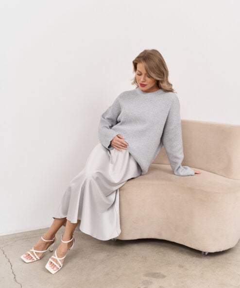 Трендовая юбка длины миди из плотного вискозного атласа, которая подойдет на весь срок беременности и после. Пояс выполнен в виде комфортной резинки.