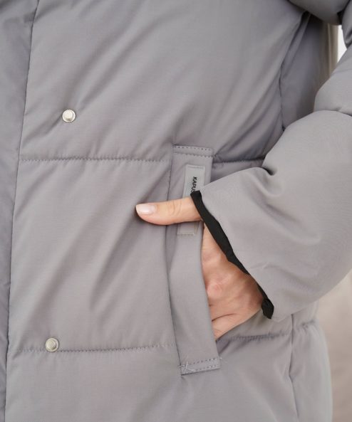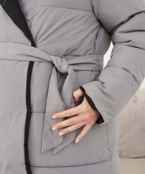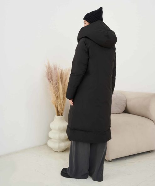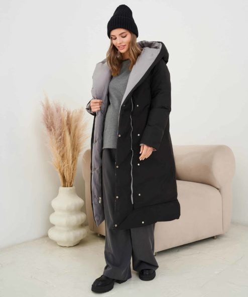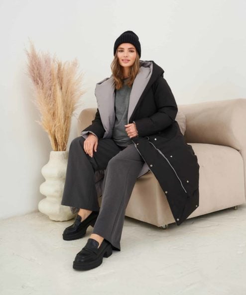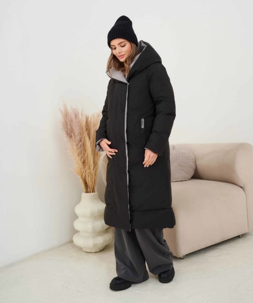 Невероятно теплое и стильное зимнее пальто, которое подойдет на весь срок беременности и после. Приятный бонус — можно надевать черной либо бежевой стороной — под ваше настроение и образы. Детали: вместительные карманы с обоих сторон, пояс в комплекте, кнопки, объемный капюшон.