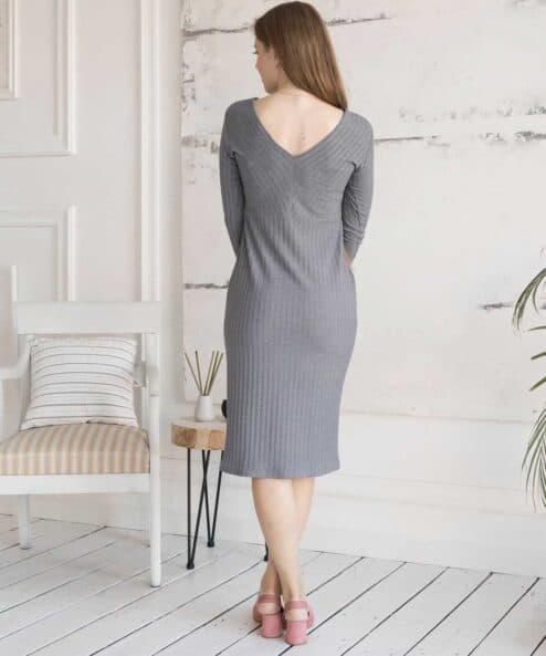 Трикотажное платье-лапша с длинным рукавом и интригующим вырезом на спине. Благодаря вязке оно красиво садится по фигуре и держит форму после стирки. Можно носить как во время беременности, так и после: секрет кормления — верхняя часть полочки заходит на нижнюю.