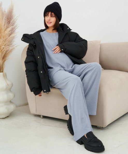 Брюки свободного кроя из трикотажа в рубчик, которые подойдут на весь срок беременности и после. В комплект к брюкам можете приобрести джемпер Kardy