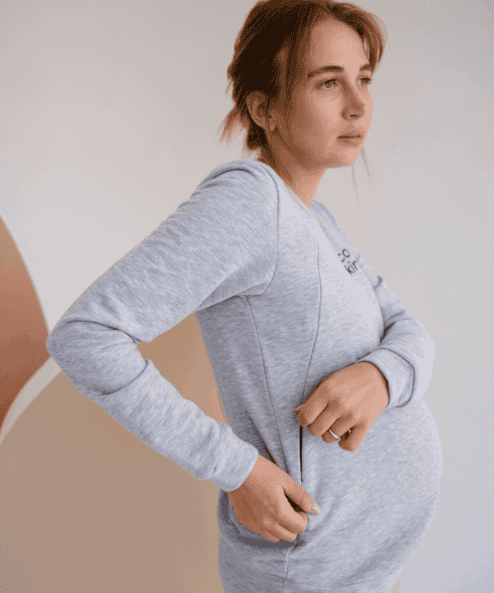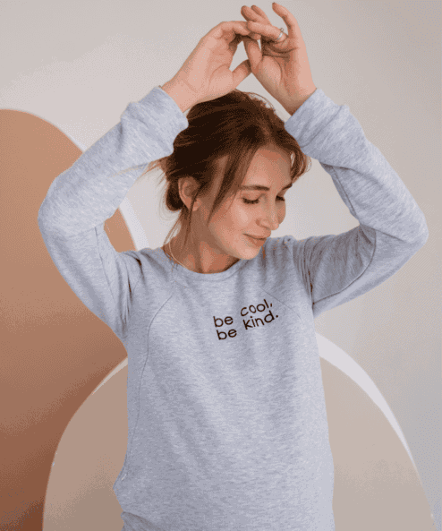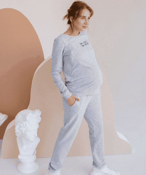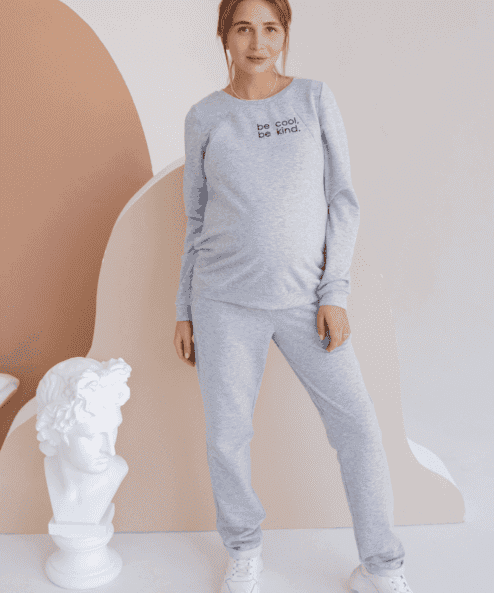 Костюм, состоящий из свитшота и джоггеров станет незаменимым. Джемпер свободного силуэта с принтом `be cool. be kind` и секретом для ГВ в виде молний. Модель выполнена из эластичного хлопкового полотна, комфортно садится по фигуре и деликатно подчеркивает особенности фигуры будущей мамы. Удобный секрет кормления, который позволяет носить модель и после беременности