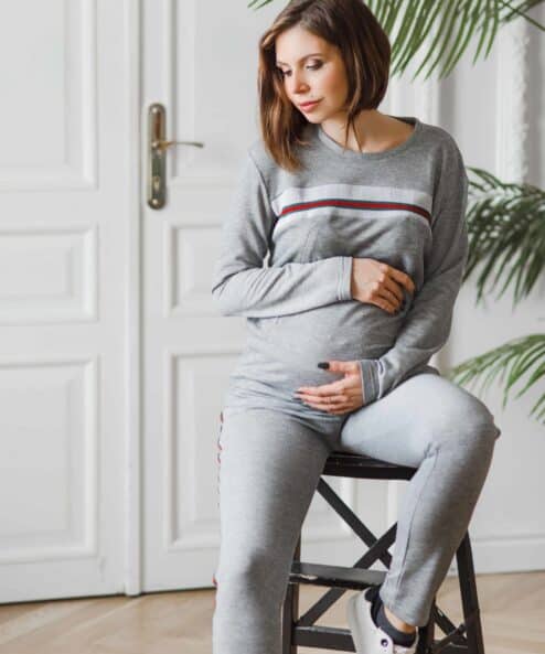Cупер-универсальный и трендовый костюм для беременных и кормящих мам из свитшота и брючек с лампасами. Удлиненный крой свитшота и потайные молнии позволяют носить его как во время беременности, так и в период кормления. У брюк бандажный пояс под растущий животик будущей мамы, благодаря этому они подходят на весь срок беременности и после родов.