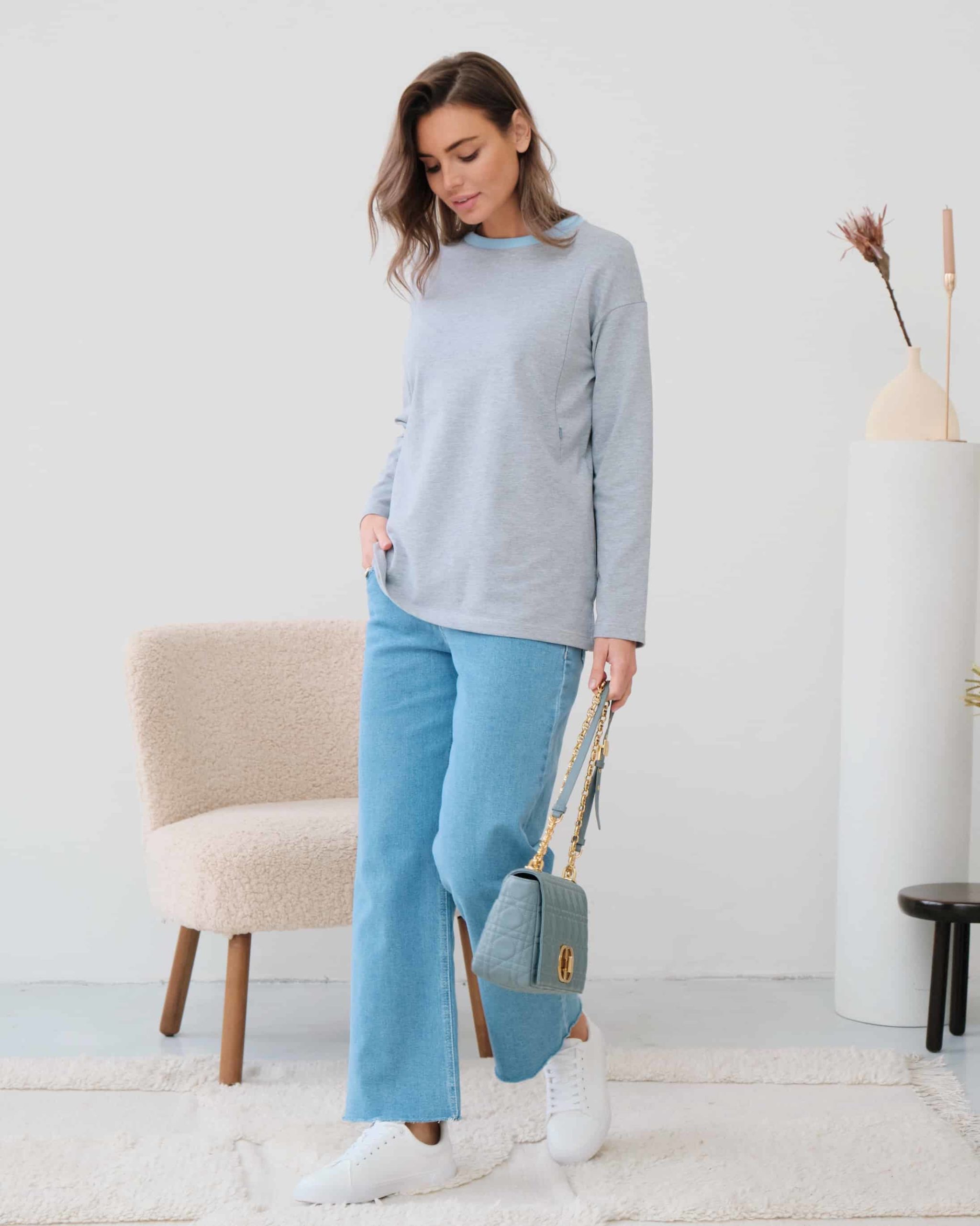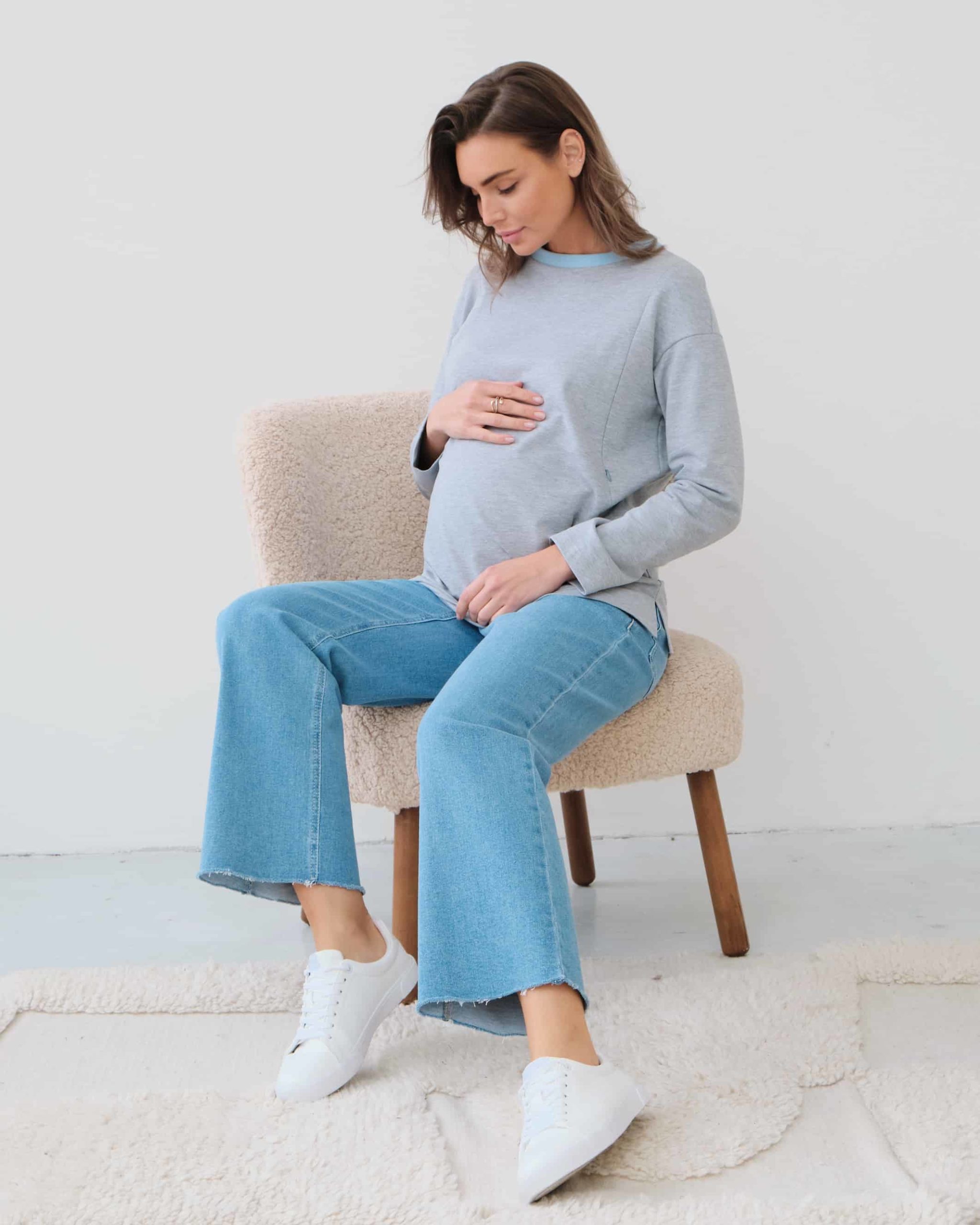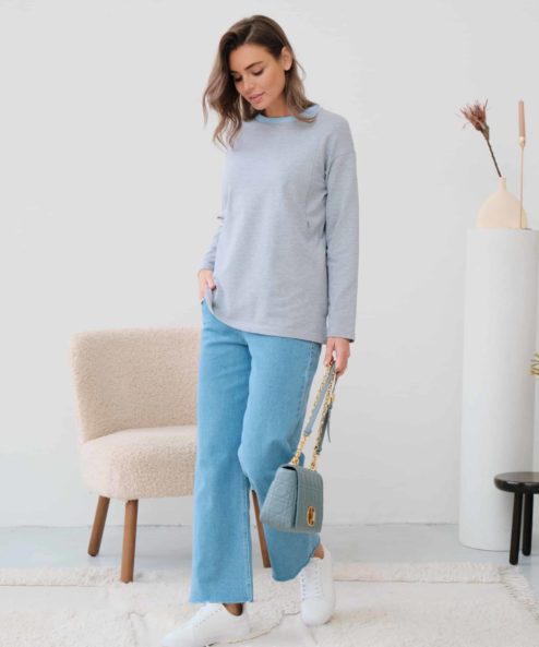 Базовый лонгслив из плотного трикотажного хлопка с контрастным воротом. Подойдет на весь период беременности и после. Секрет для кормления — молнии.