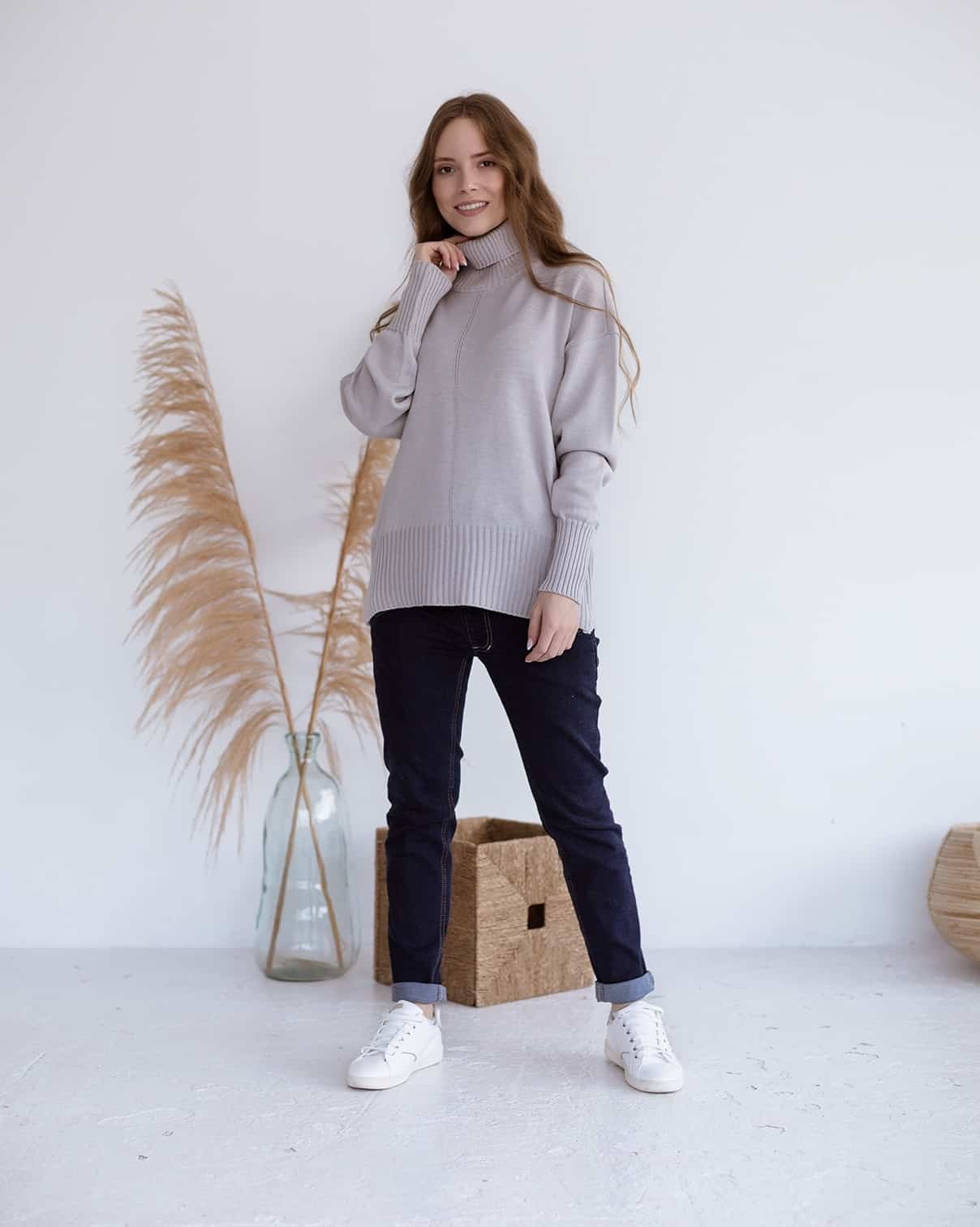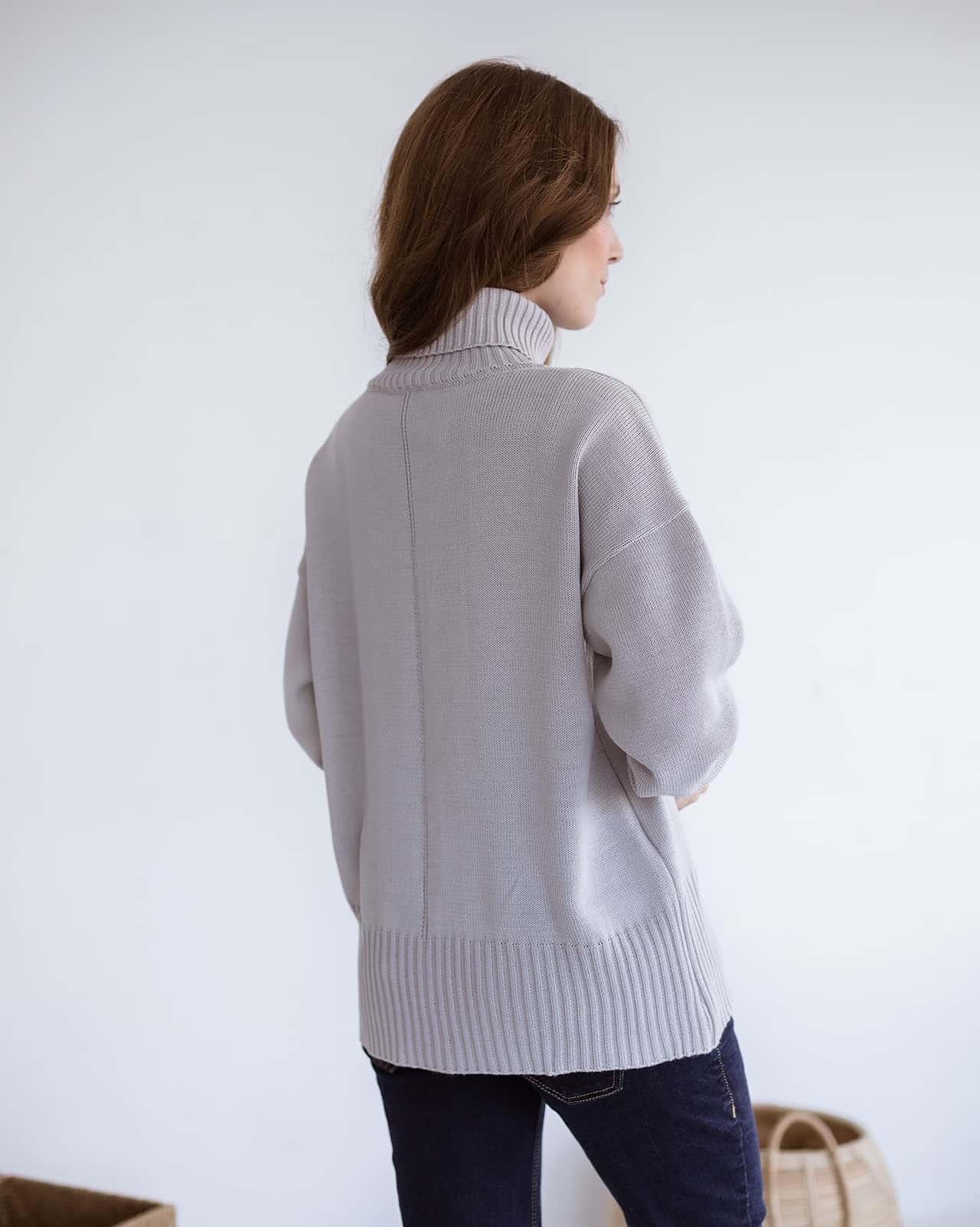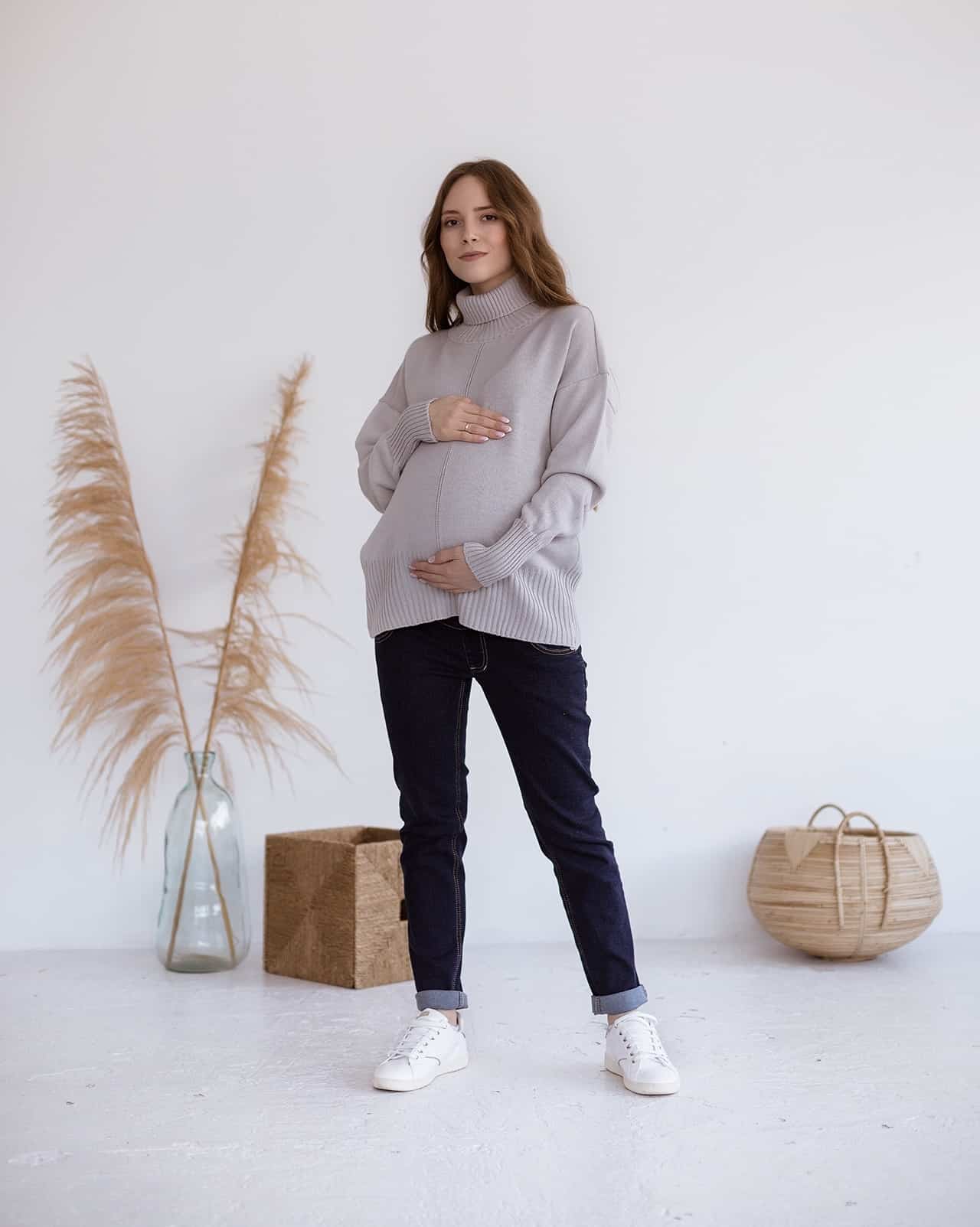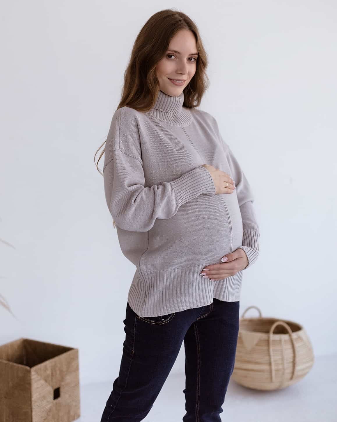 Этот стильный свитер-оверсайз с высоким горлом подойдет на весь период беременности и после. Состав пряжи премиального качества согреет вас зимой и подарит комфорт в межсезонье. Для кормления малыша — потайные молнии в боковых швах.