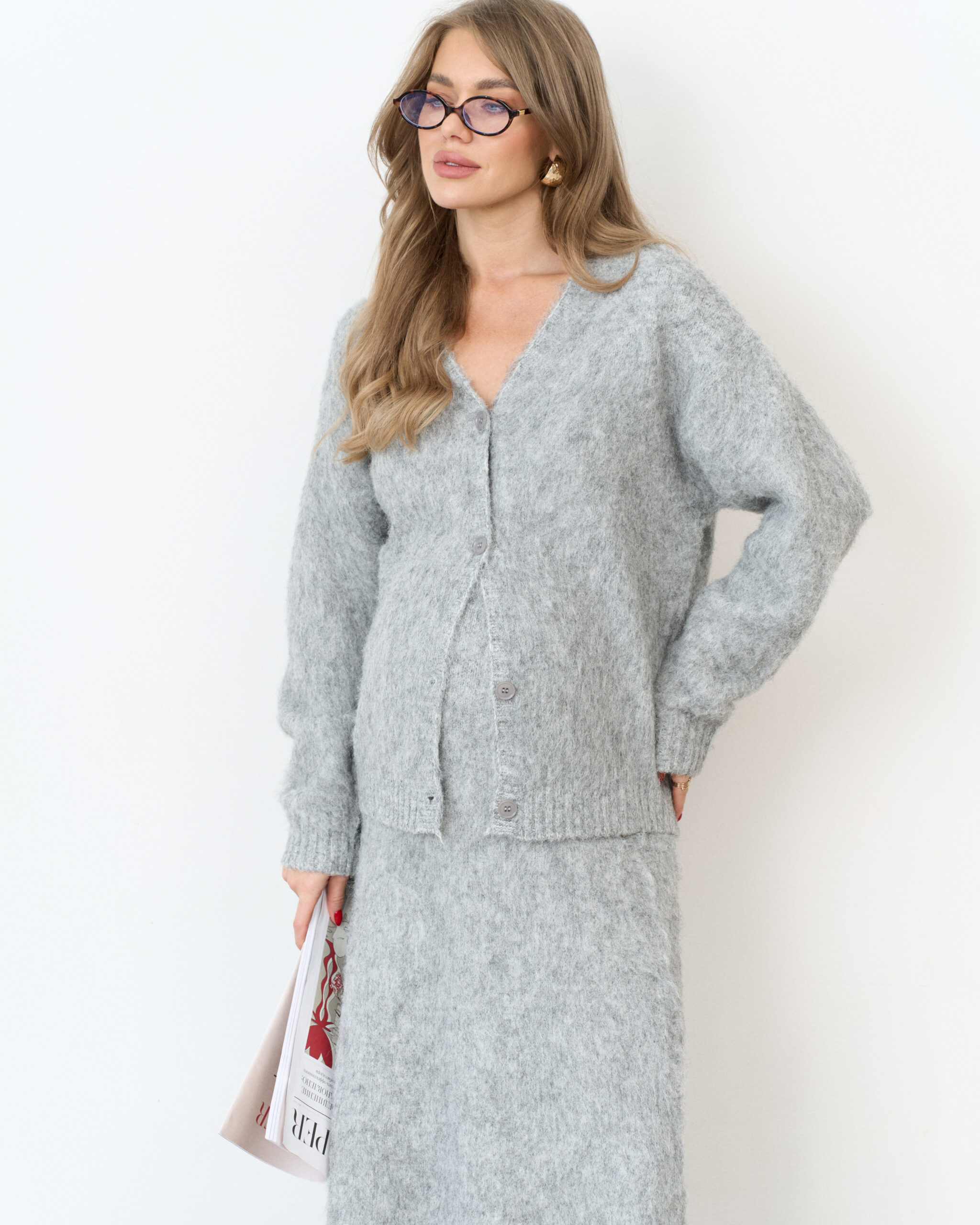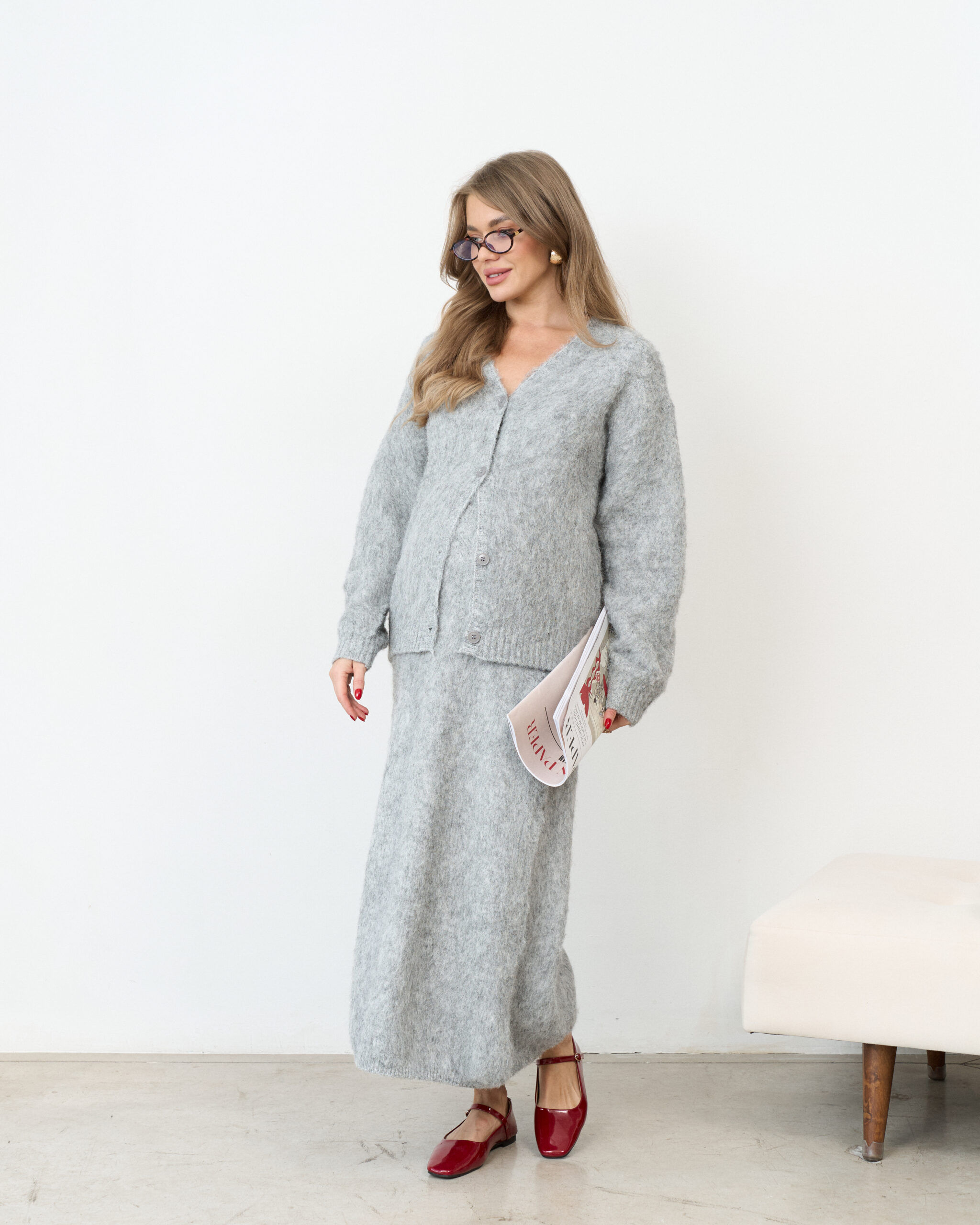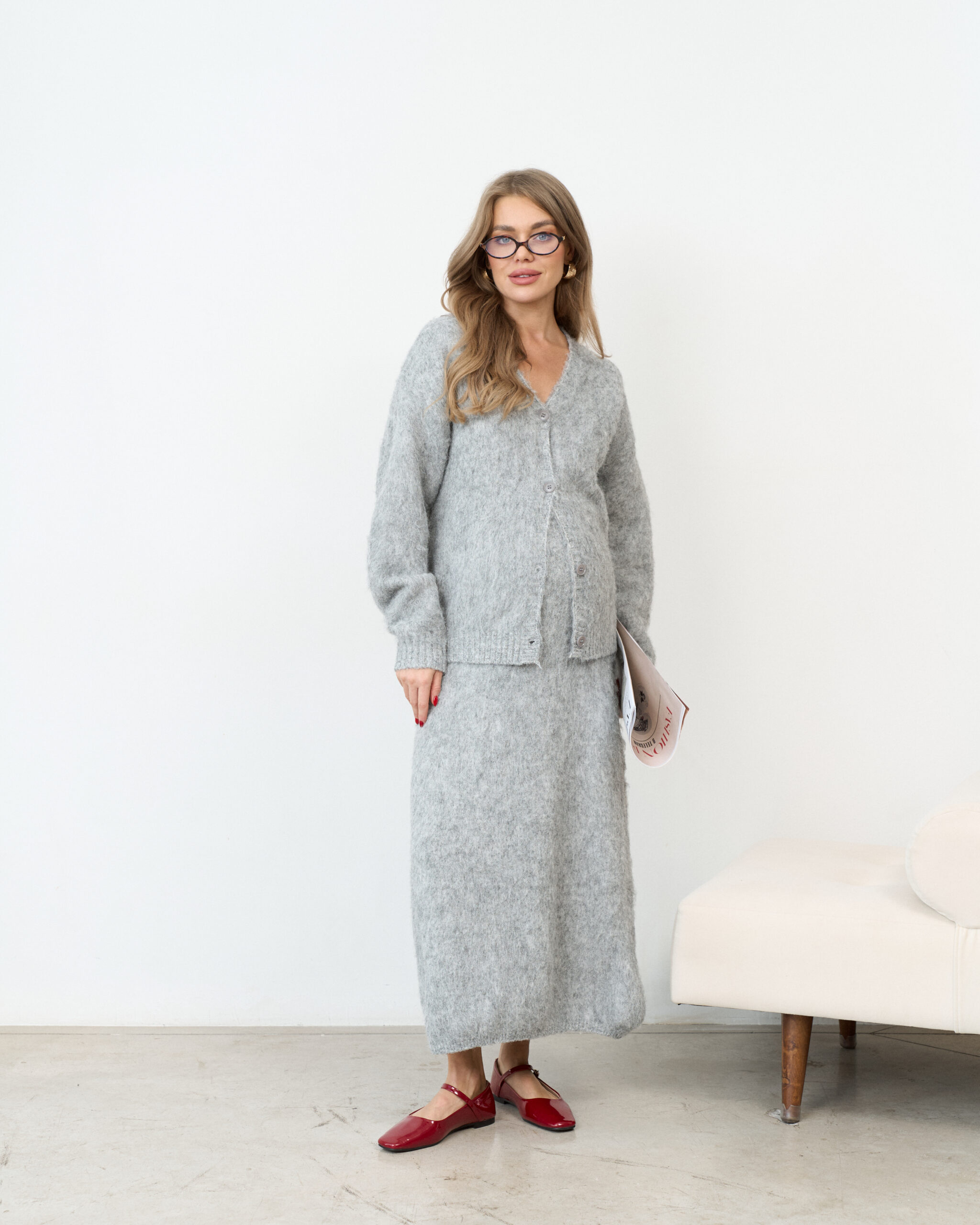 Стильный трикотажный комплект из пушистой пряжи, состоящий из юбки кроя трапеция и актуального кардигана на пуговицах. Модный фасон стройнит и визуально вытягивает фигуру. Подойдет на период беременности и после.