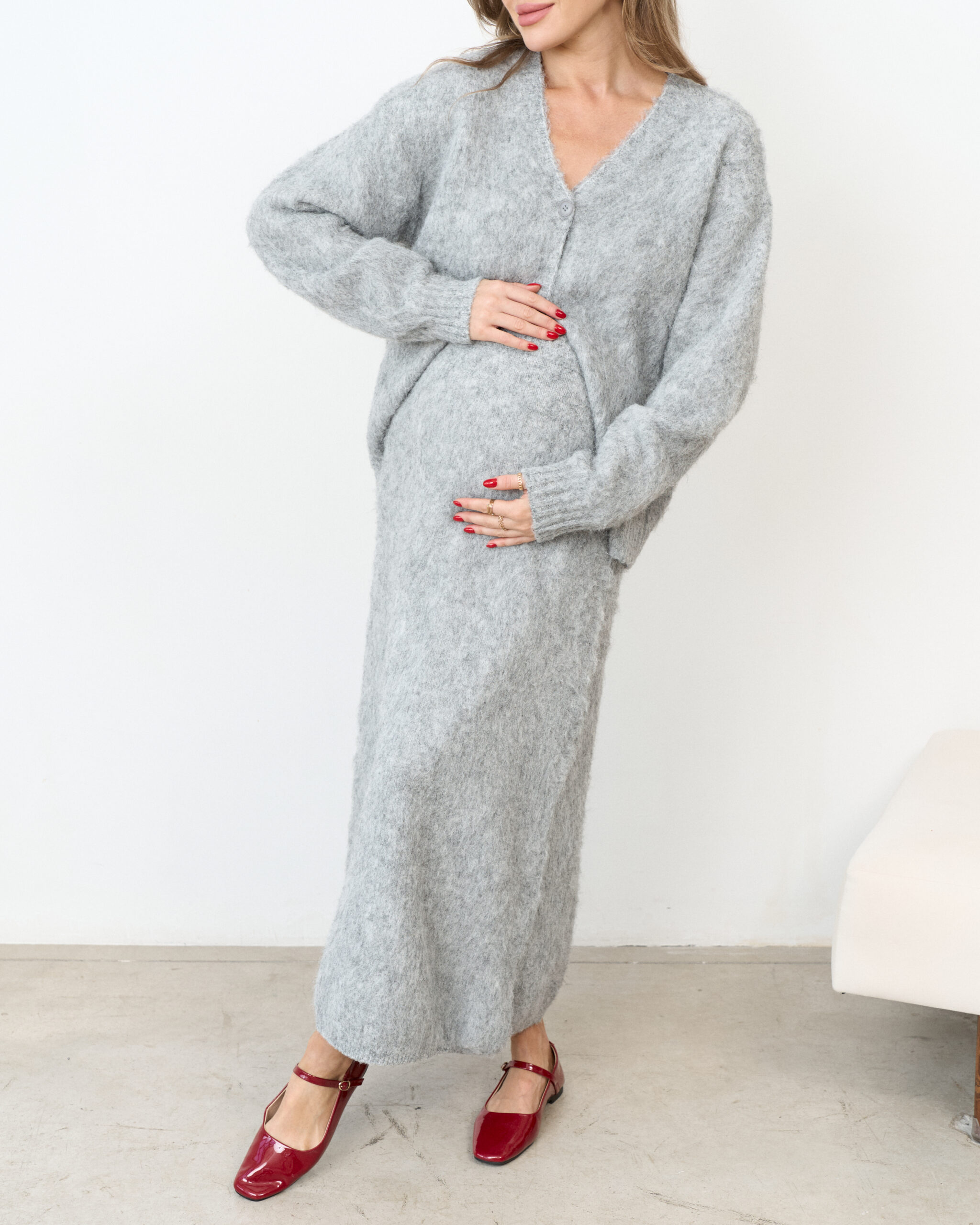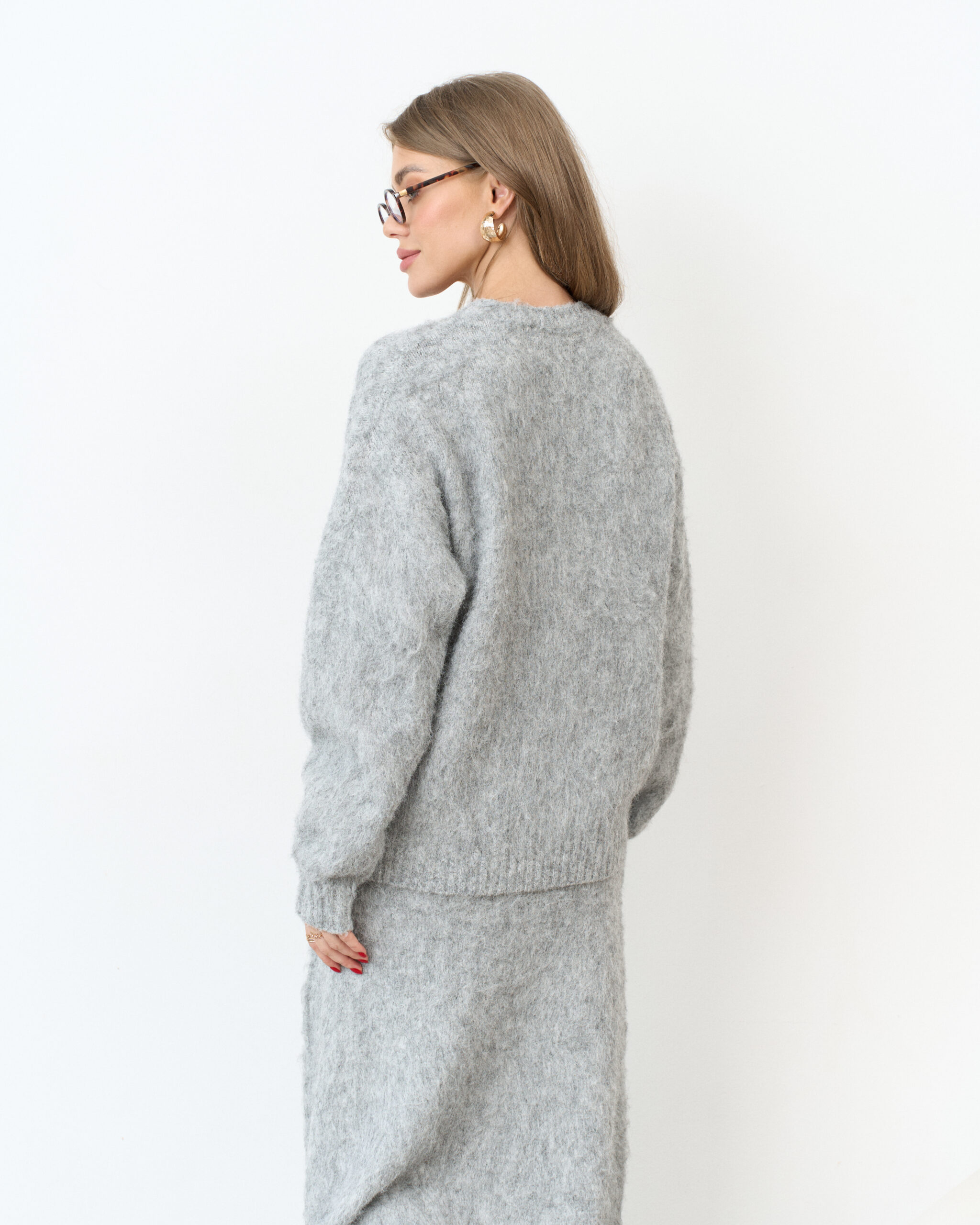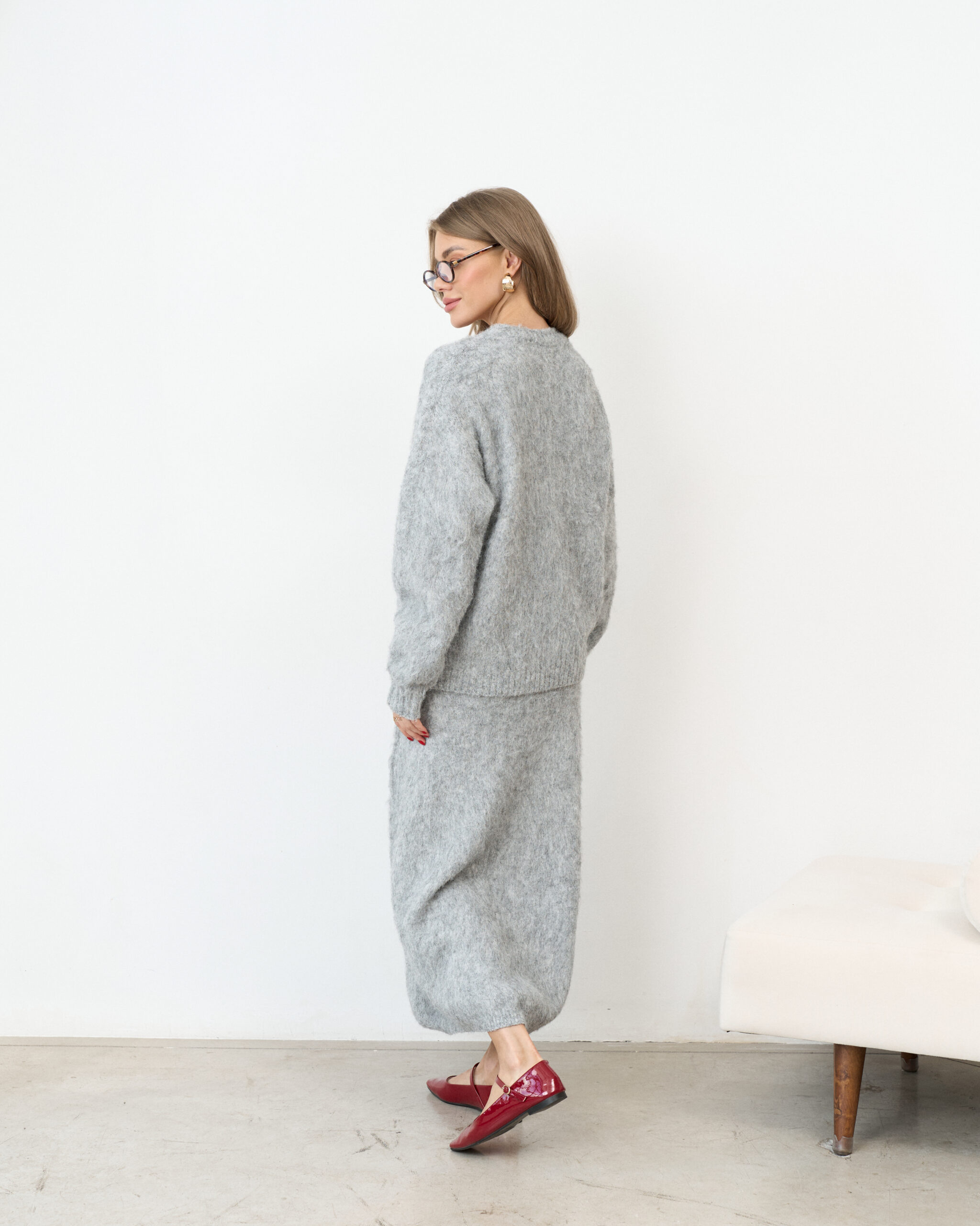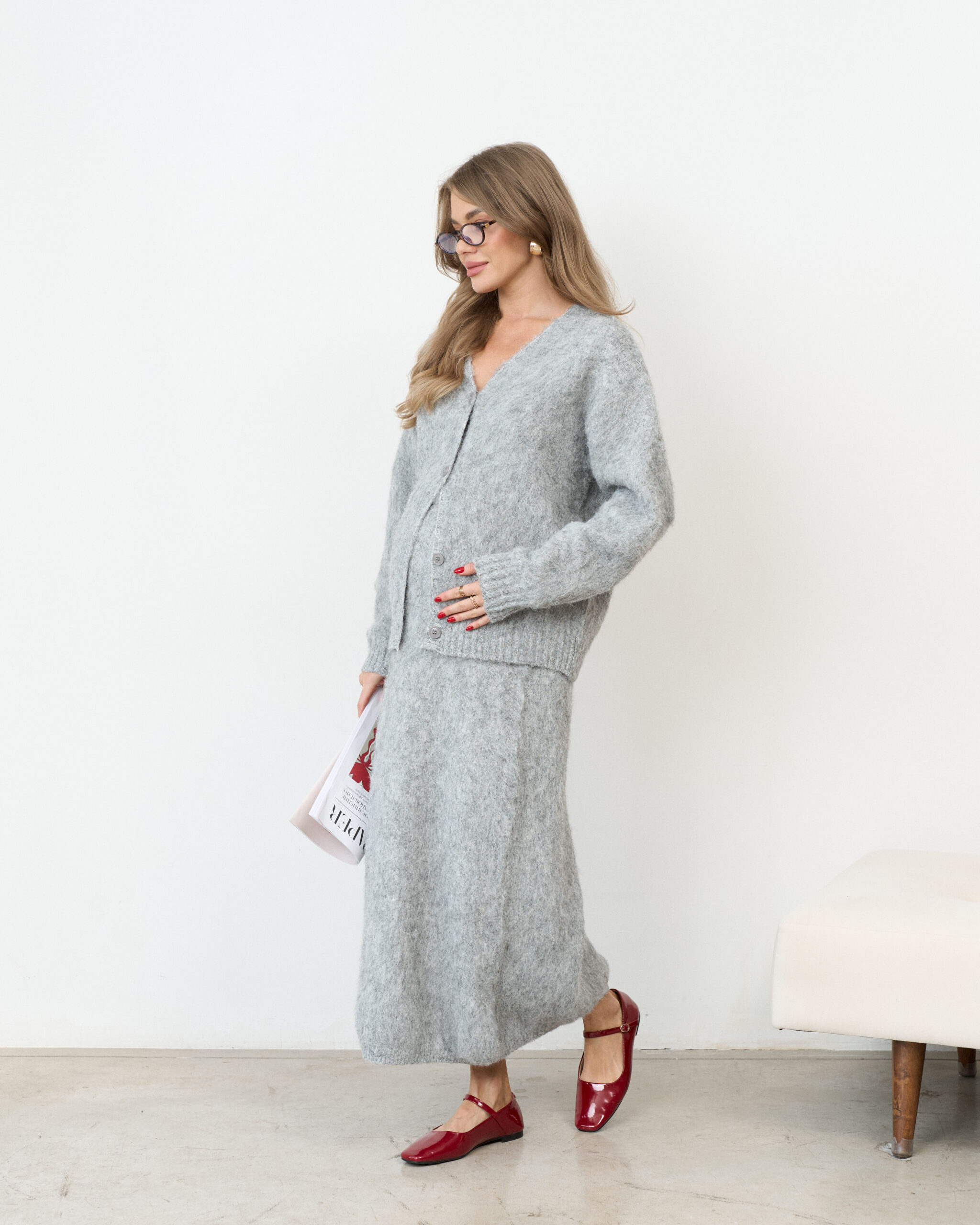 Стильный трикотажный комплект из пушистой пряжи, состоящий из юбки кроя трапеция и актуального кардигана на пуговицах. Модный фасон стройнит и визуально вытягивает фигуру. Подойдет на период беременности и после.