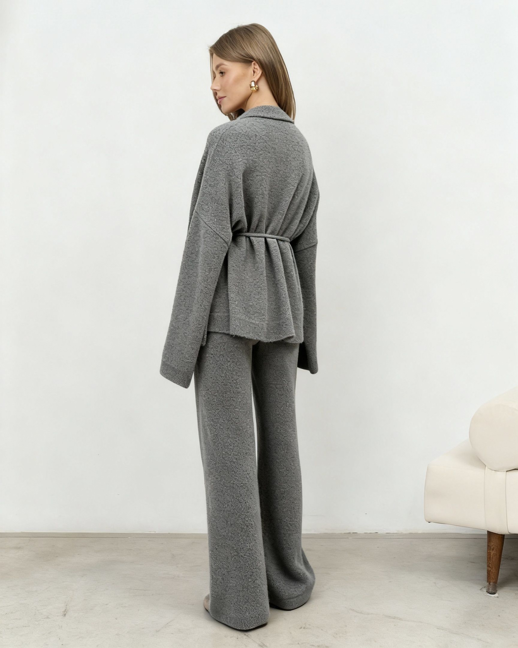 Стильный трикотажный костюм, состоящий из брюк свободного кроя и кардигана-кимоно. Модный фасон стройнит и визуально вытягивает фигуру. Подойдет на весь период беременности и после.