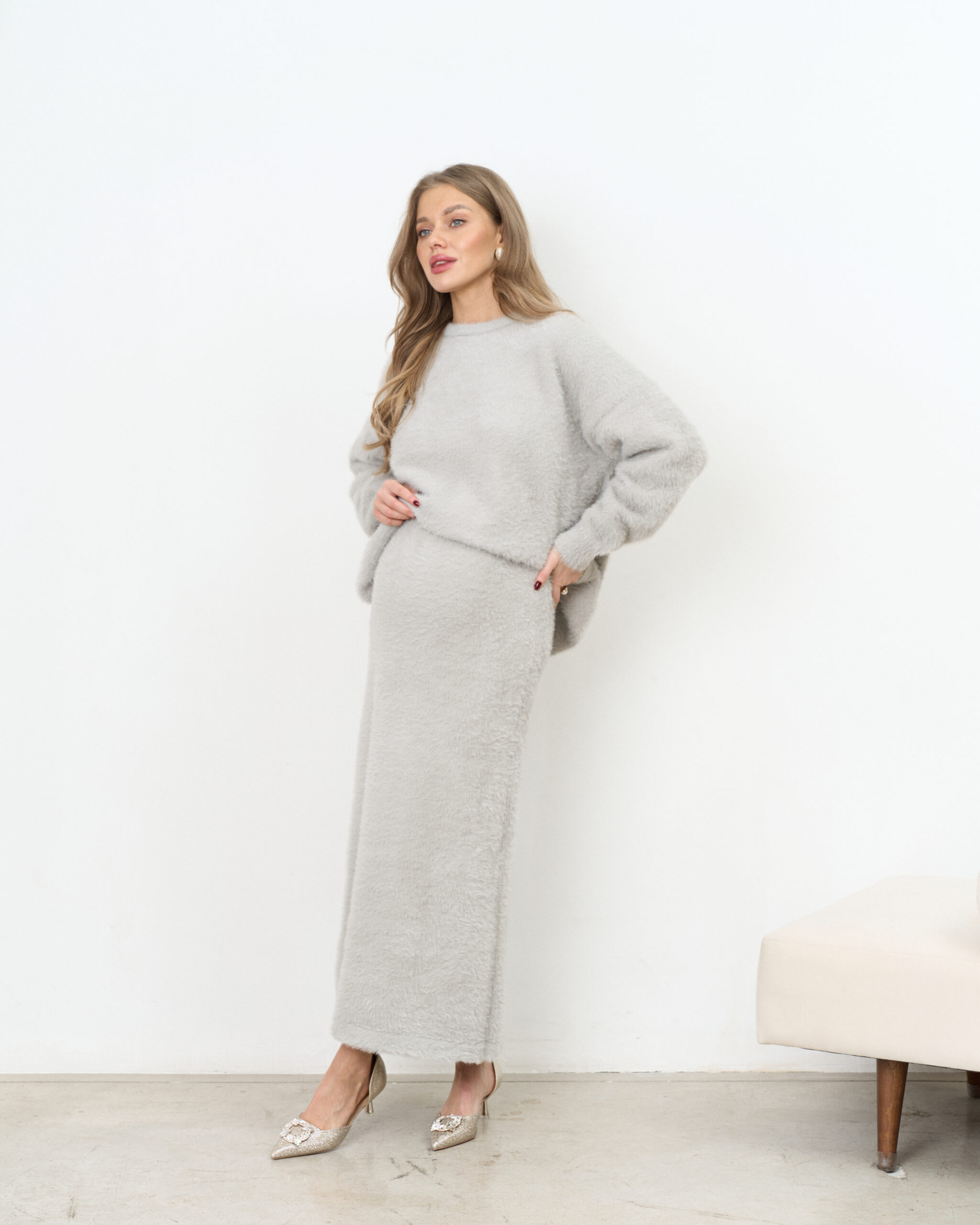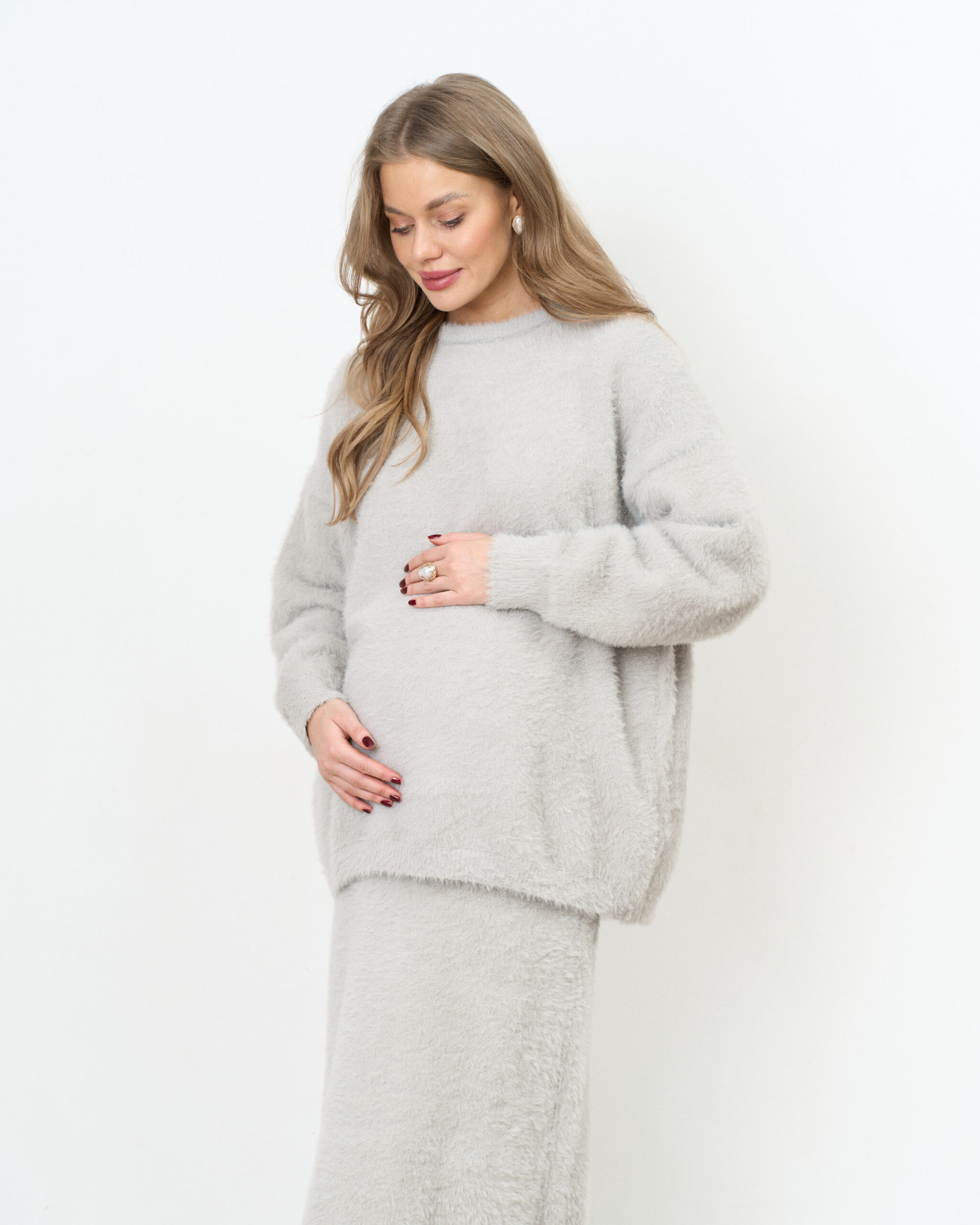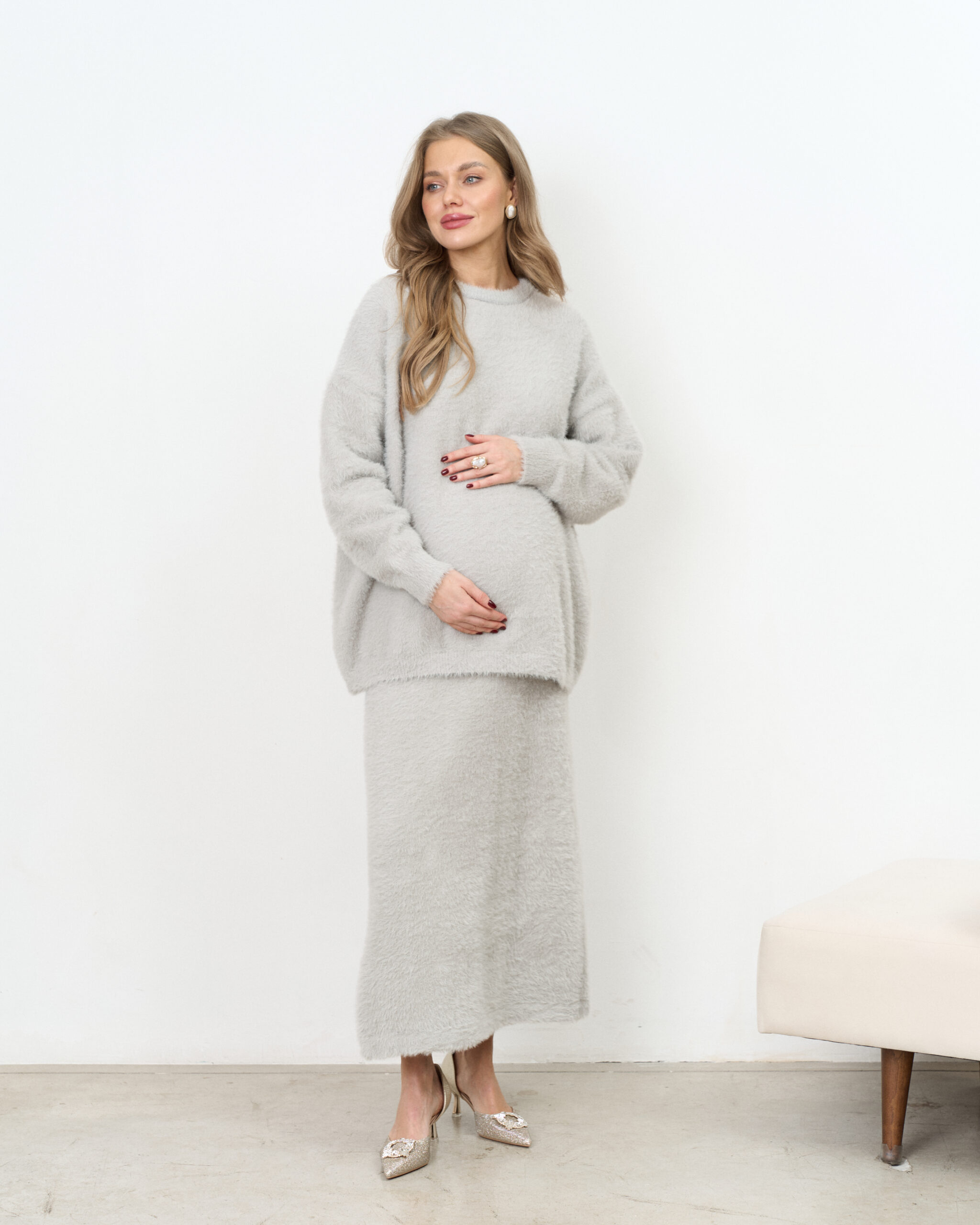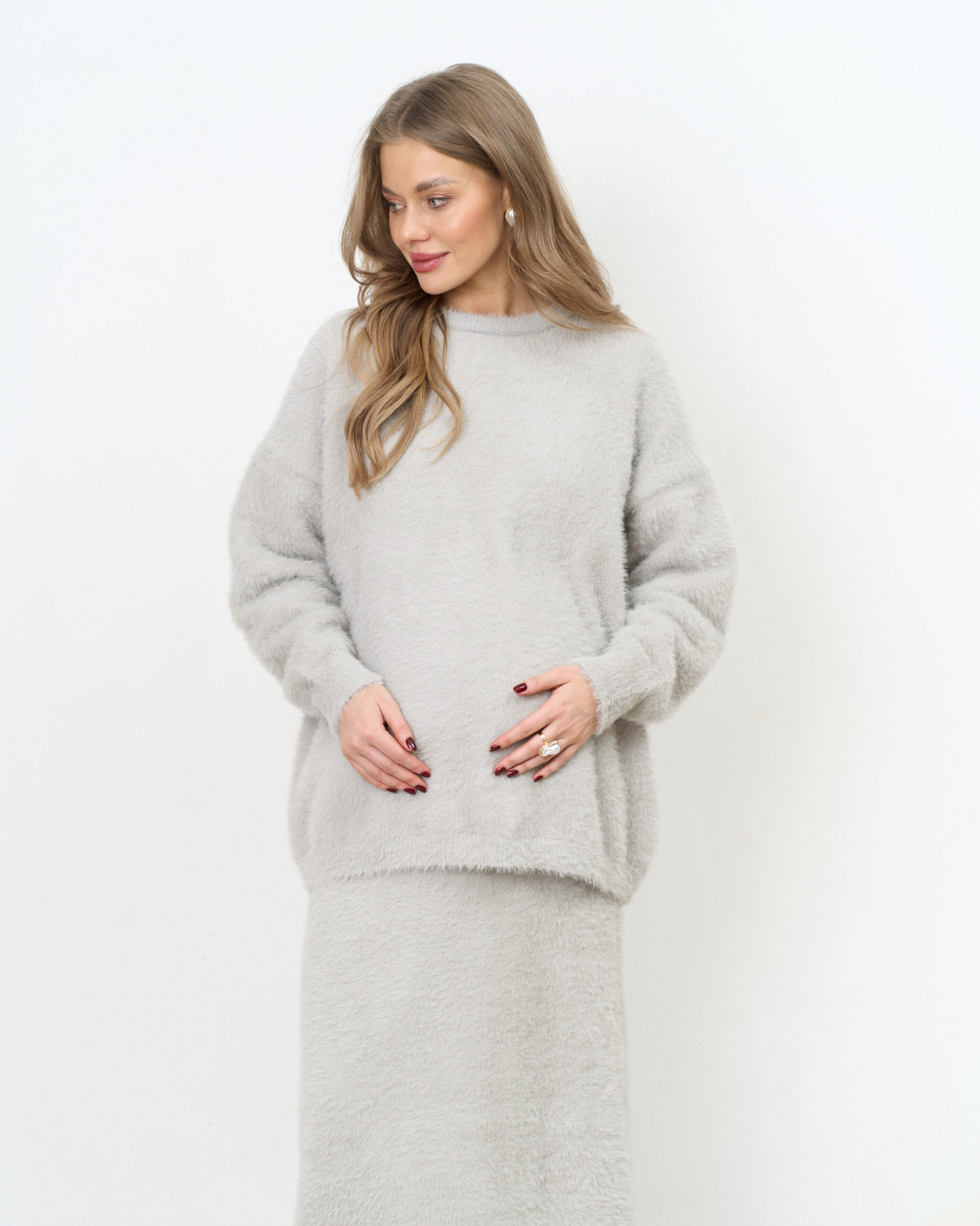 Стильный трикотажный комплект из пушистой пряжи, состоящий из макси-юбки прямого кроя и базового джемпера. Модный фасон стройнит и визуально вытягивает фигуру. Подойдет на период беременности и после.
