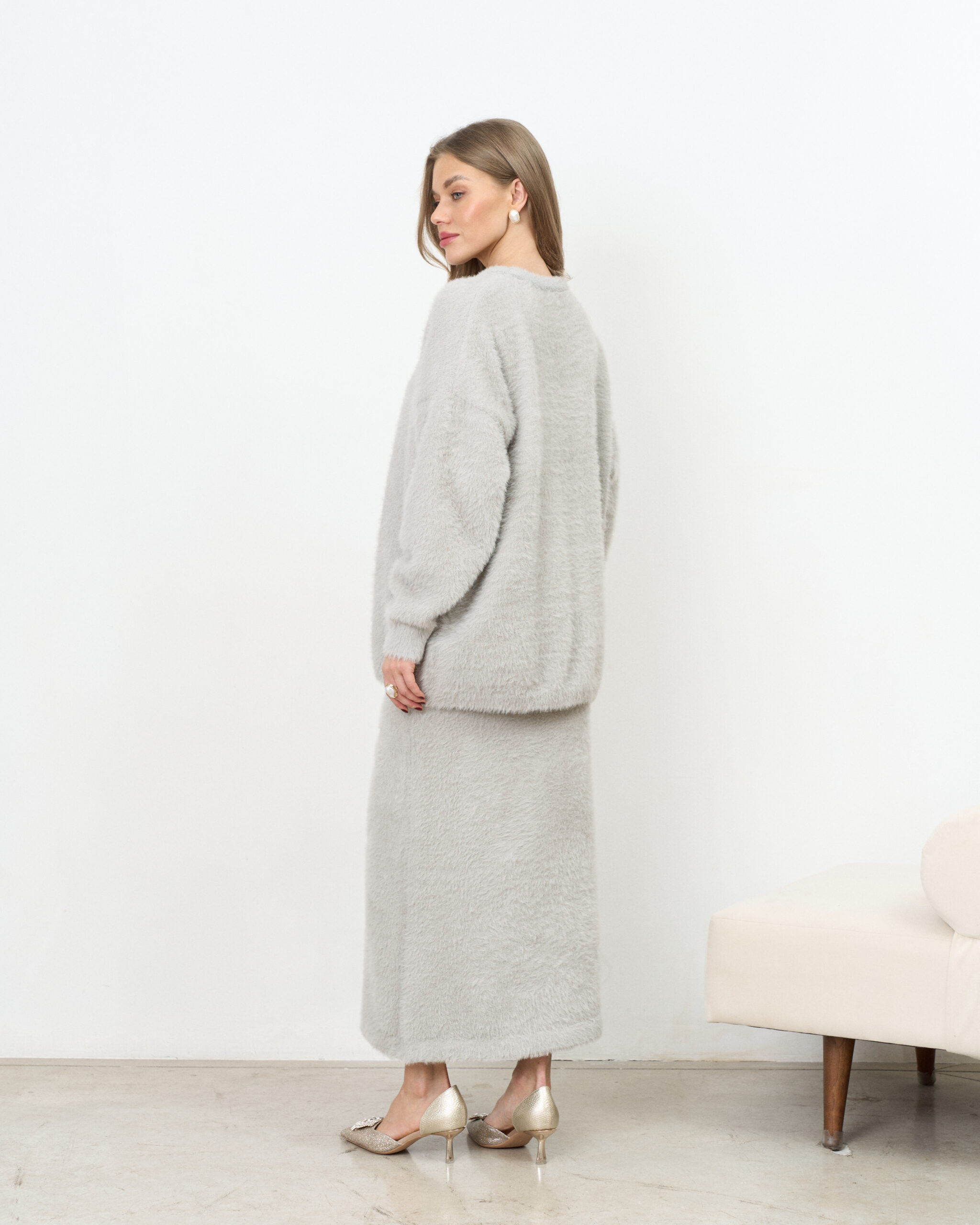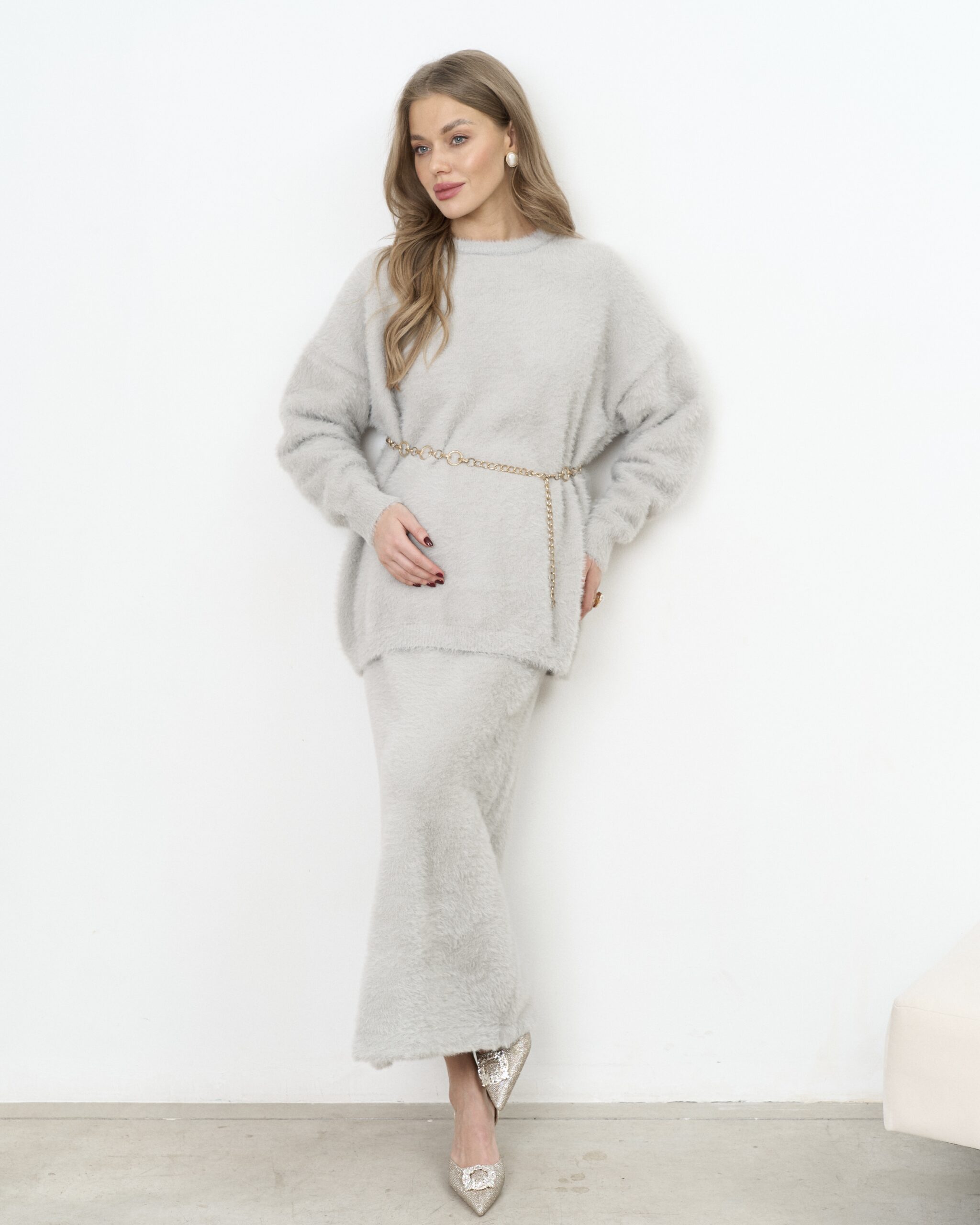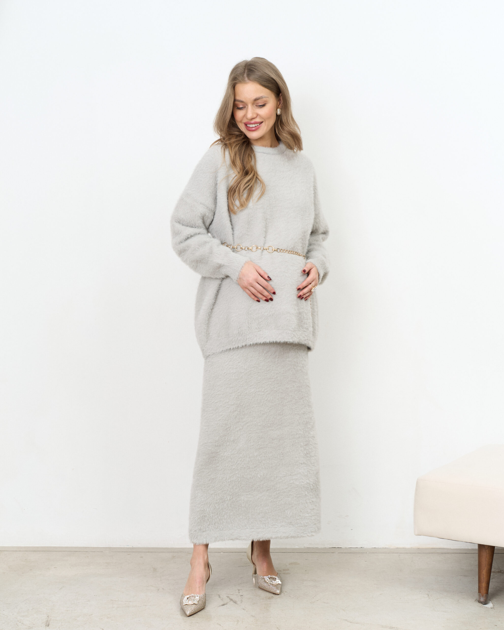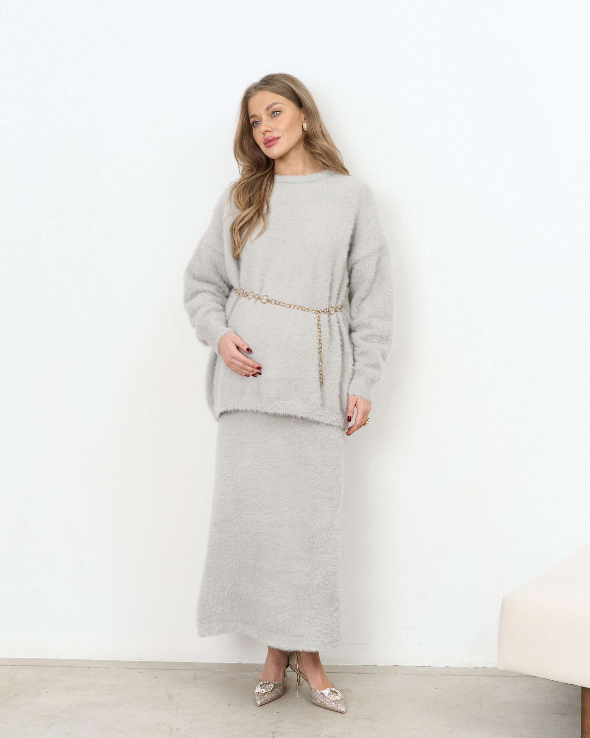 Стильный трикотажный комплект из пушистой пряжи, состоящий из макси-юбки прямого кроя и базового джемпера. Модный фасон стройнит и визуально вытягивает фигуру. Подойдет на период беременности и после.
