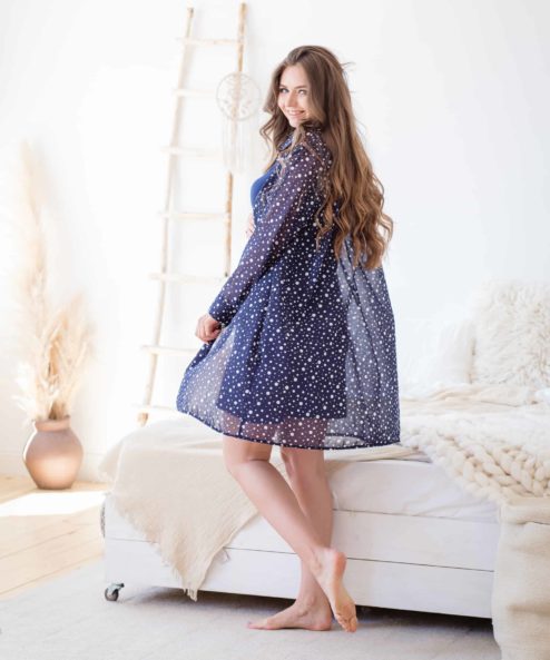 Стильное и практичное платье два в одном. Верхняя часть — шифоновое платье-рубашка, нижняя — платье-майка с секретом для кормления малыша. Платье замечательно сидит на любом сроке беременности и после, в комплект входит пояс.  Обе части платья можно носить по отдельности, либо вместе, создавая разные образы для разных случаев. Носите его с кедами, создавая спортивный стиль, с туфлями — для выхода в свет, ходите в нижнем платье дома. Будьте неотразимы в любой ситуации!