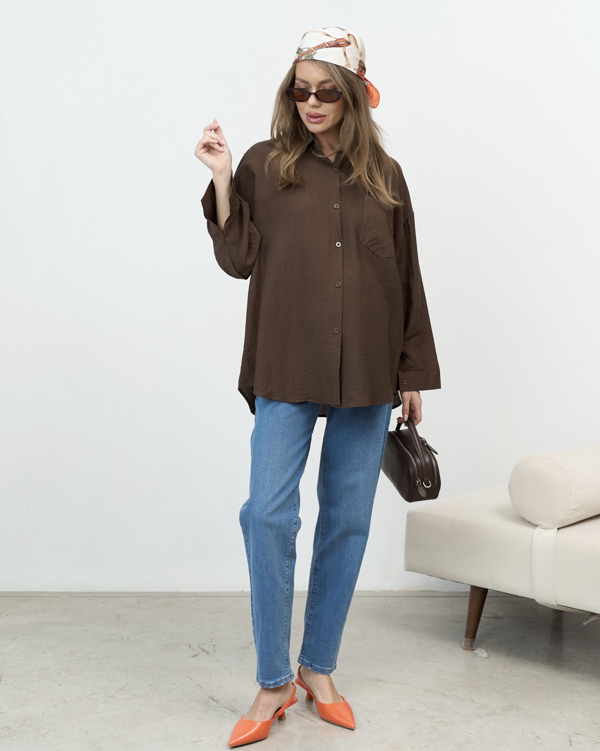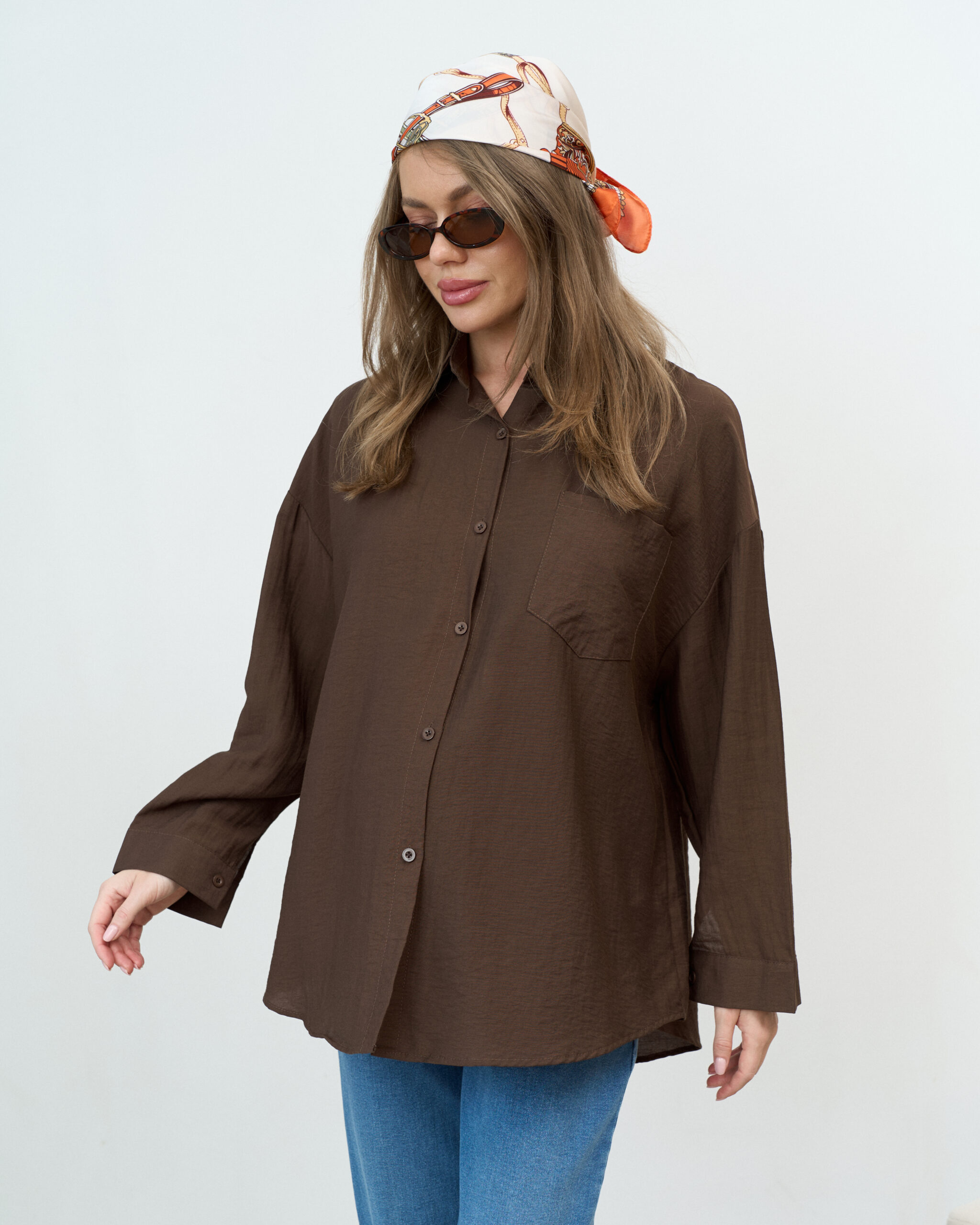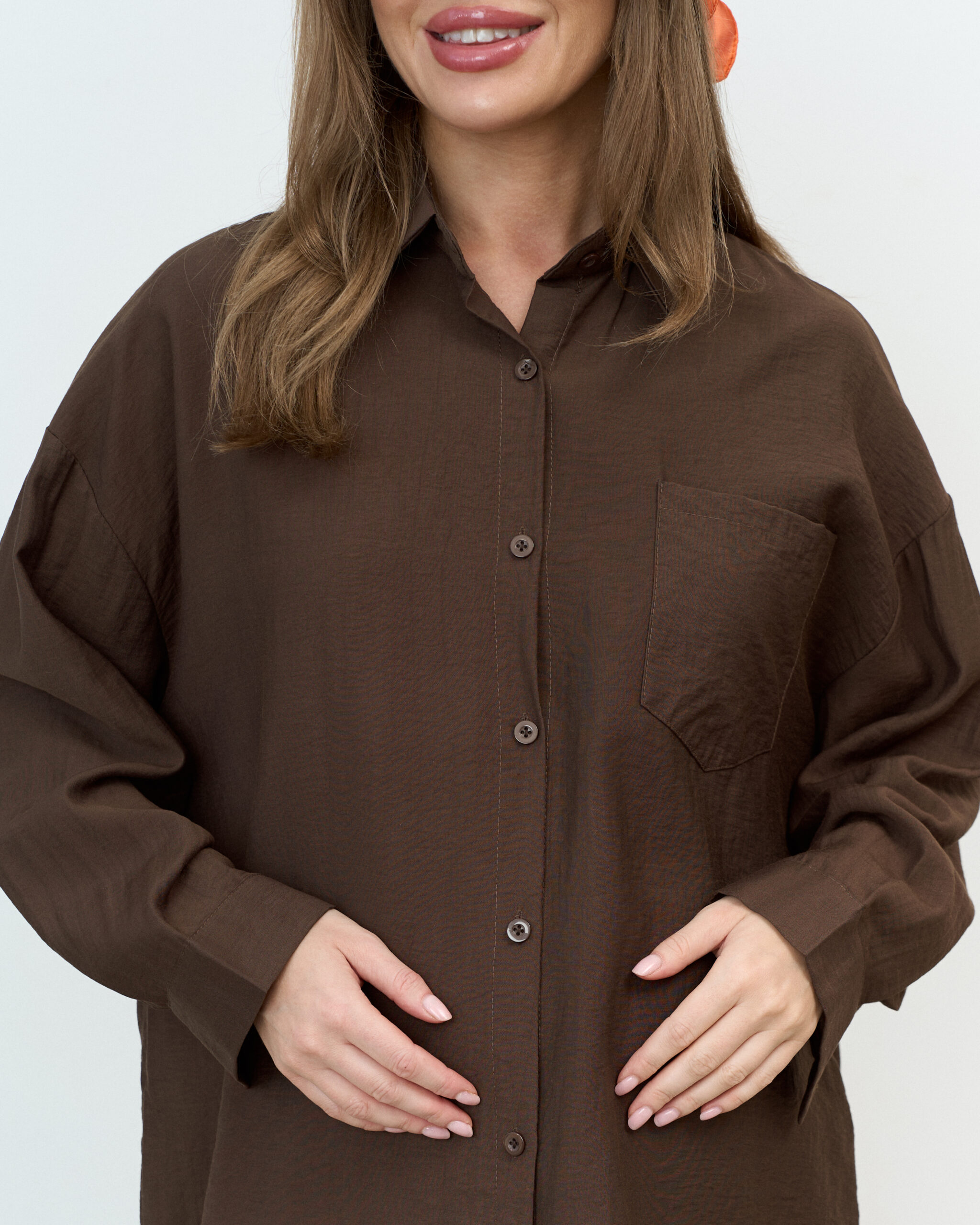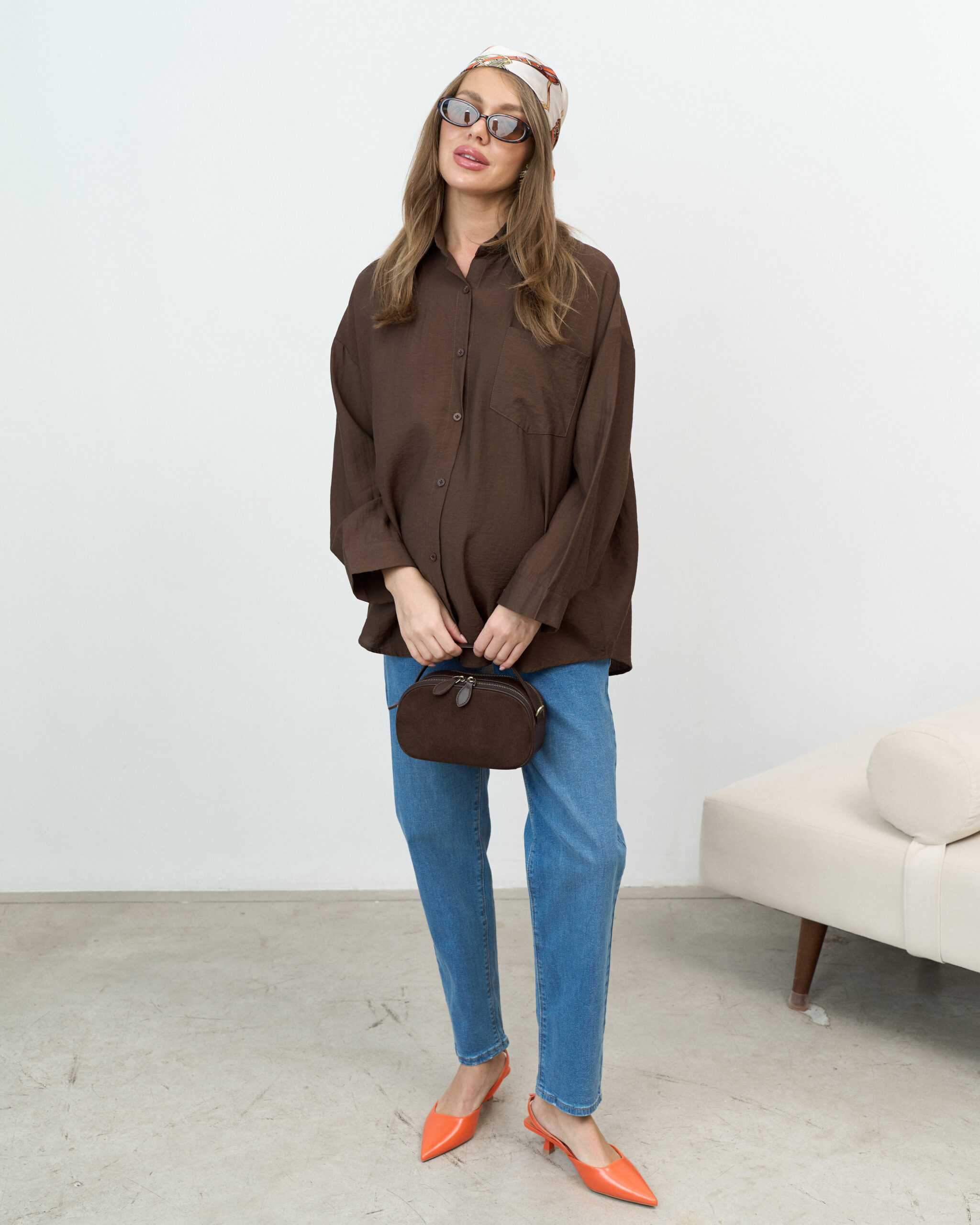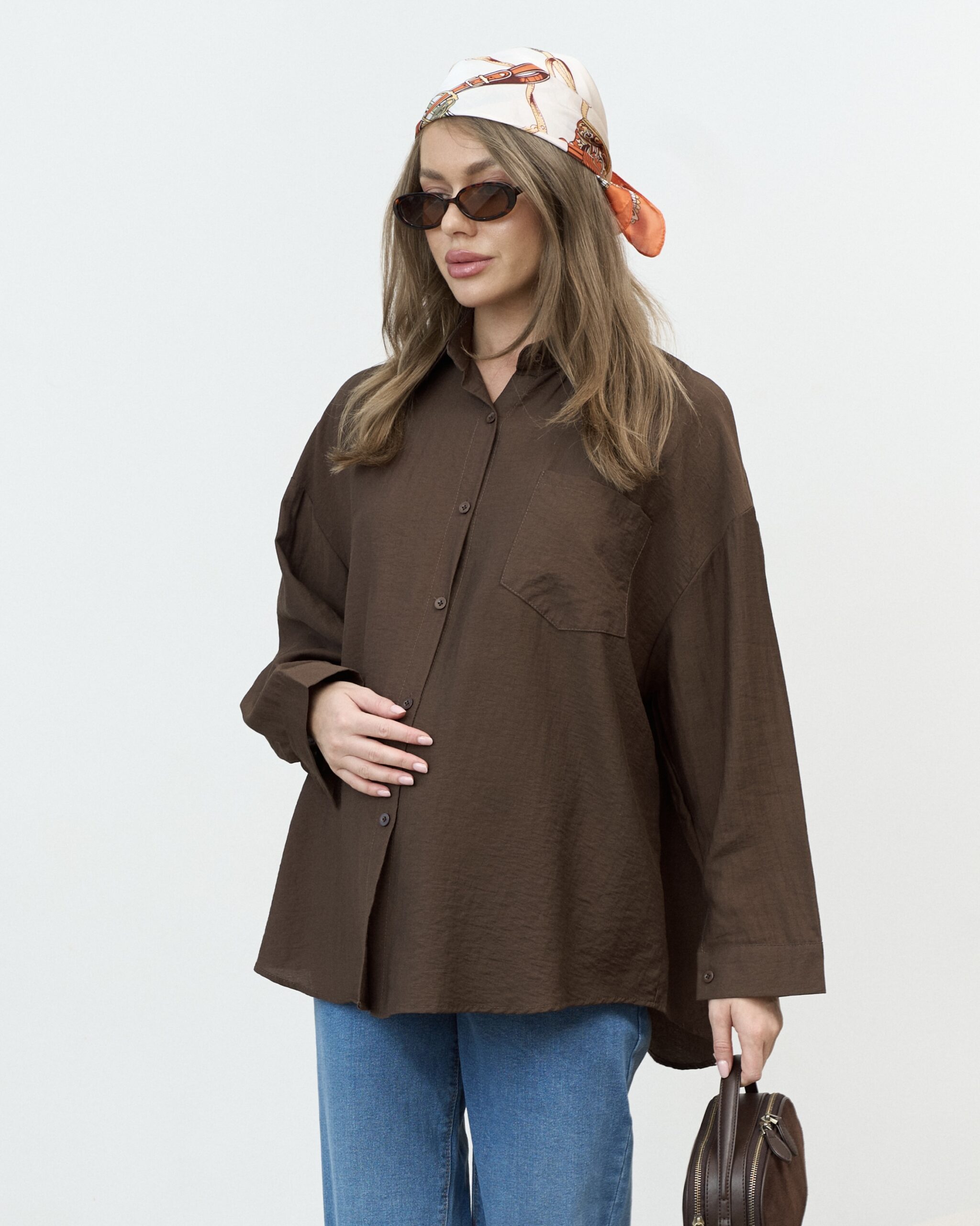 Стильная удлиненная рубашка оверсайз для беременных и кормящих мам. Для кормления пуговицы расстегиваются.