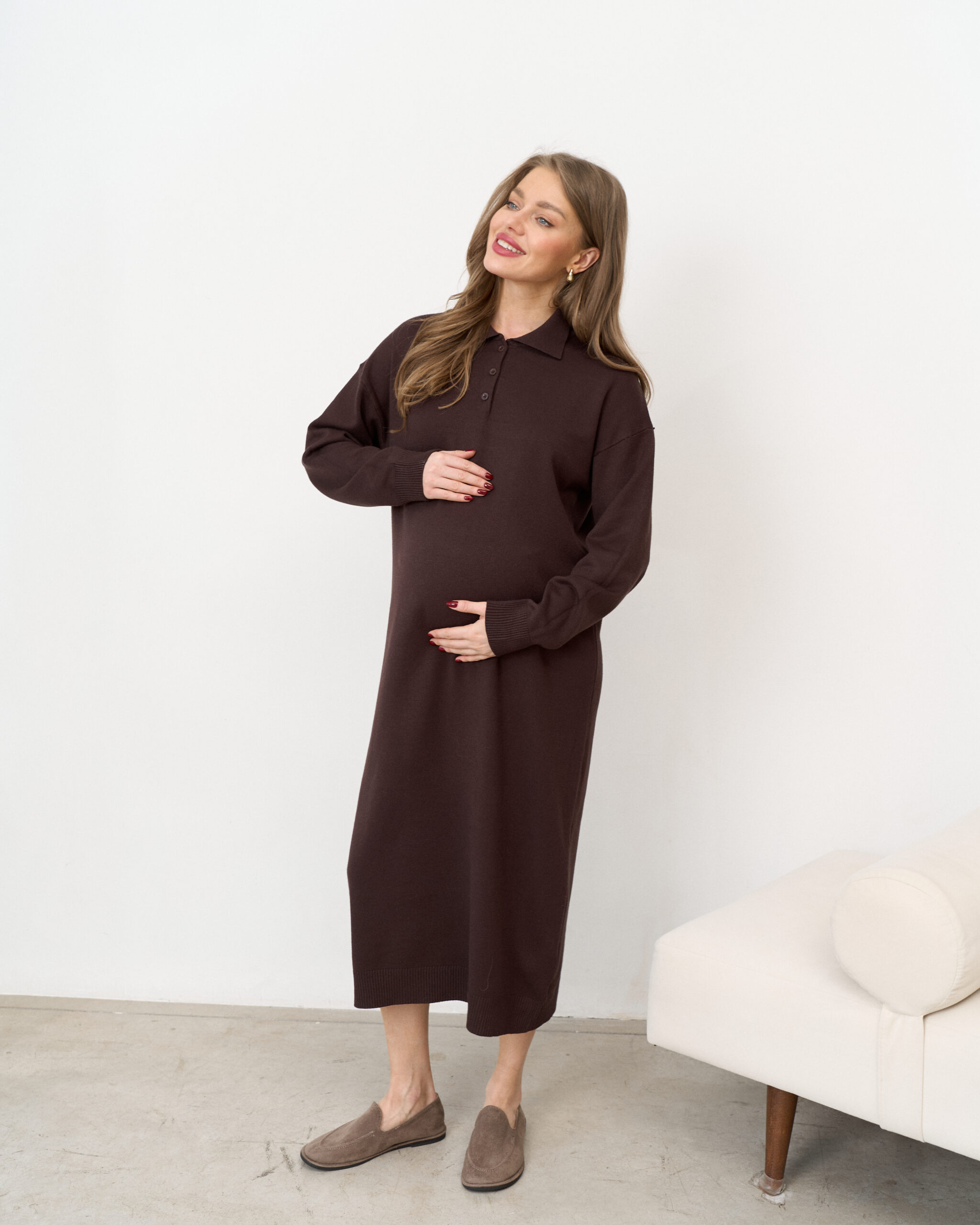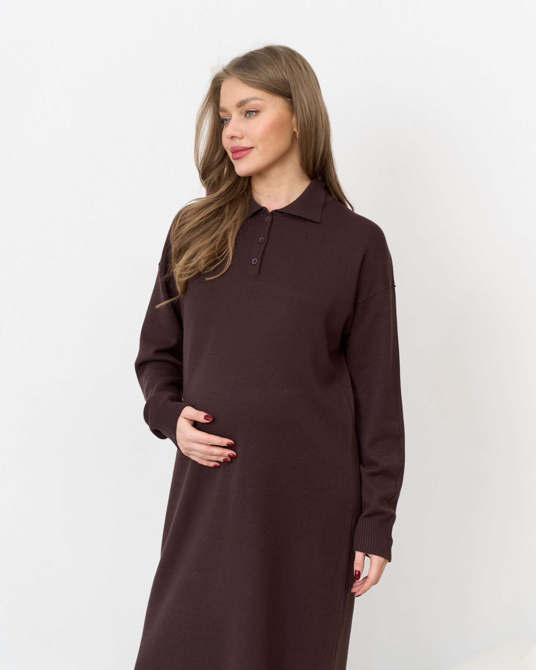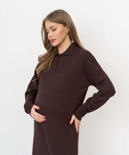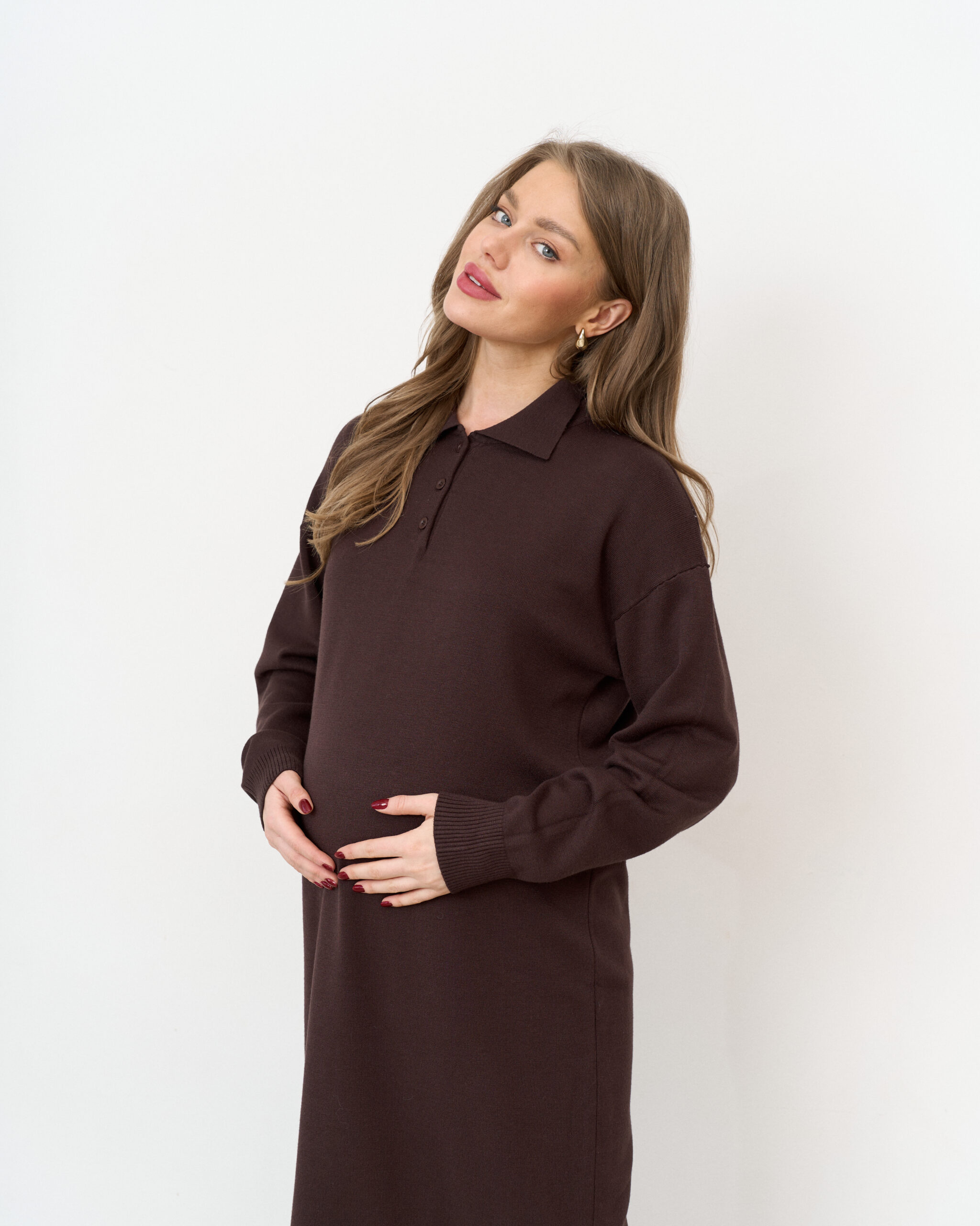 Платье для беременных из вязаного хлопкового трикотажа. Свободный силуэт, универсальная длина и трендовый оттенок обеспечат вам комфорт и стильный внешний вид.