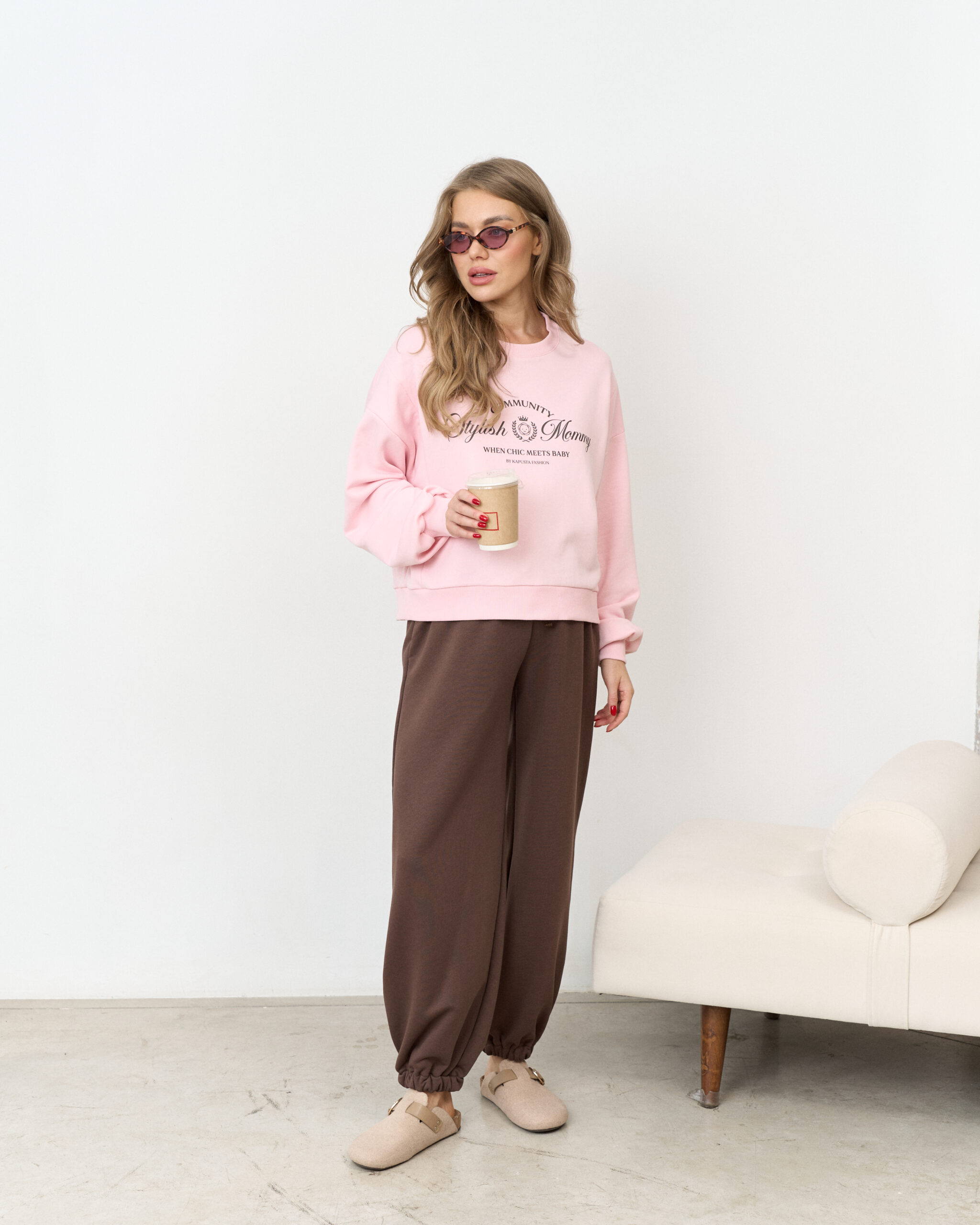 Брюки-джоггеры кроя оверсайз для будущих и кормящих мам, выполненные из футера высшего качества «пенье». В поясе шнурок для регулировки объема. Внизу — мягкие резинки.