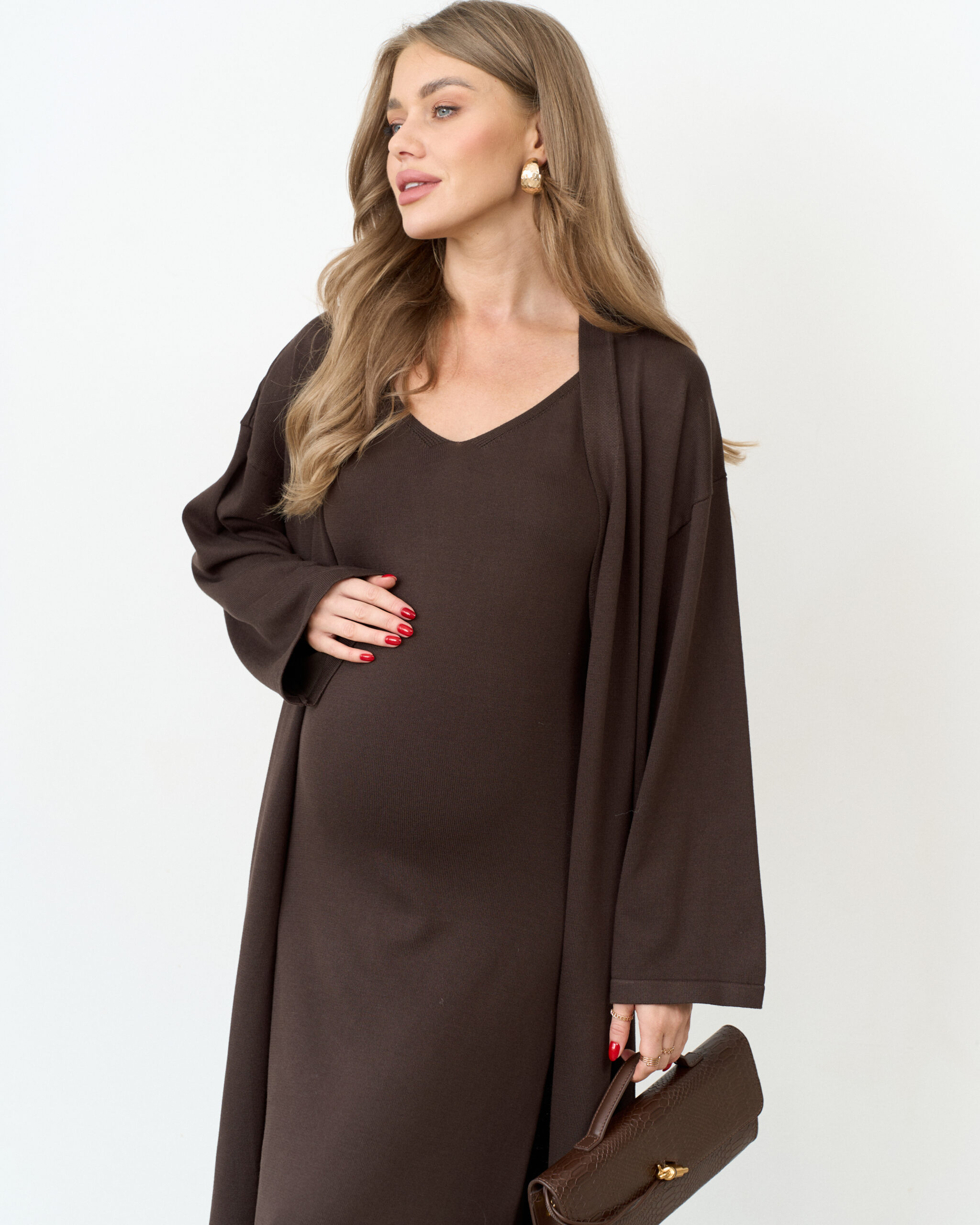 Стильный трикотажный комплект, состоящий из платья в длине макси на бретелях и свободного кардигана. Модный фасон стройнит и визуально вытягивает фигуру.