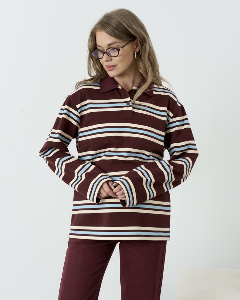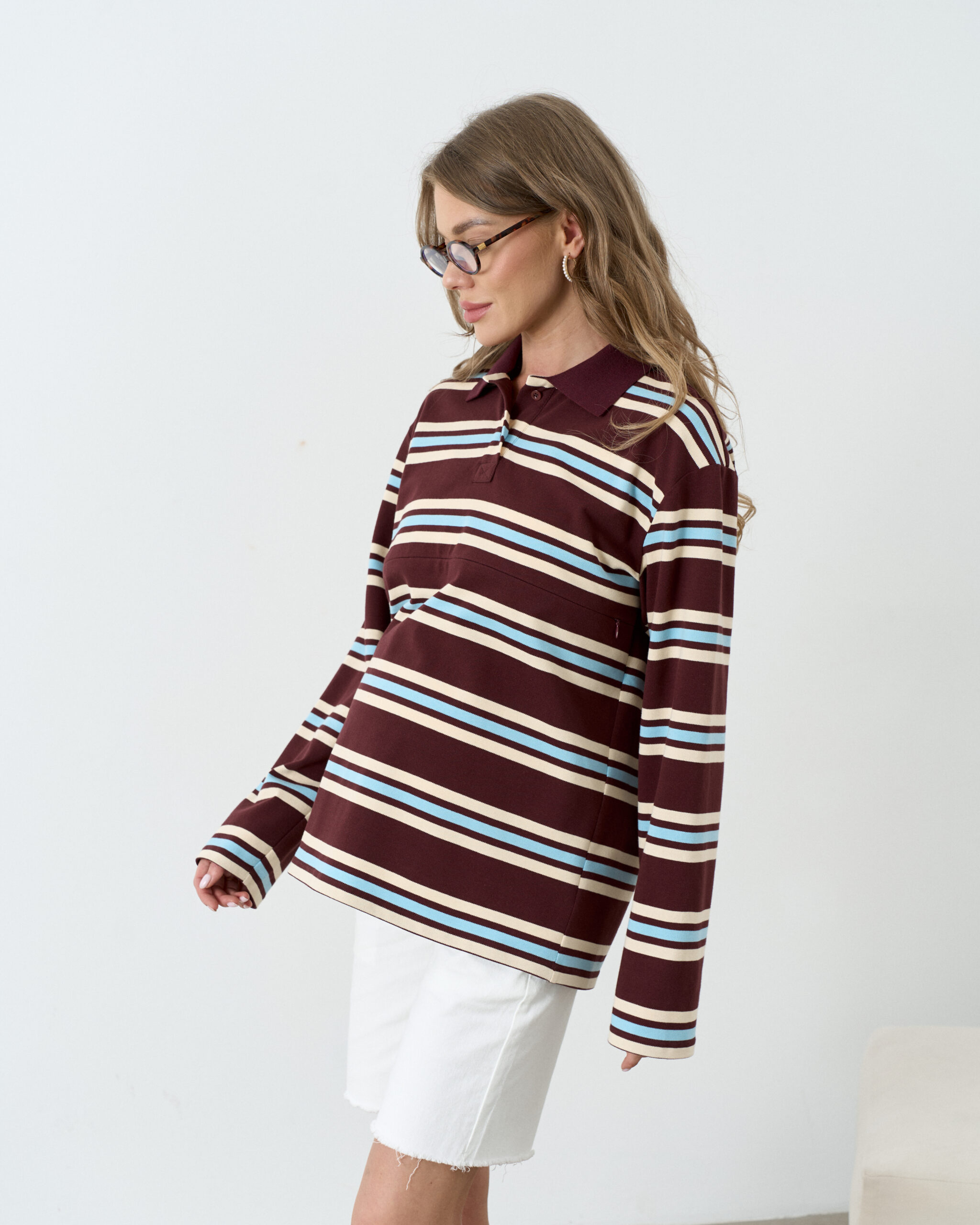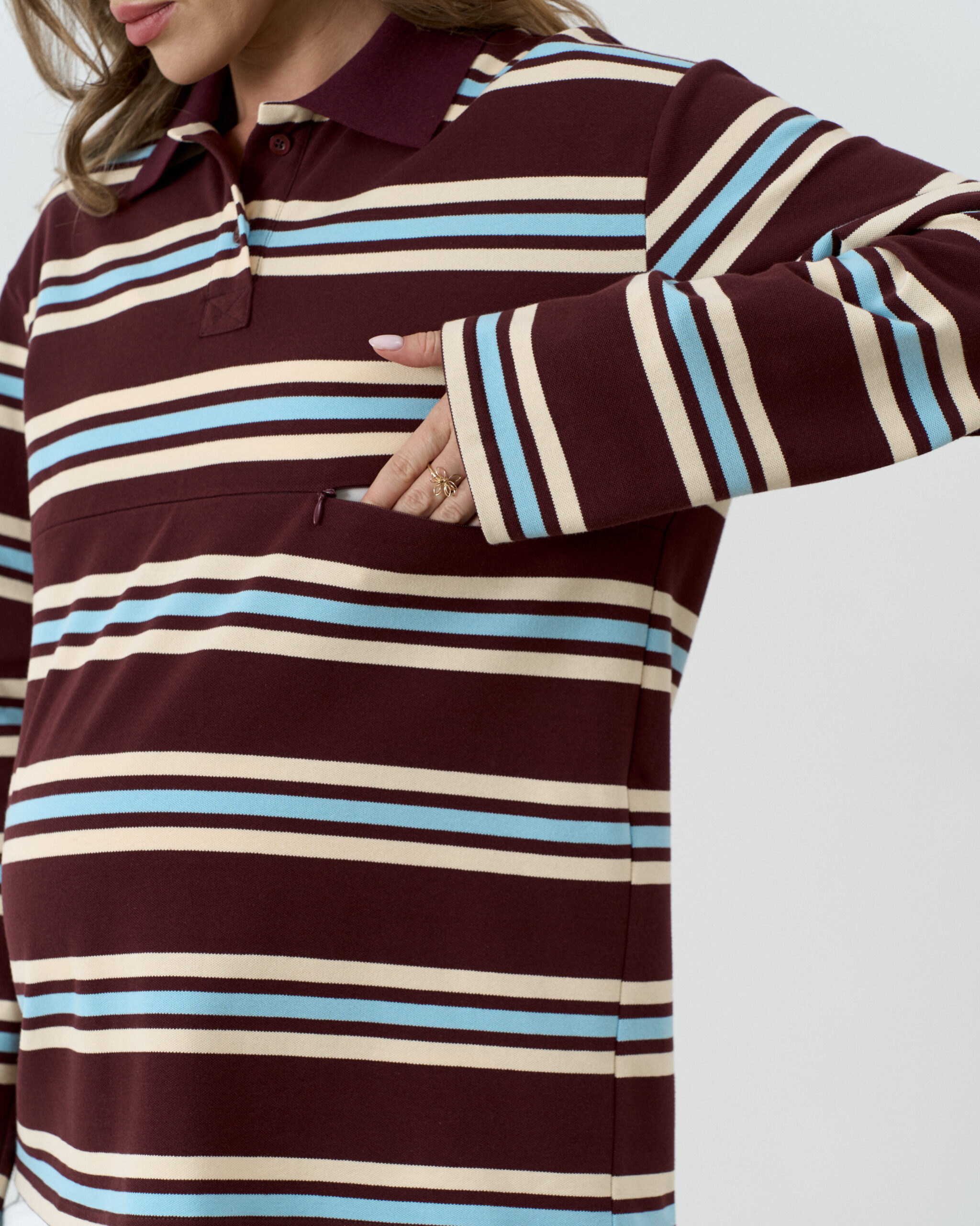 Футболка-поло актуального кроя оверсайз из хлопкового трикотажа в трендовую полоску. Подойдет для любого срока беременности и после. Для кормления малыша выполнена удобная горизонтальная молния.